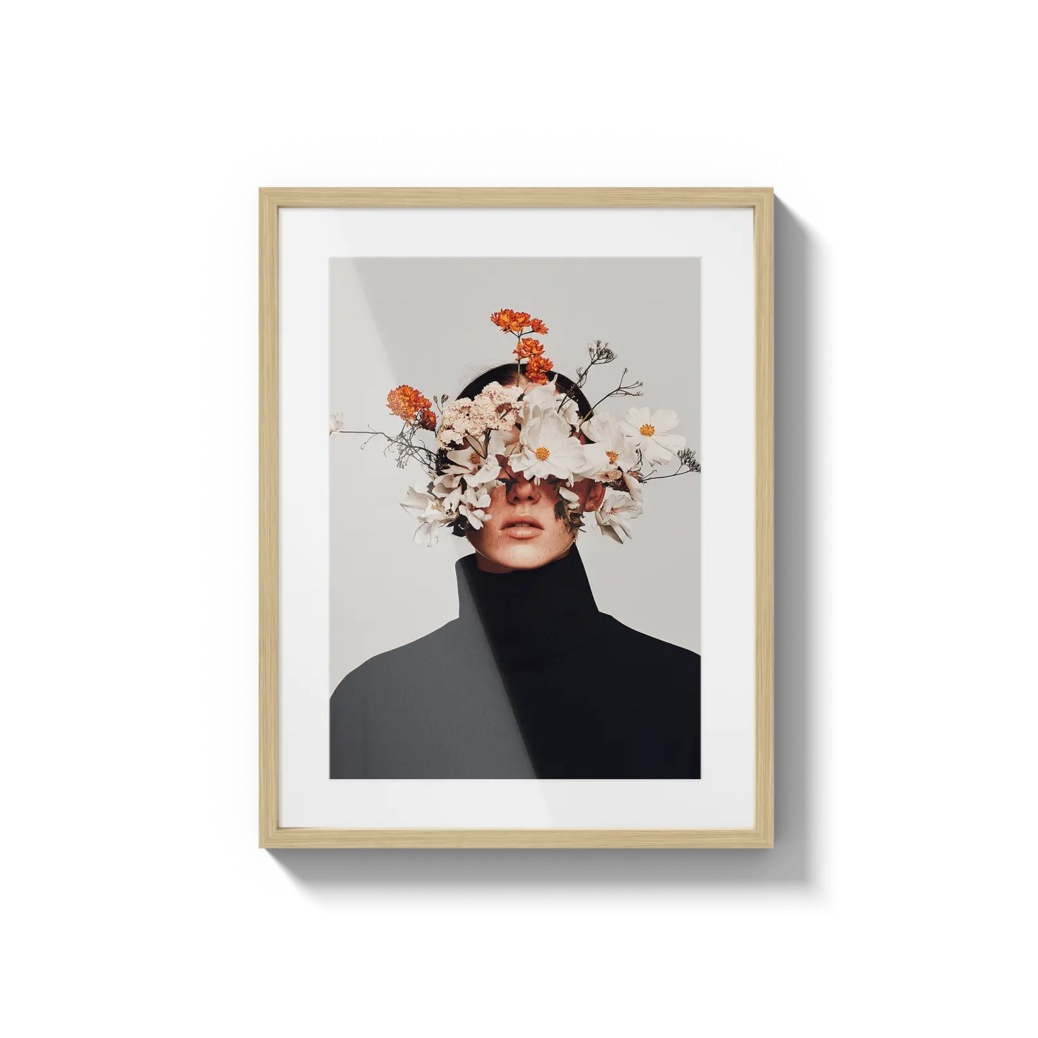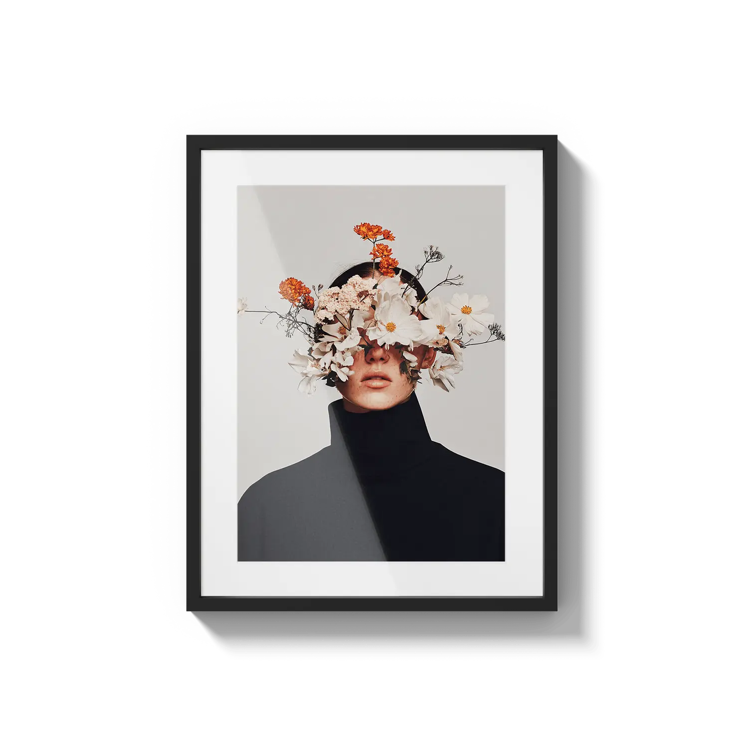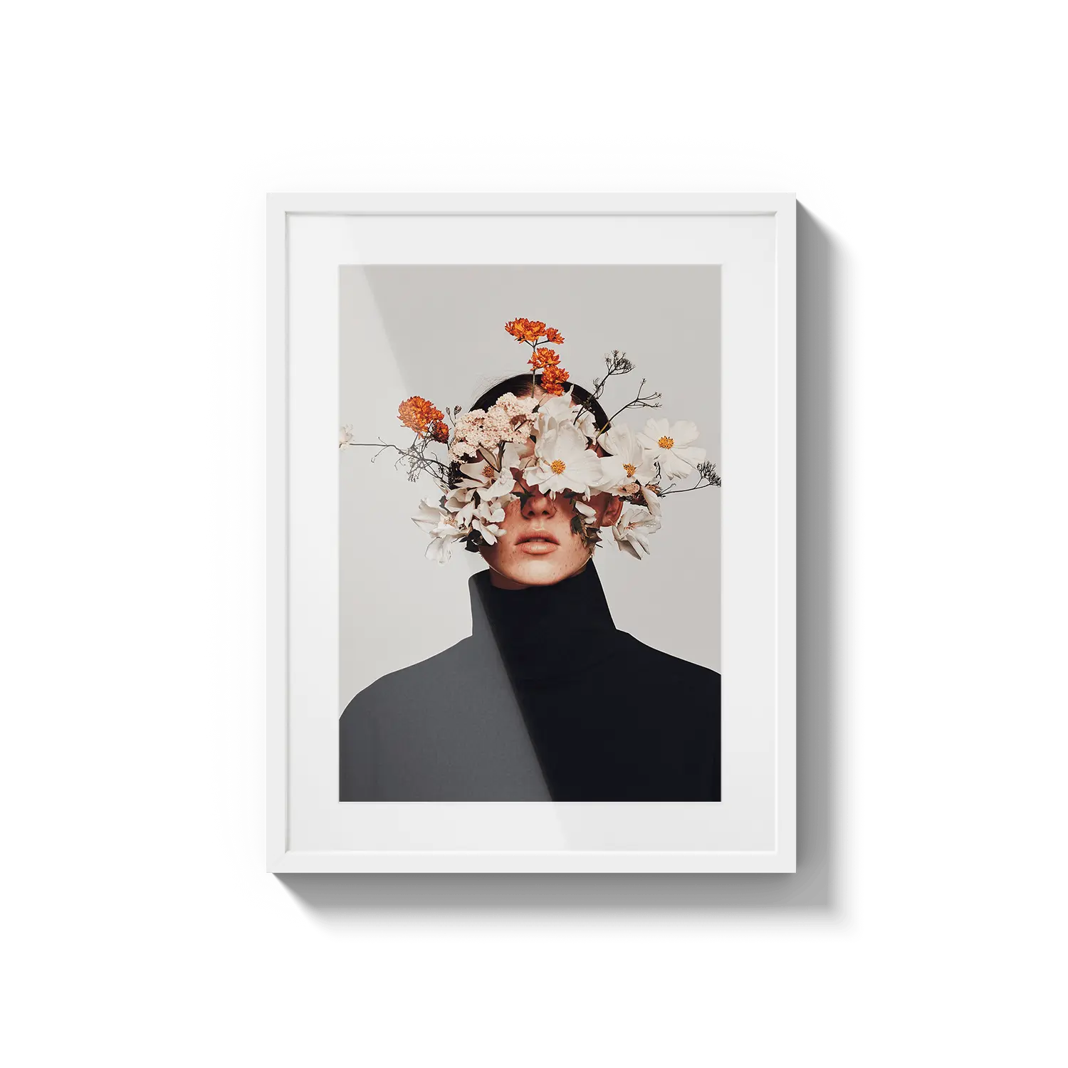 Un portrait serein où les fleurs s'épanouissent doucement autour du visage, mêlant immobilité et imagination. Un cadeau tendre et expressif.