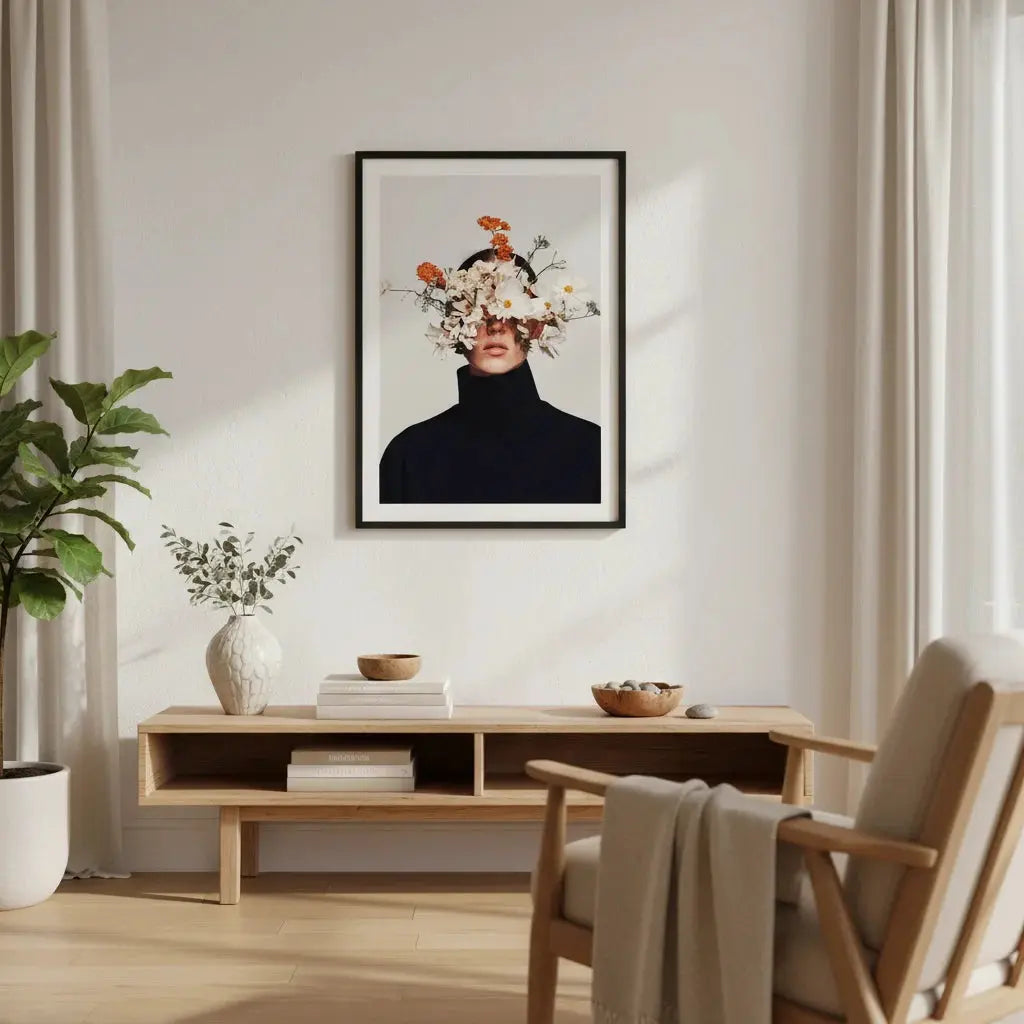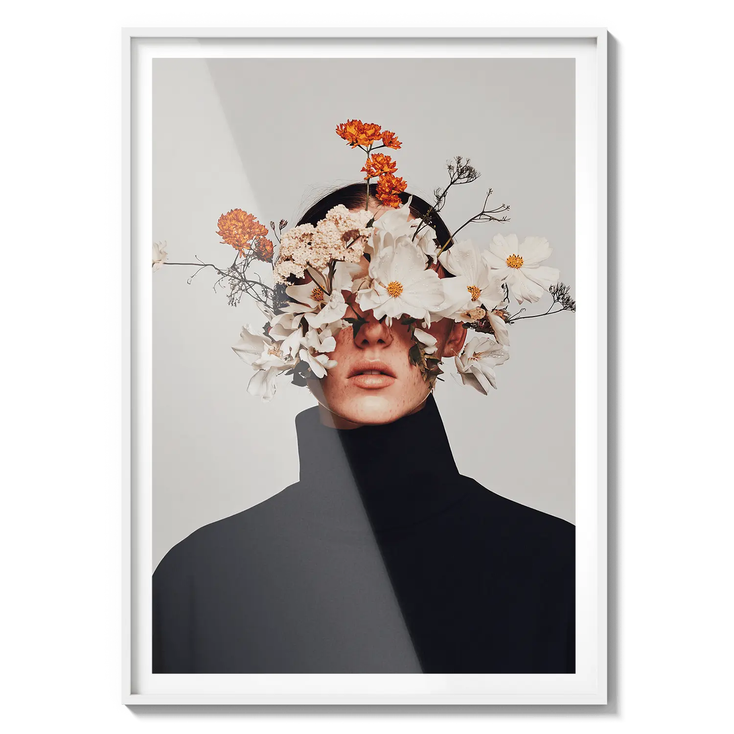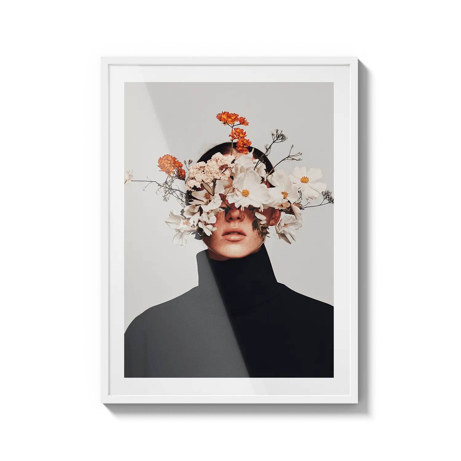 Un portrait serein où les fleurs s'épanouissent doucement autour du visage, mêlant immobilité et imagination. Un cadeau tendre et expressif.