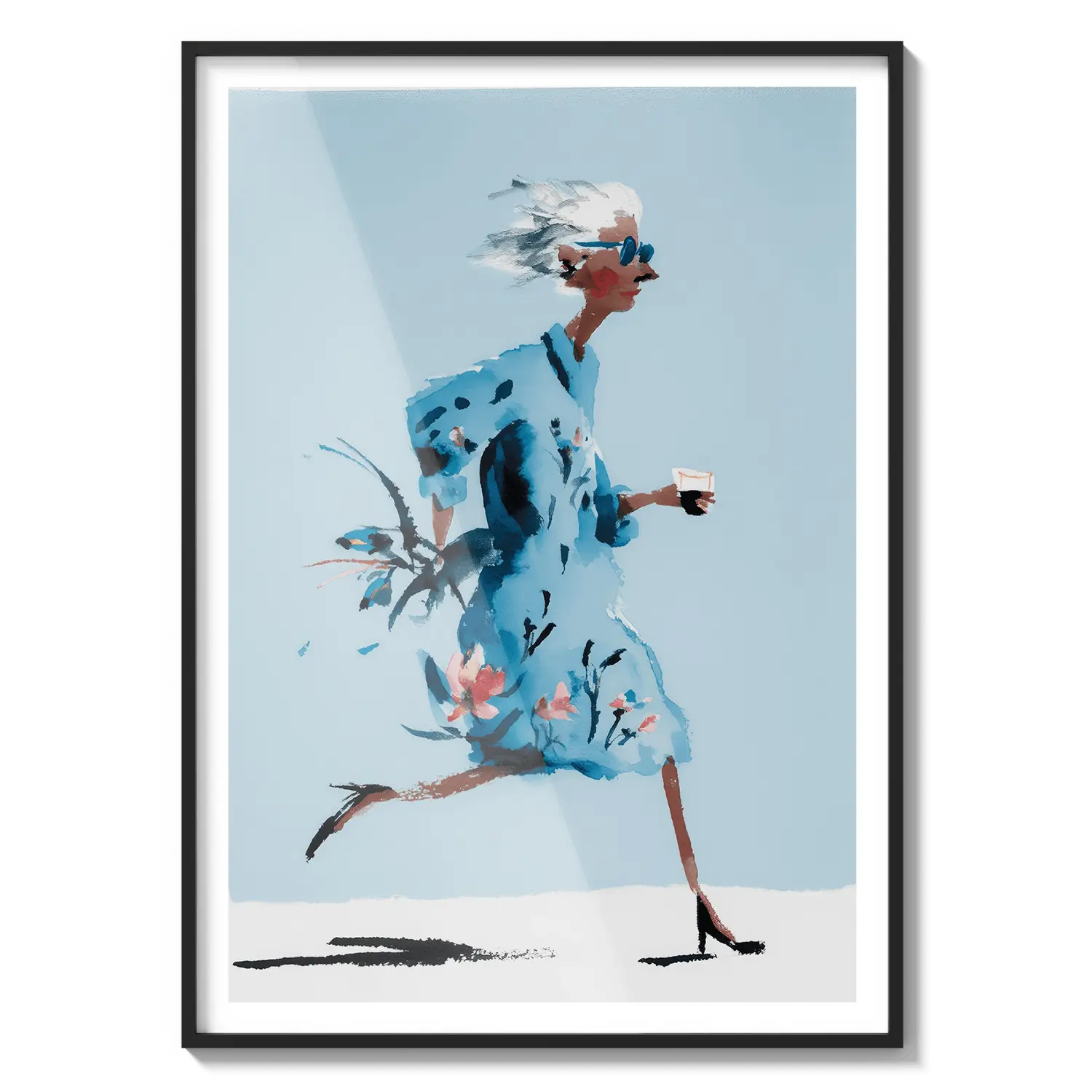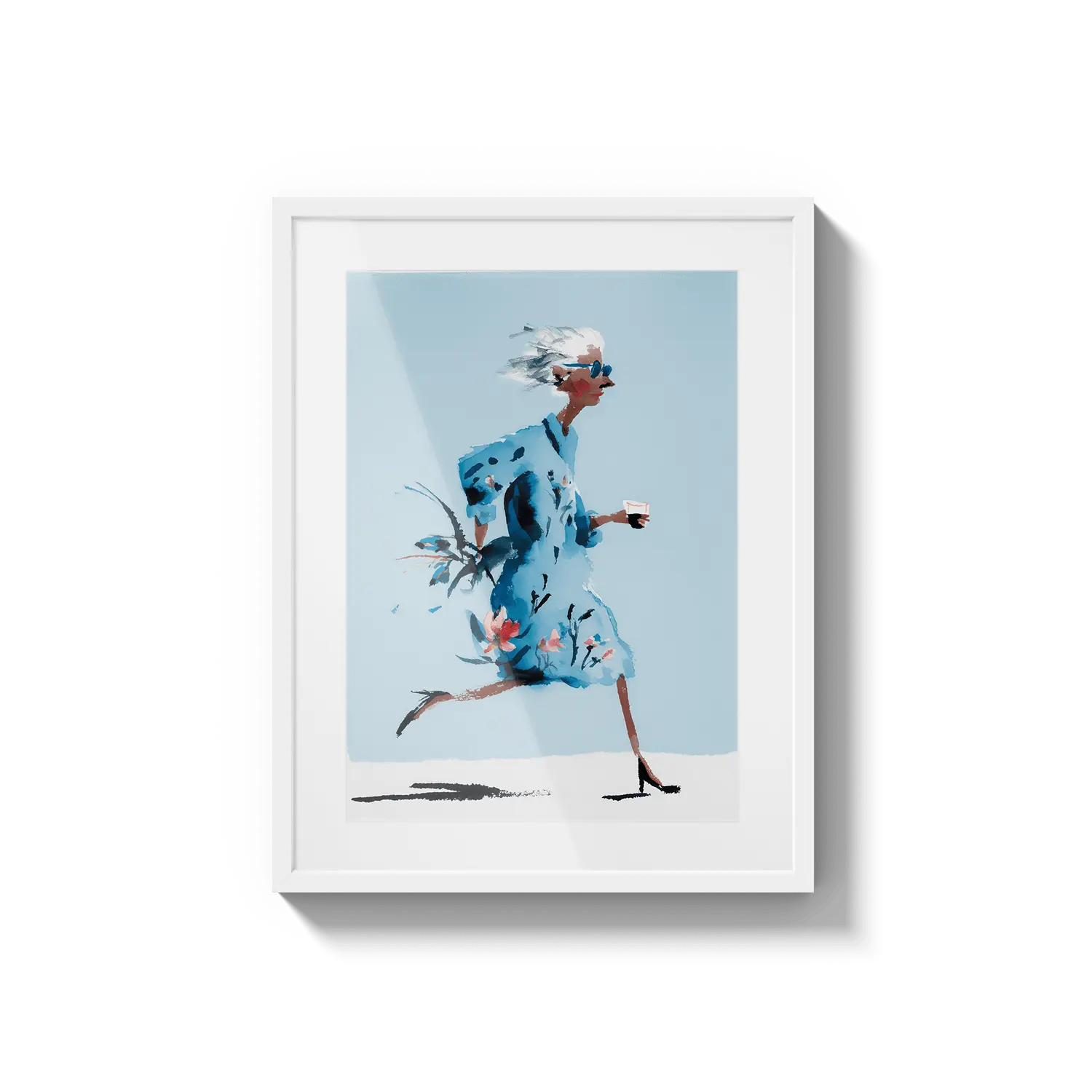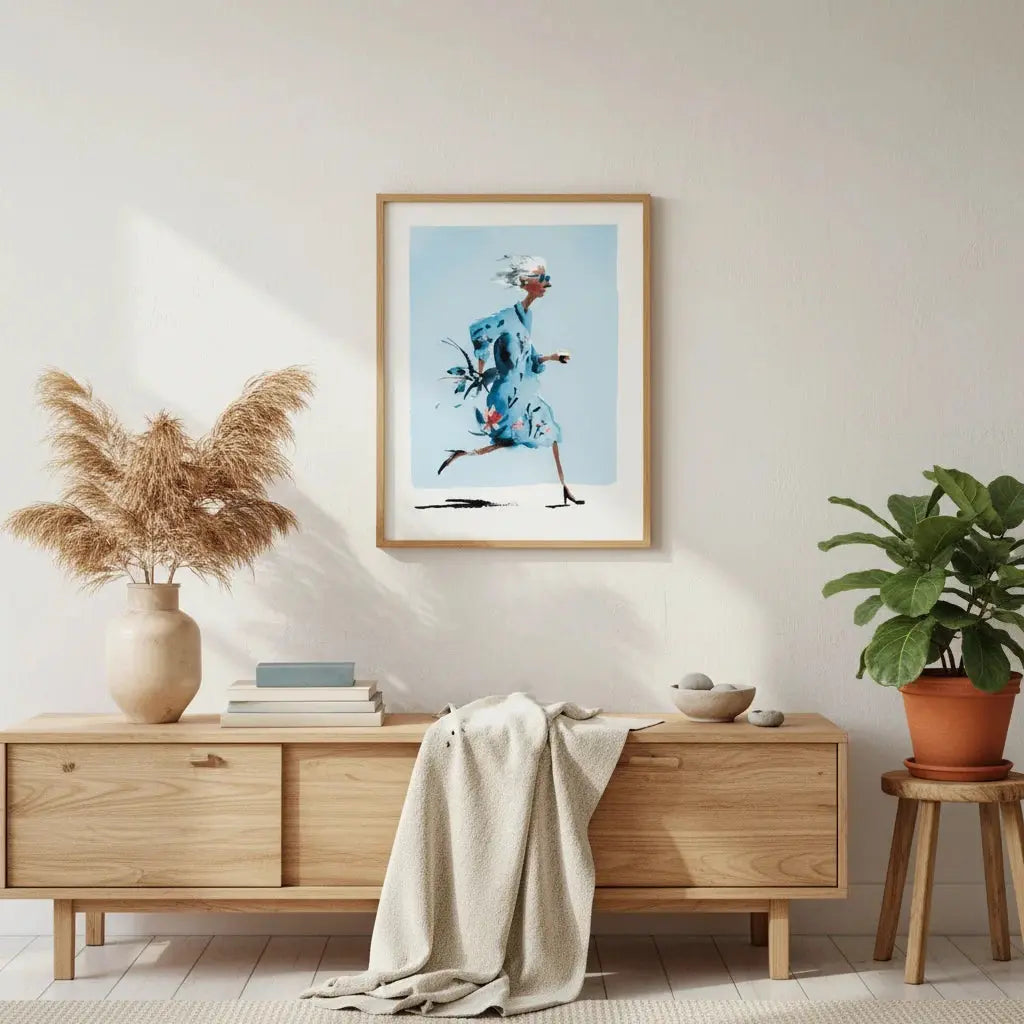 Une douce illustration d'une femme marchant à travers des tons bleus doux, évoquant la liberté et une confiance tranquille. Une œuvre d'art réfléchie à offrir à quelqu'un qui apprécie les moments calmes.