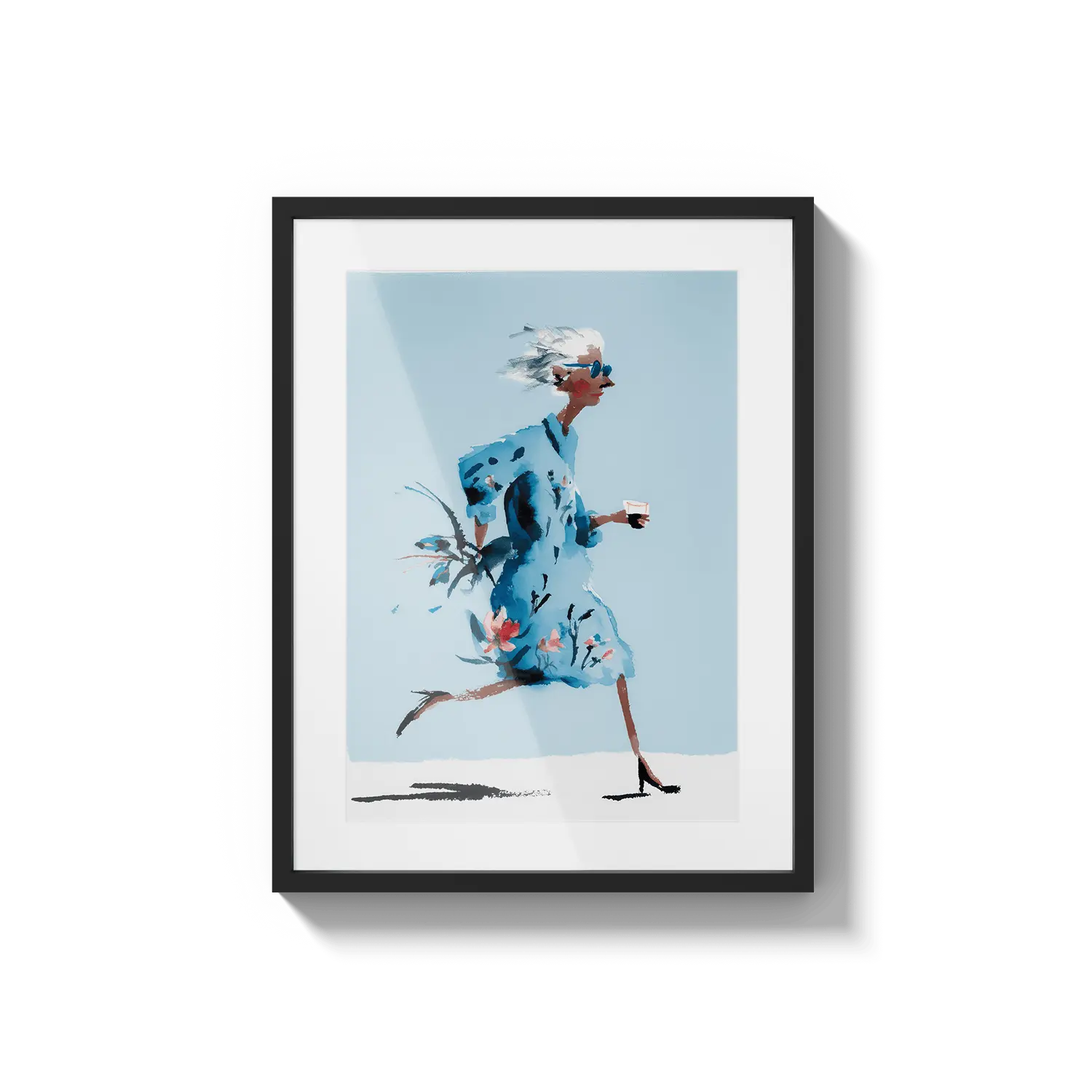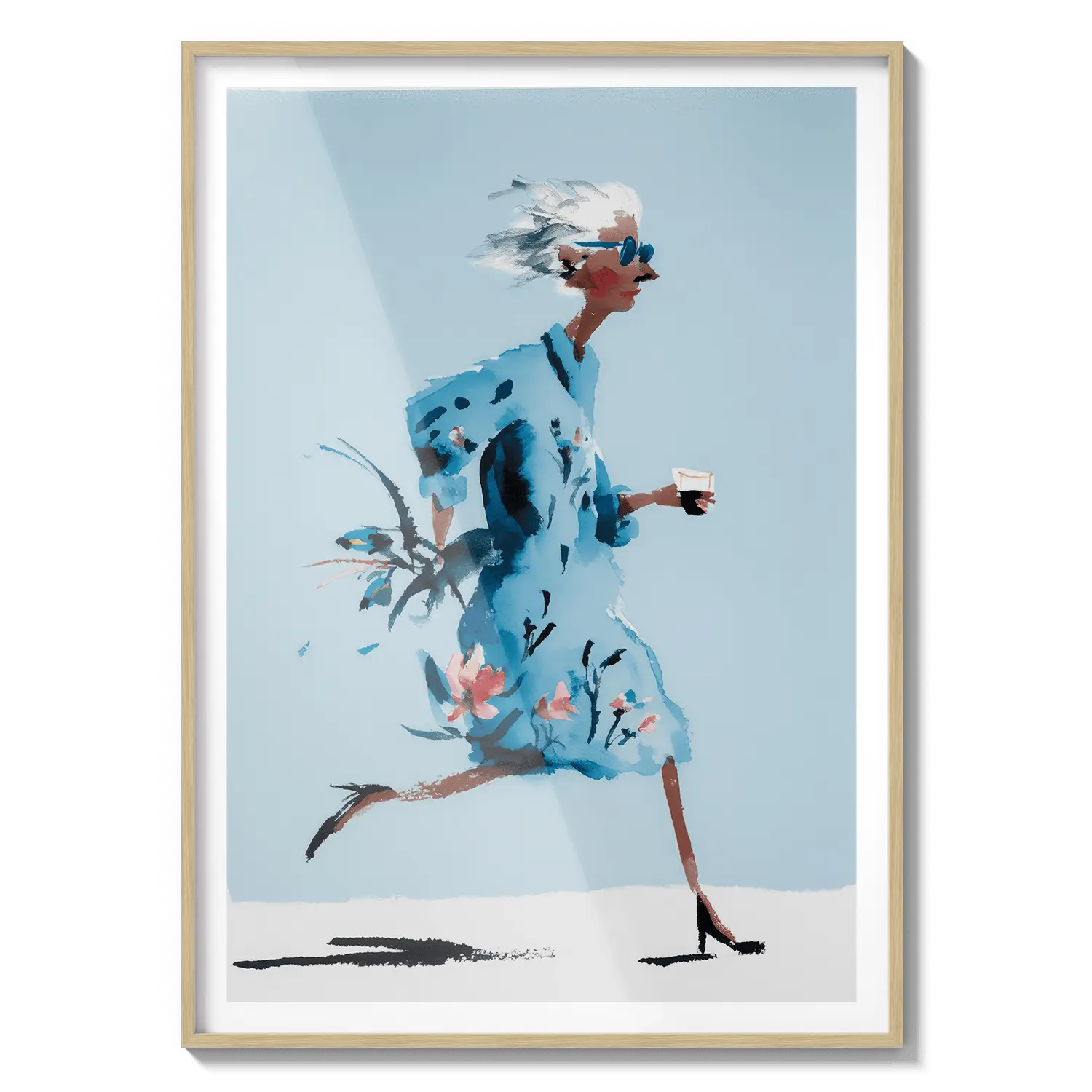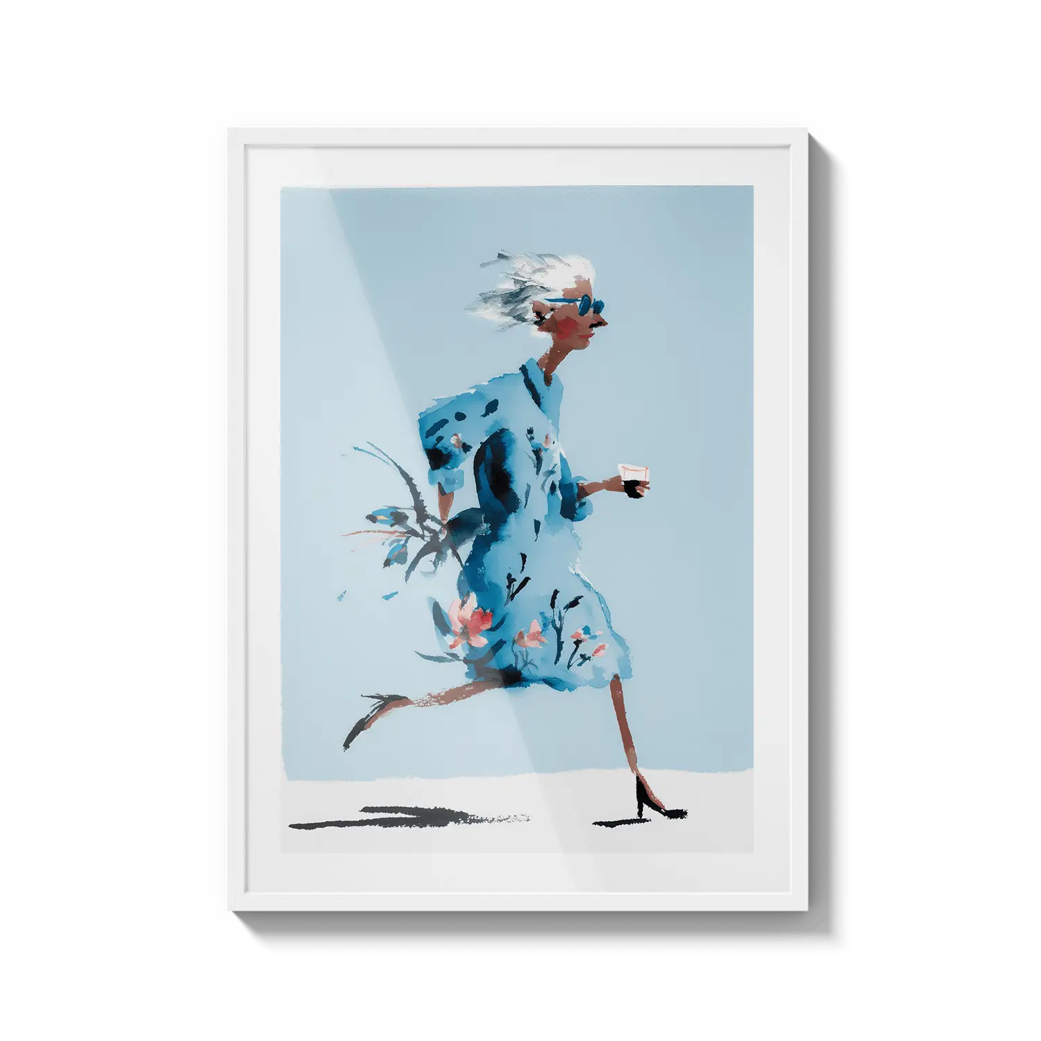 Une douce illustration d'une femme marchant à travers des tons bleus doux, évoquant la liberté et une confiance tranquille. Une œuvre d'art réfléchie à offrir à quelqu'un qui apprécie les moments calmes.