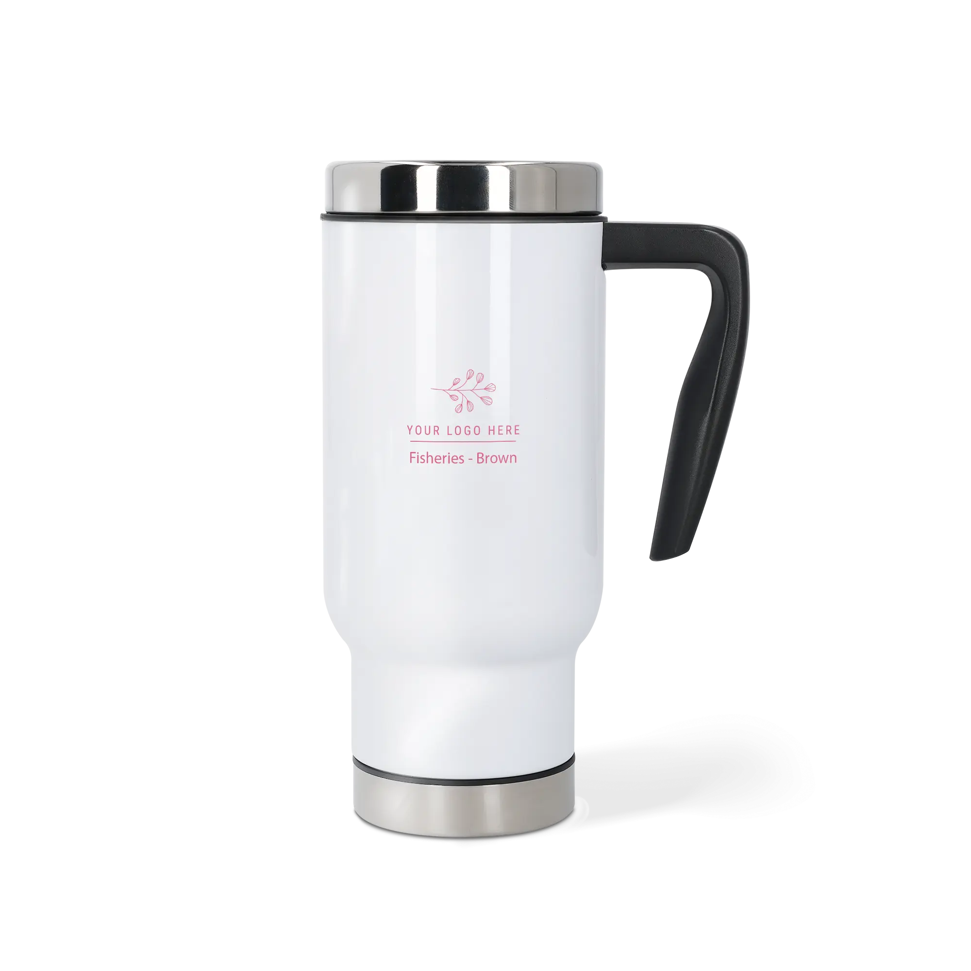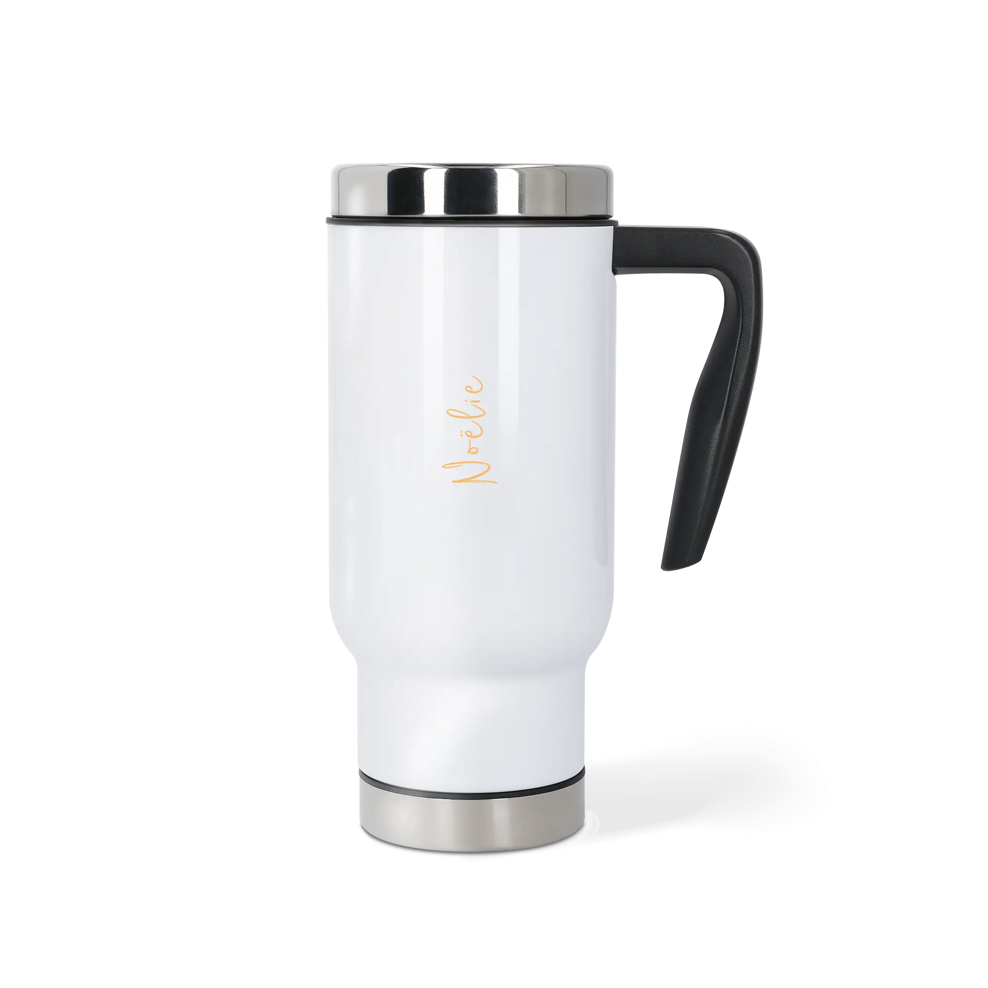 Plus d'informations sur le mug isotherme : Matériau : Aluminium de haute qualité à l'extérieur, plastique de haute qualité à l'intérieur. Couleur : Blanc avec détails en aluminium et anse noire avec détails en aluminium. Hauteur : 18 cm. Diamètre : 8,5 cm. Volume : 500 ml. Bonus : le couvercle n'est pas entièrement étanche, veillez donc à maintenir votre mug droit.