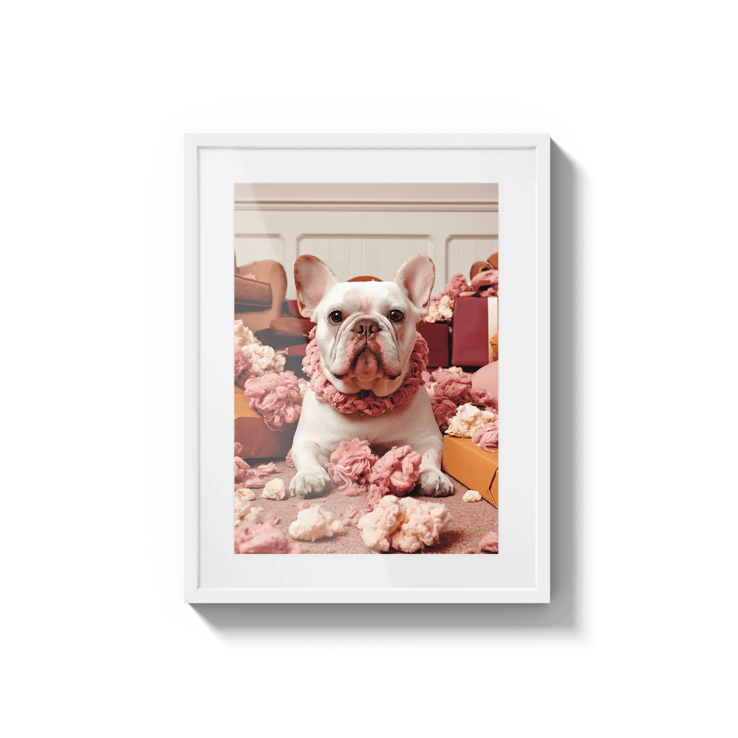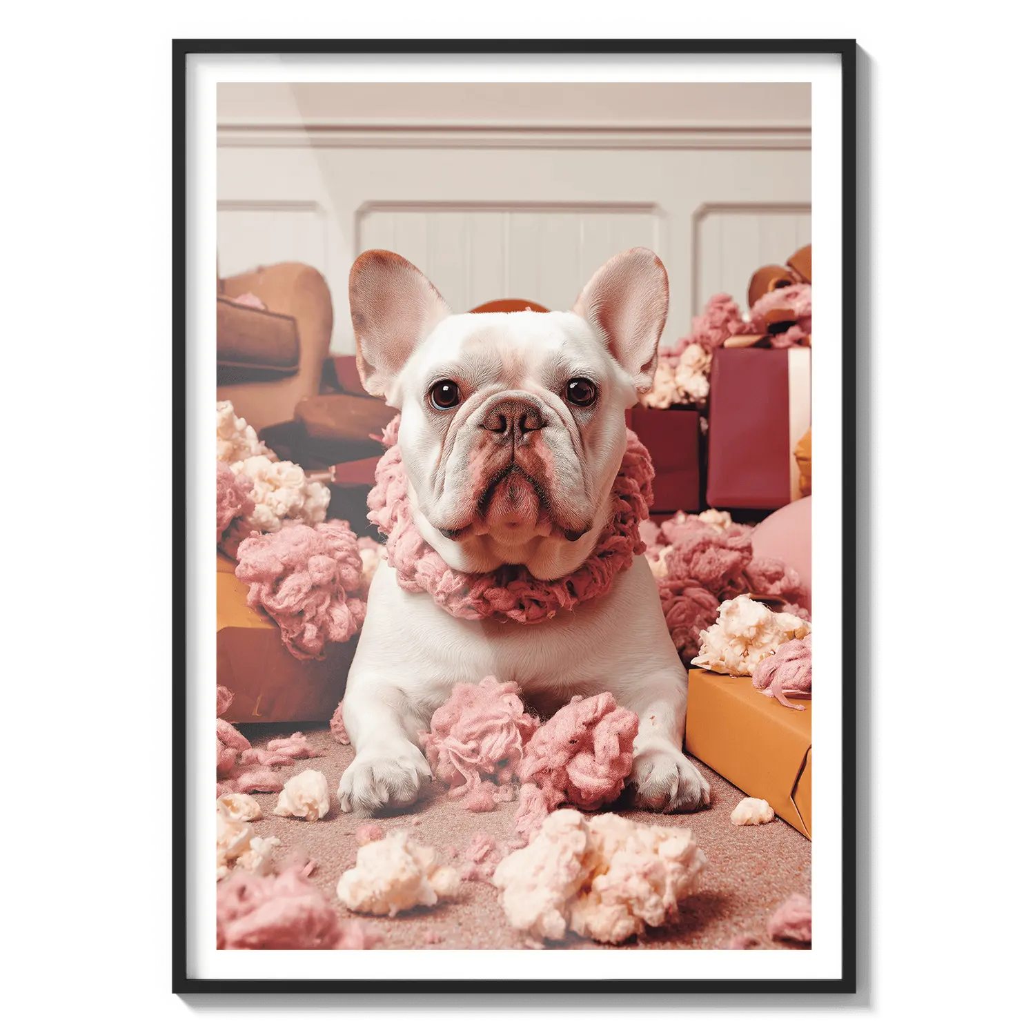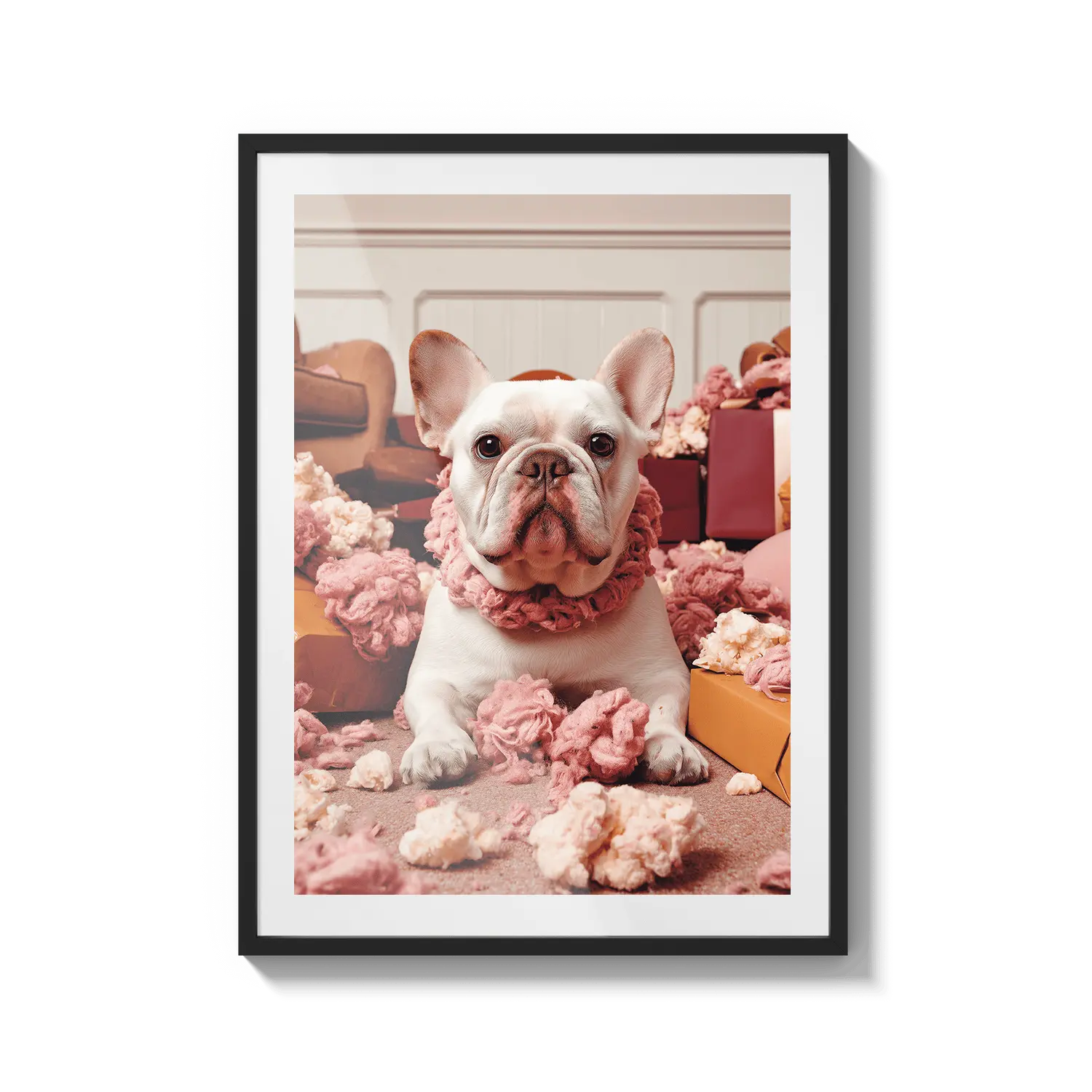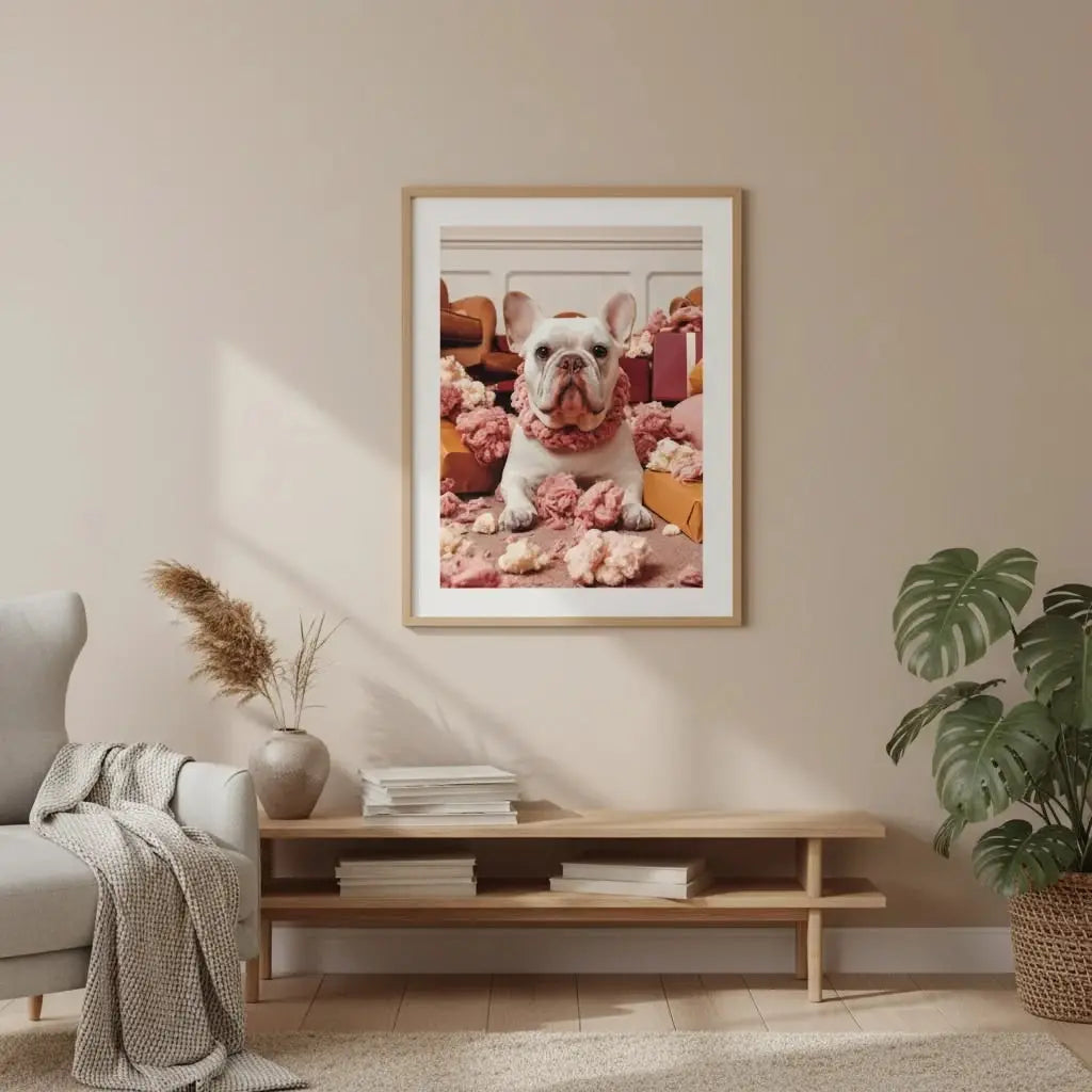 Un doux bouledogue entouré de douces fleurs roses, offrant de la tendresse avec une touche de fantaisie. Un cadeau charmant et chaleureux.