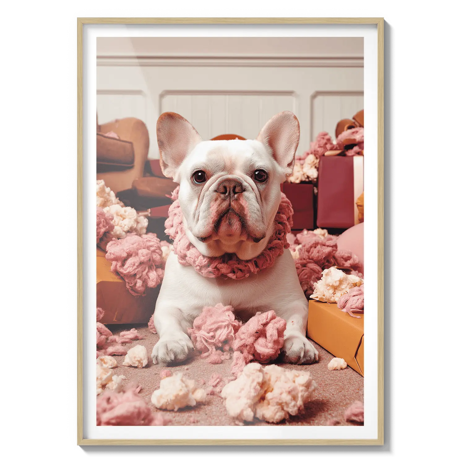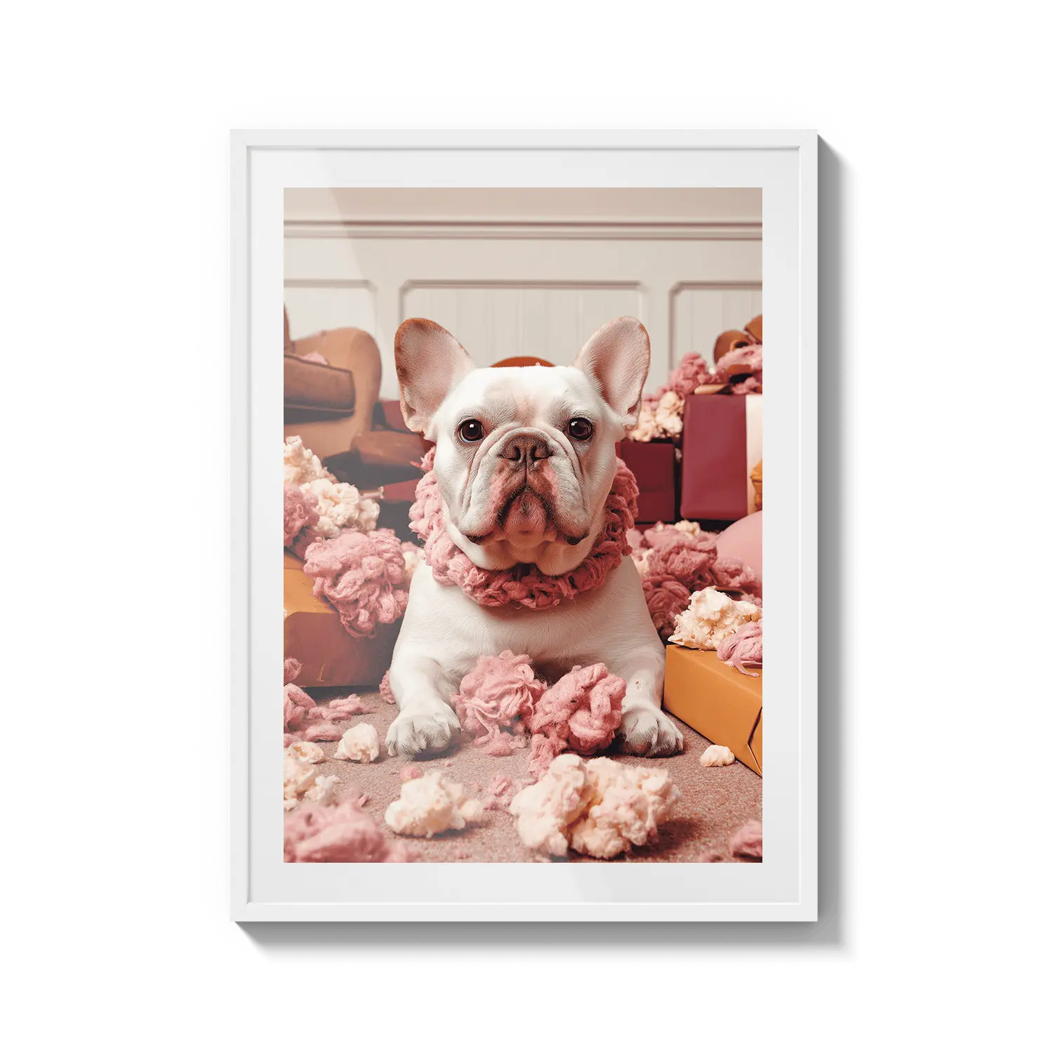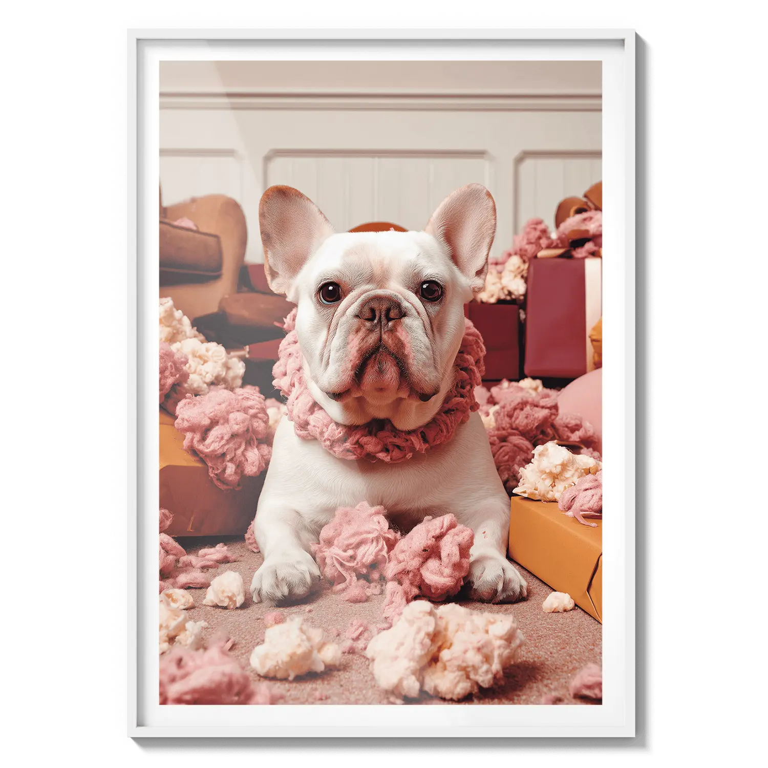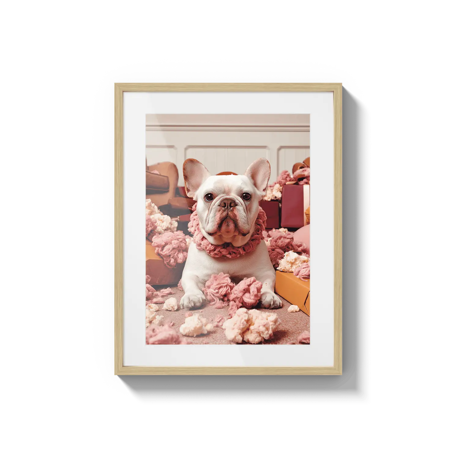 Un doux bouledogue entouré de douces fleurs roses, offrant de la tendresse avec une touche de fantaisie. Un cadeau charmant et chaleureux.