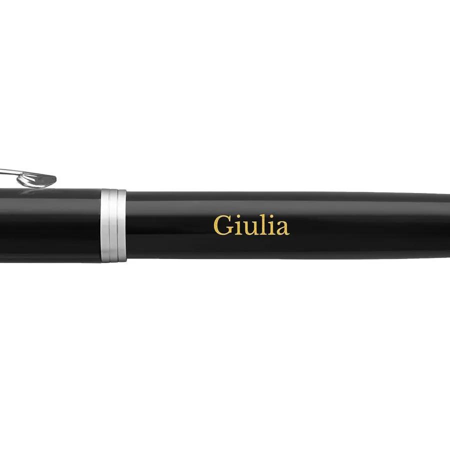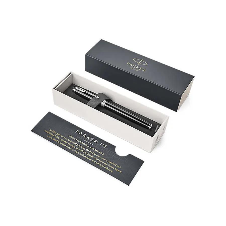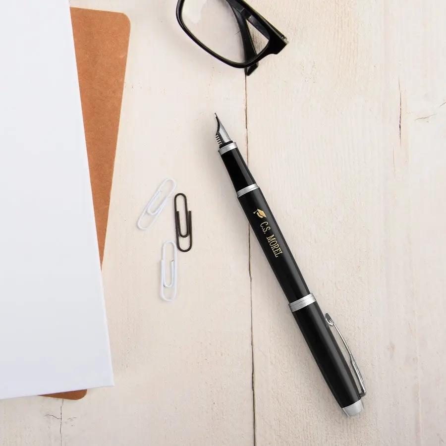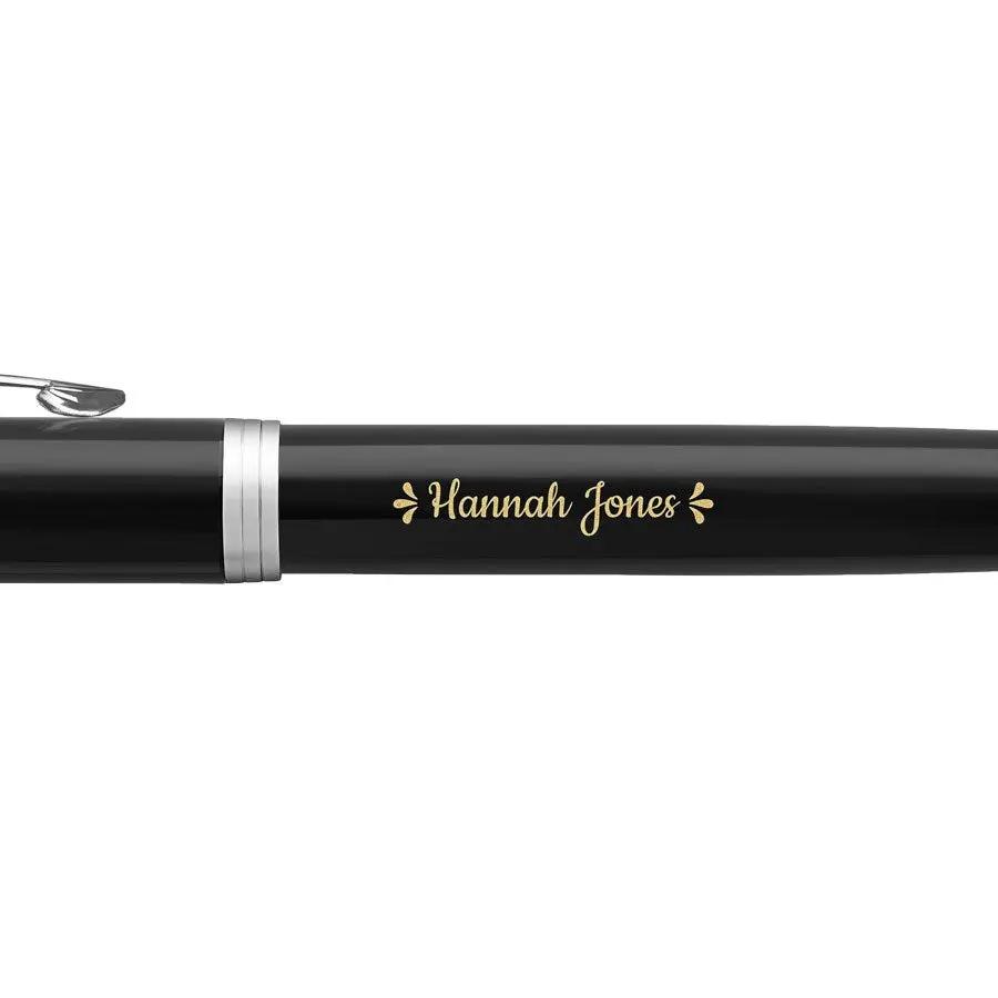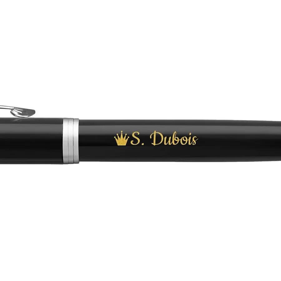 Stylo Parker gravé avec un nom ou un texte. Stylo plume Parker IM avec votre design. Disponible en plusieurs couleurs vives. Dans un coffret cadeau luxueux ! Informations complémentaires sur le stylo Parker I.M. gravé : Marque : Parker Modèle : I.M. Type : Stylo plume Couleur : Noir Couleur de l'encre : Bleu Personnalisation : Texte gravé Couleur de la gravure : Doré Bonus : Livré avec une recharge et dans un coffret cadeau luxueux. Rechargeable avec des recharges Parker. Remarque : ce stylo convient aux droitiers.