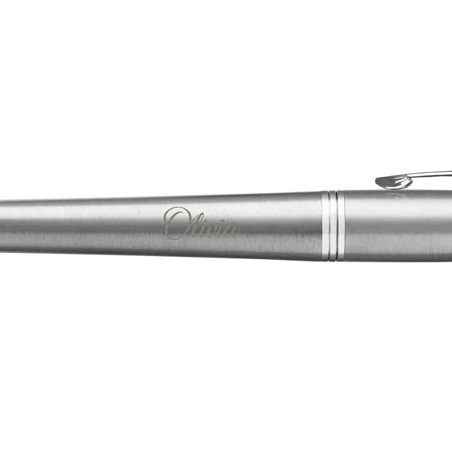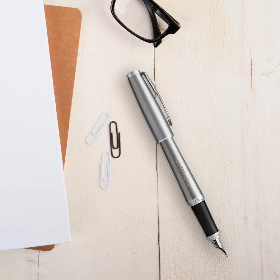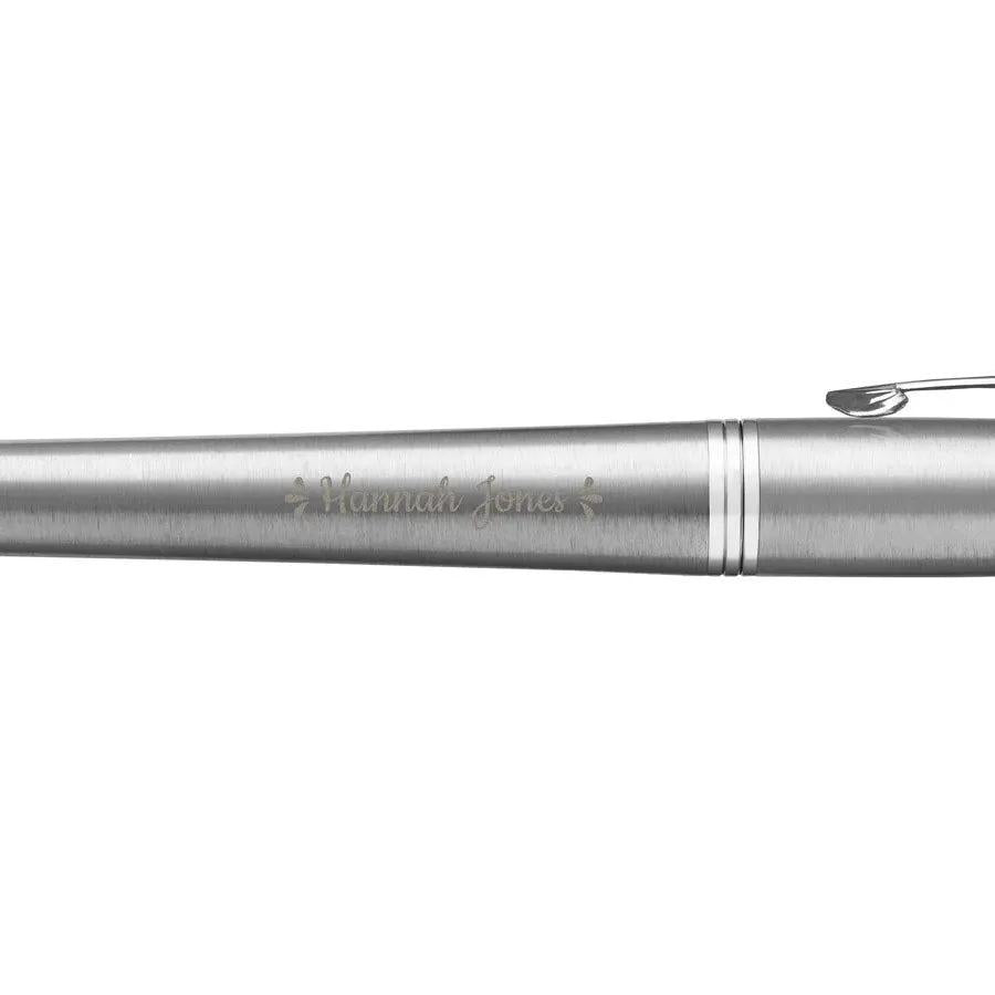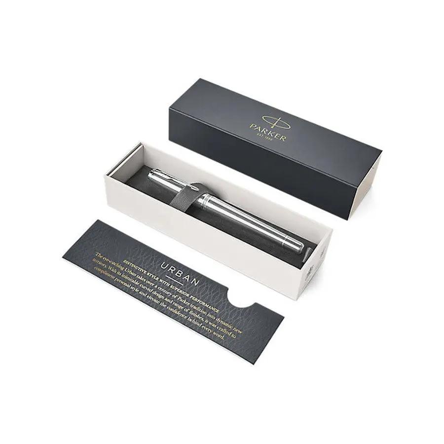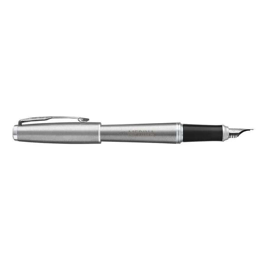 Stylo Parker gravé avec un nom ou un texte. Stylo plume Parker Urban avec votre design. Disponible en plusieurs couleurs vives. Dans un coffret cadeau luxueux ! Informations complémentaires sur le stylo Parker Urban gravé : Marque : Parker Modèle : Urban Metro Type : Stylo plume Couleur : Argenté Couleur de l'encre : Bleu Personnalisation : Texte gravé Couleur de la gravure : Doré Bonus : Livré avec une recharge et dans un coffret cadeau luxueux. Rechargeable avec des recharges Parker. Remarque : ce stylo convient aux gauchers.