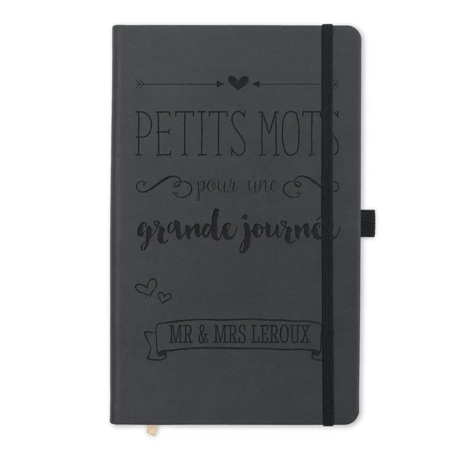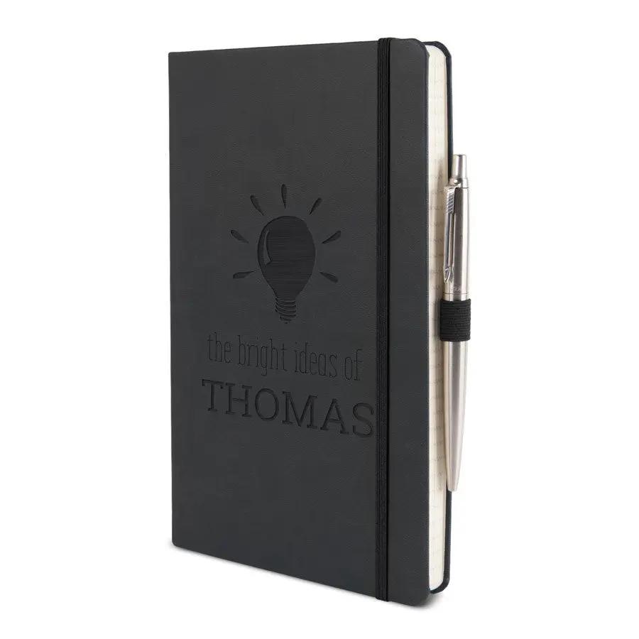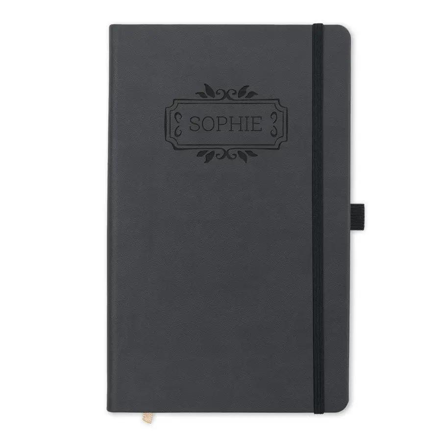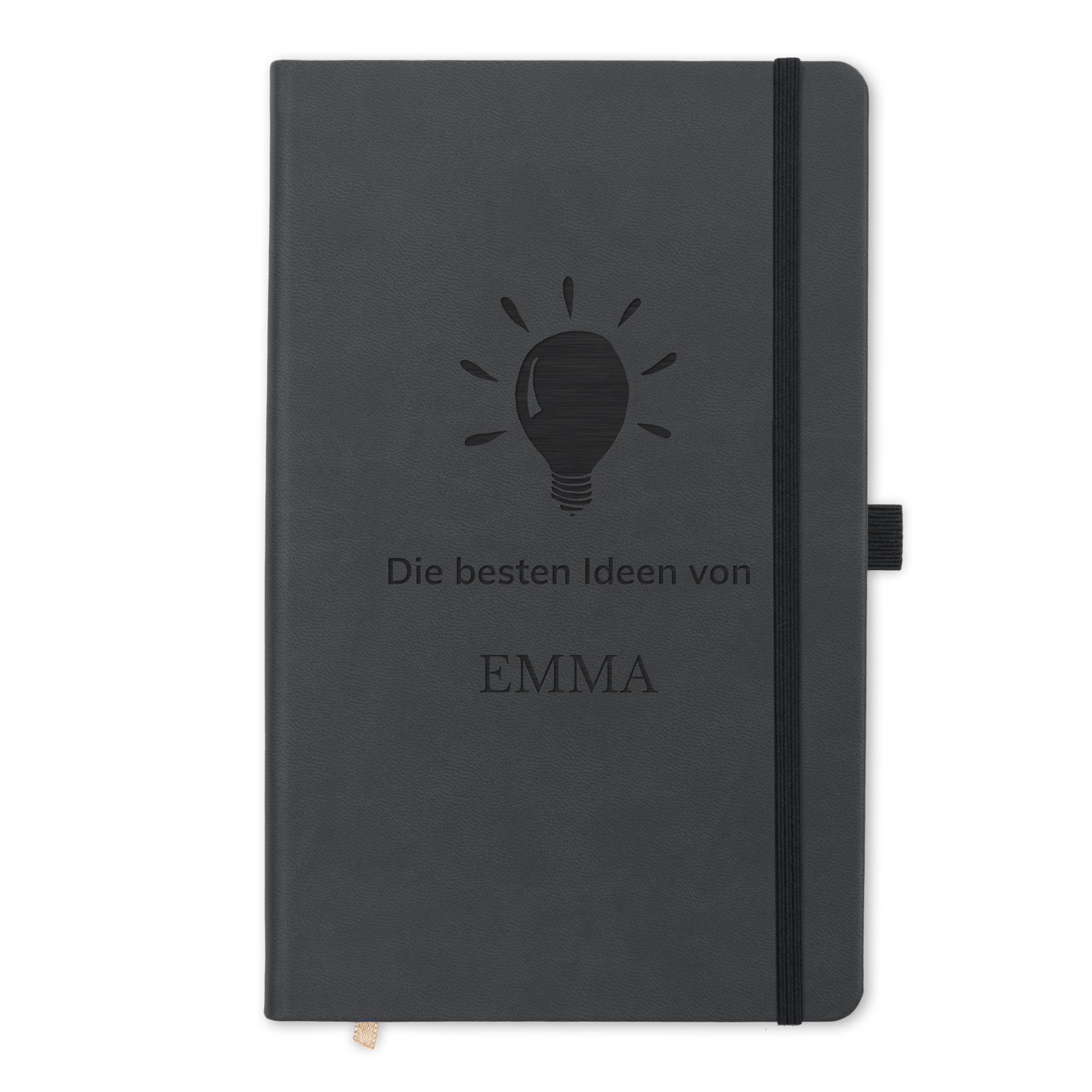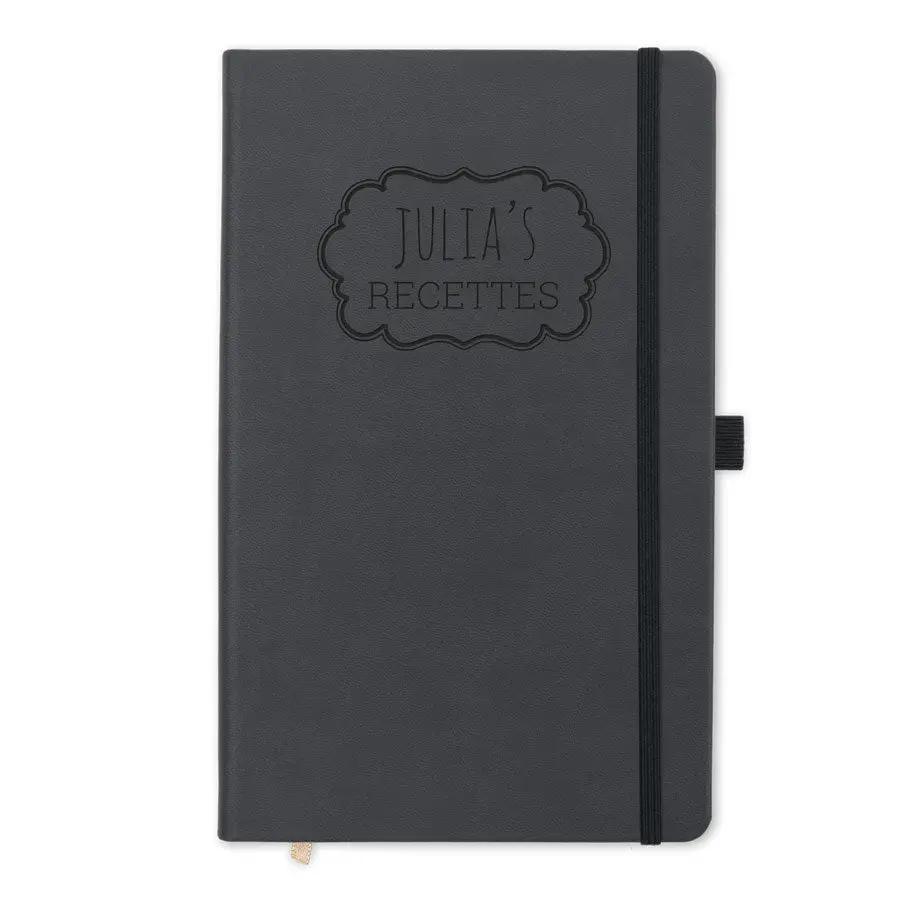 Carnet super original et personnel gravé avec votre nom. Avec de nombreux motifs joyeux. Disponible en noir et bleu !