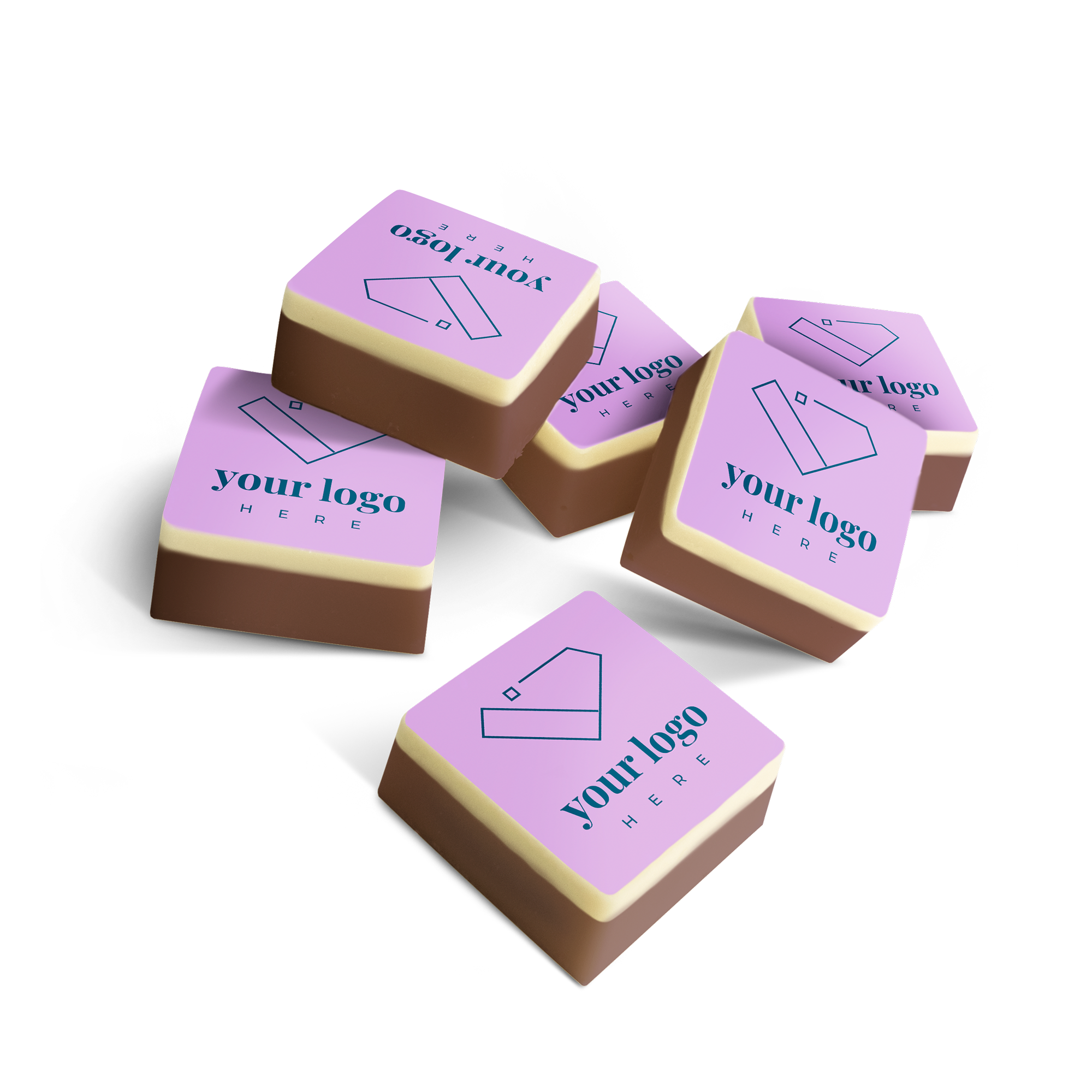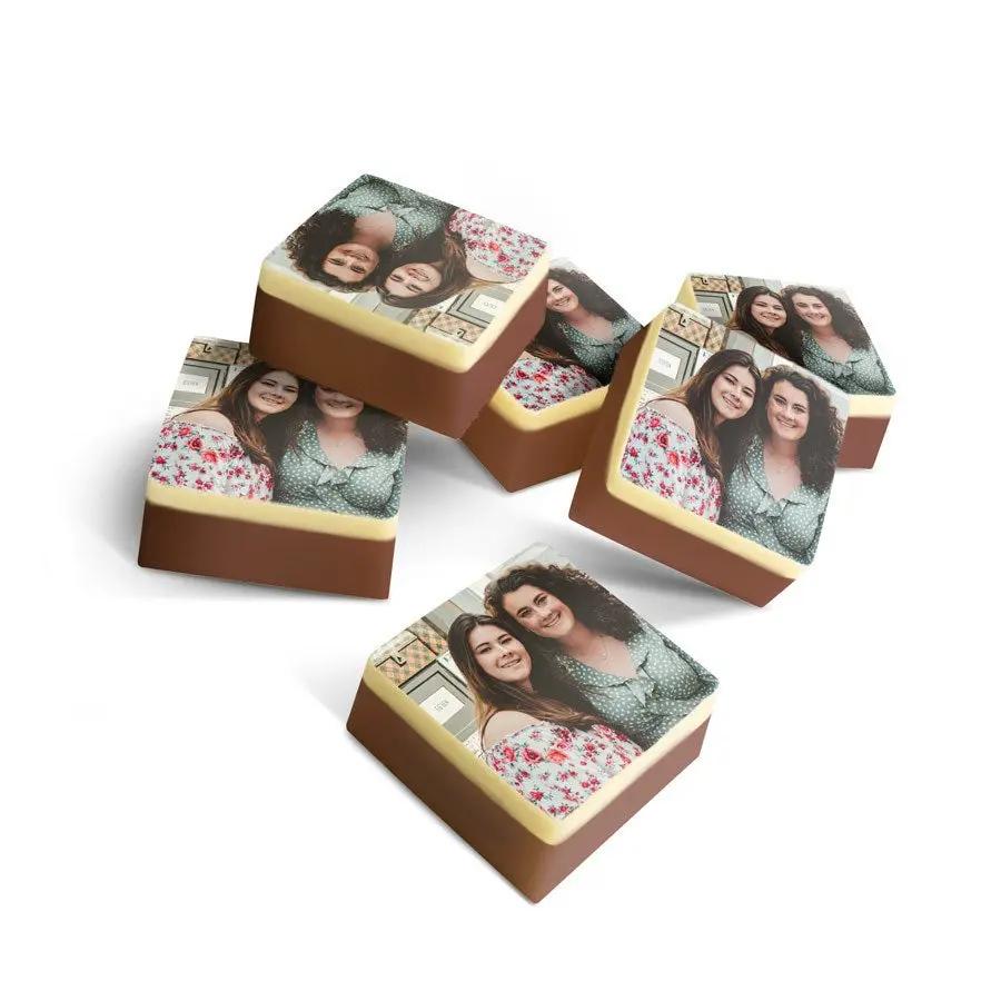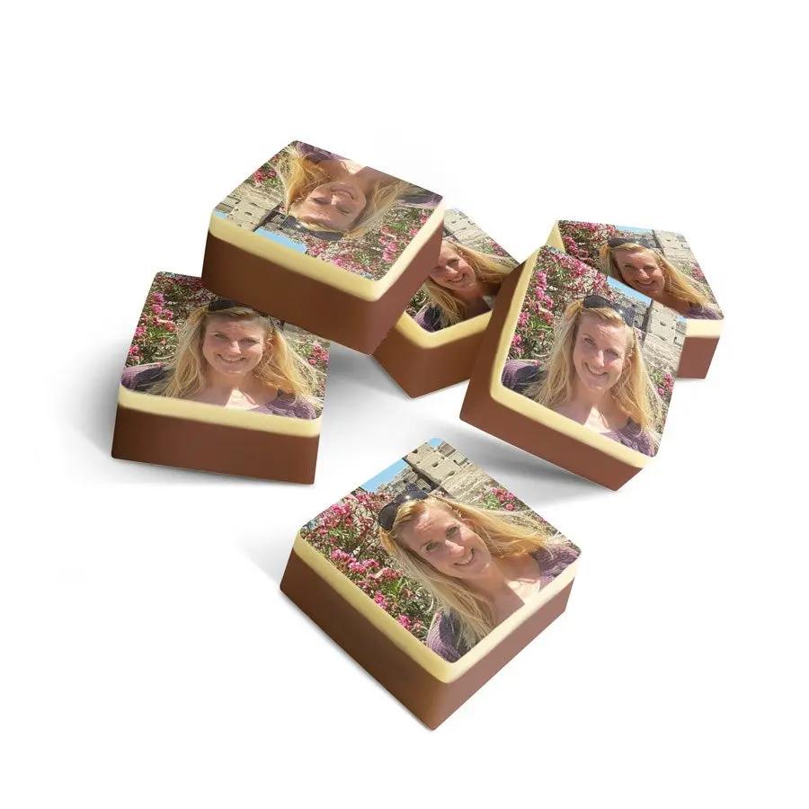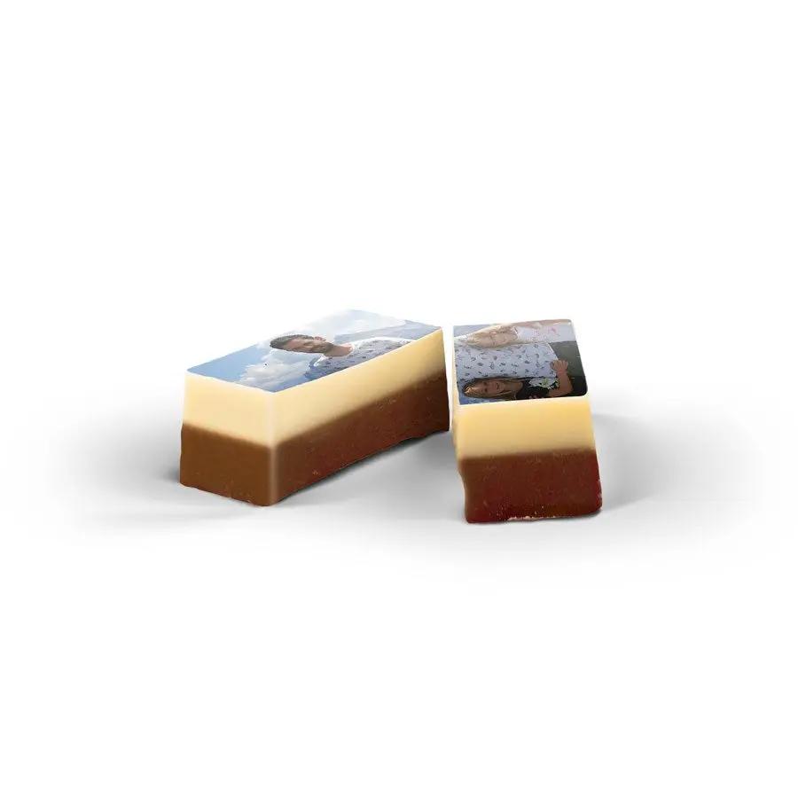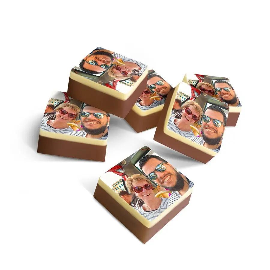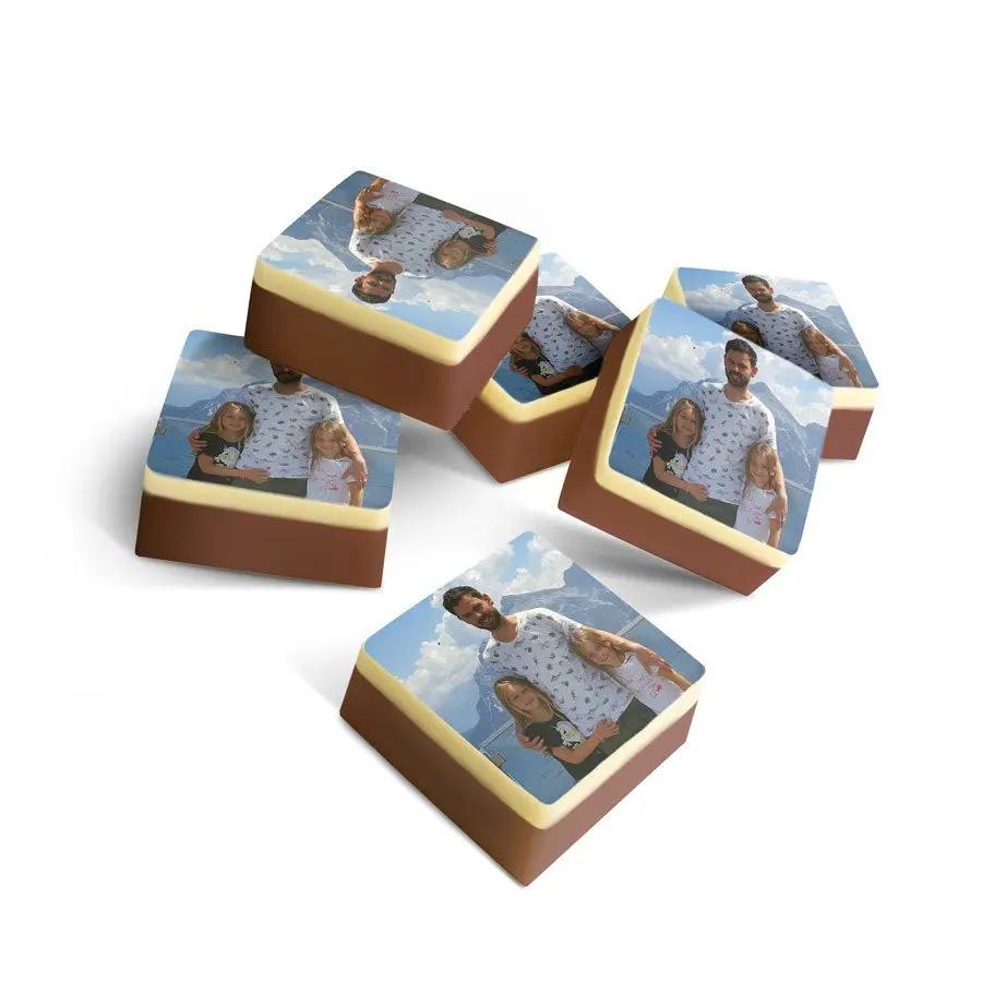 Quantité : 48 chocolats. Chocolat : chocolat au lait et chocolat enrobé de chocolat blanc. Forme : carré. Dimensions des chocolats : 2,6 x 2,6 cm. Personnalisation : impression photo ou logo. Impression : comestible et en couleur. Si la température dépasse 25 degrés, nous vous recommandons d'ajouter un produit congelé à votre commande. Ingrédients : Chocolat au lait : sucre, beurre de cacao, lait entier en poudre, pâte de cacao, émulsifiant (lécithine de soja), arôme naturel de vanille. Au moins 34 % de cacao. Chocolat blanc : sucre, beurre de cacao, lait entier en poudre, émulsifiant (lécithine de soja), arôme naturel de vanille. Au moins 29 % de cacao. Conseils de conservation : vous pouvez conserver les chocolats jusqu’à 10 semaines dans un endroit frais et sombre, à une température comprise entre 14 et 18 °C. Informations allergènes : contient du soja et du lait. Chaque chocolat mesure 2,6 x 2,6 cm. La taille peut varier légèrement d’un chocolat à l’autre.