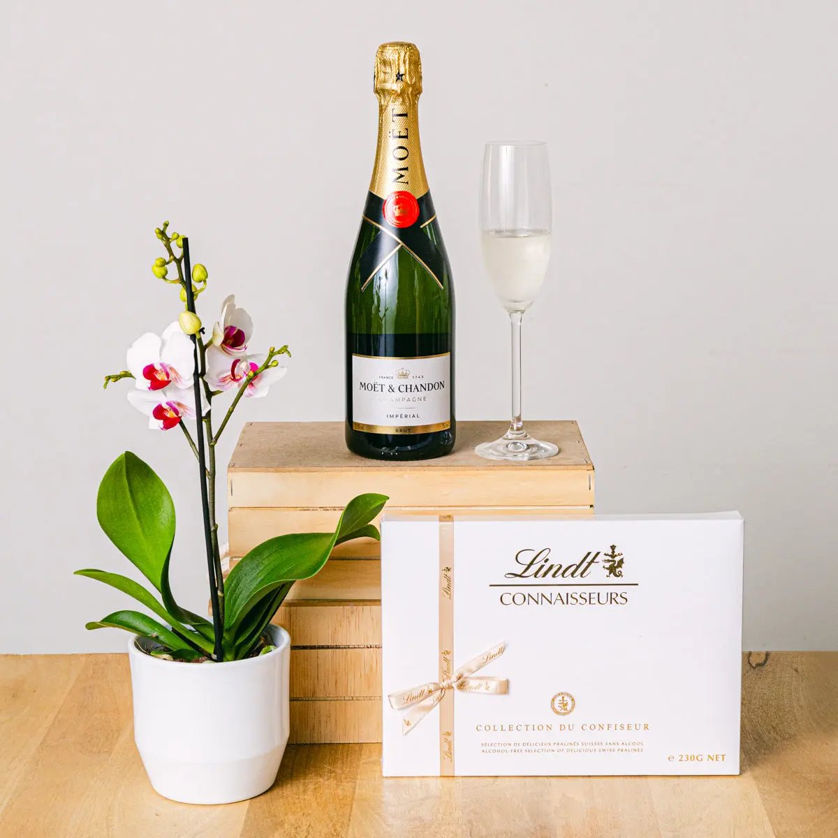 Le cacao est antioxydant, améliore la santé cardiaque, réduit le stress et améliore l'humeur. Profitez de ses nombreux bienfaits, tout en admirant la vue magnifique, en compagnie d'un excellent champagne et sous le regard harmonieux de la mini-orchidée. Que demander de plus ?