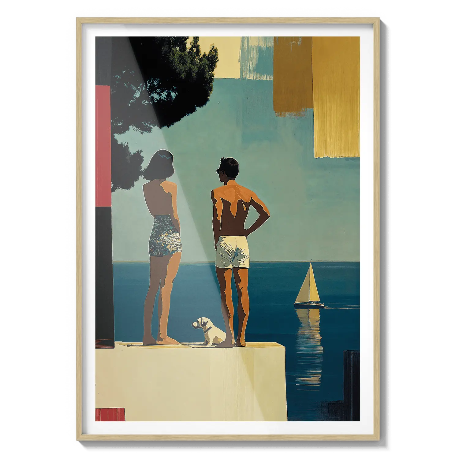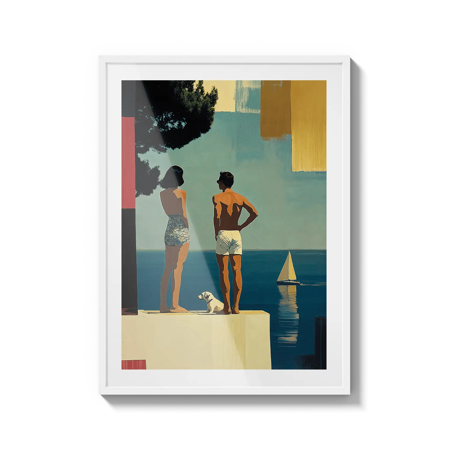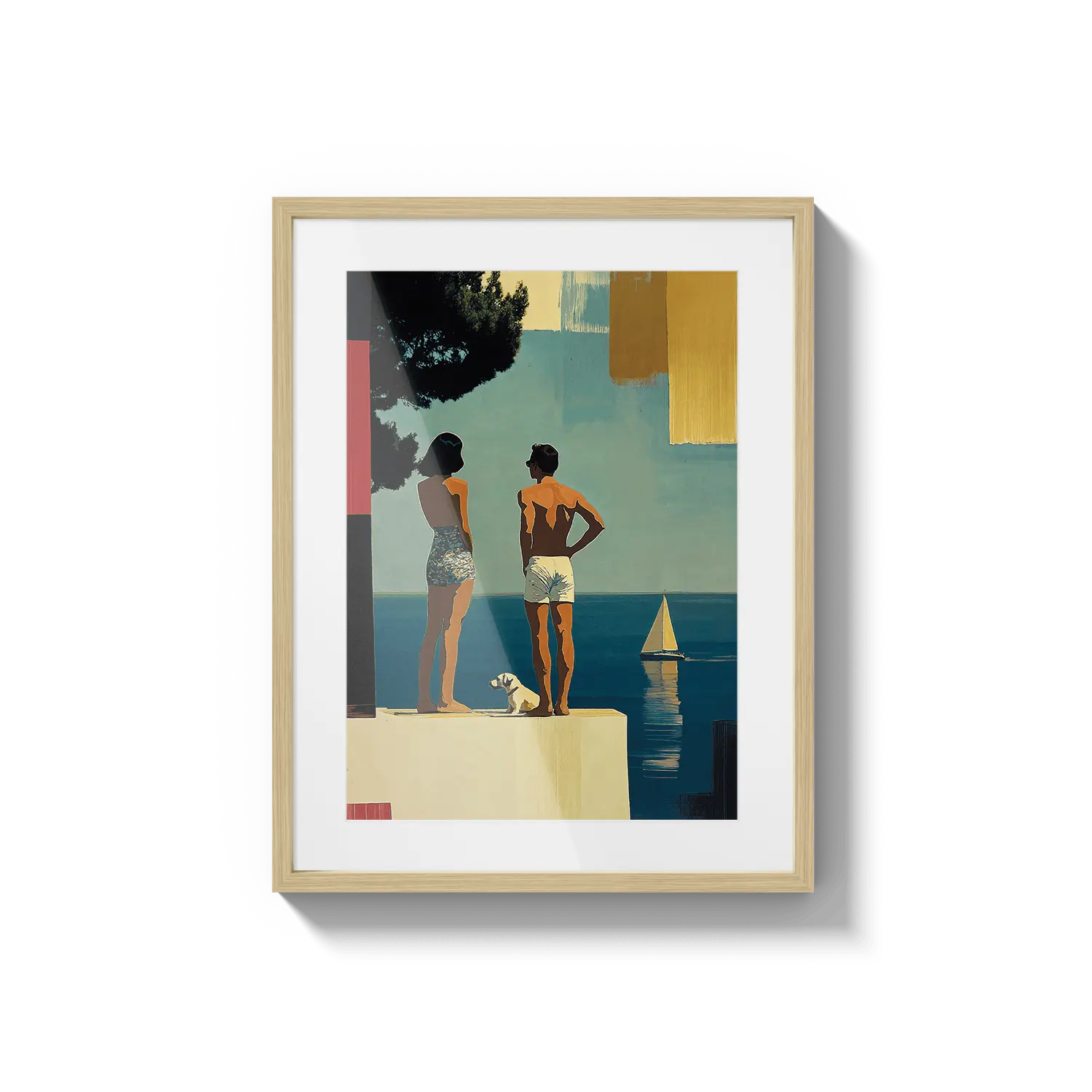 Une scène côtière ensoleillée avec des personnages debout au bord de la mer sous une lumière chaude. Une douce invitation à faire une pause et à respirer.