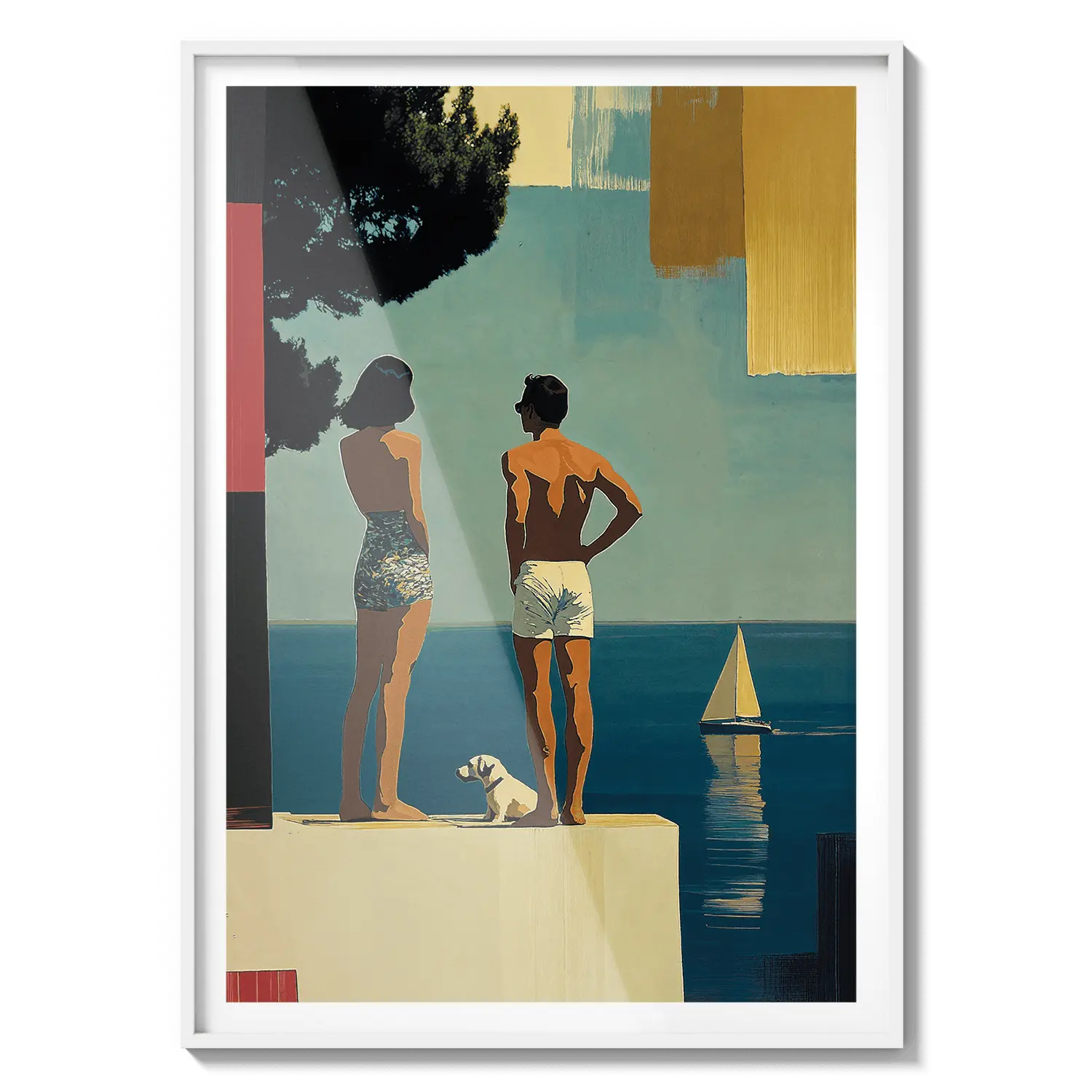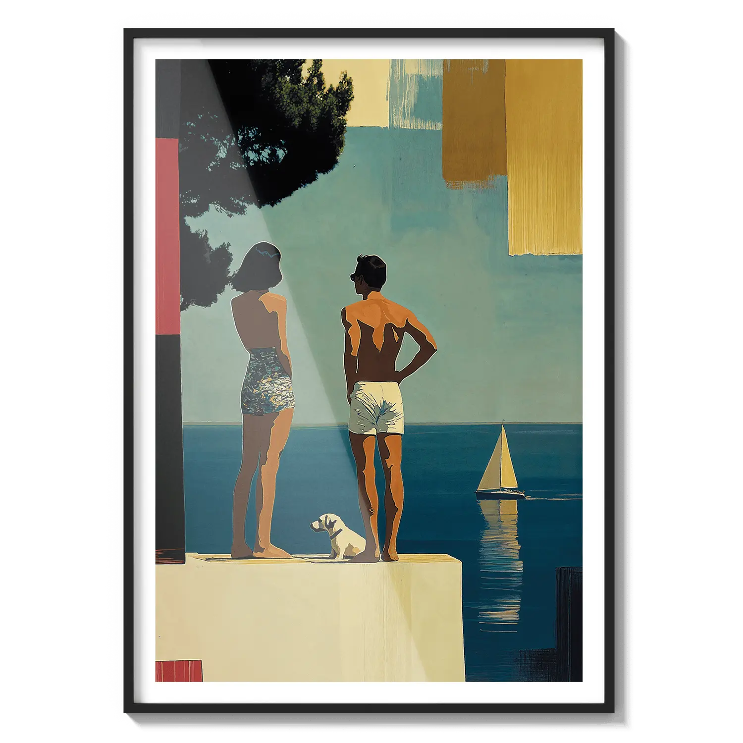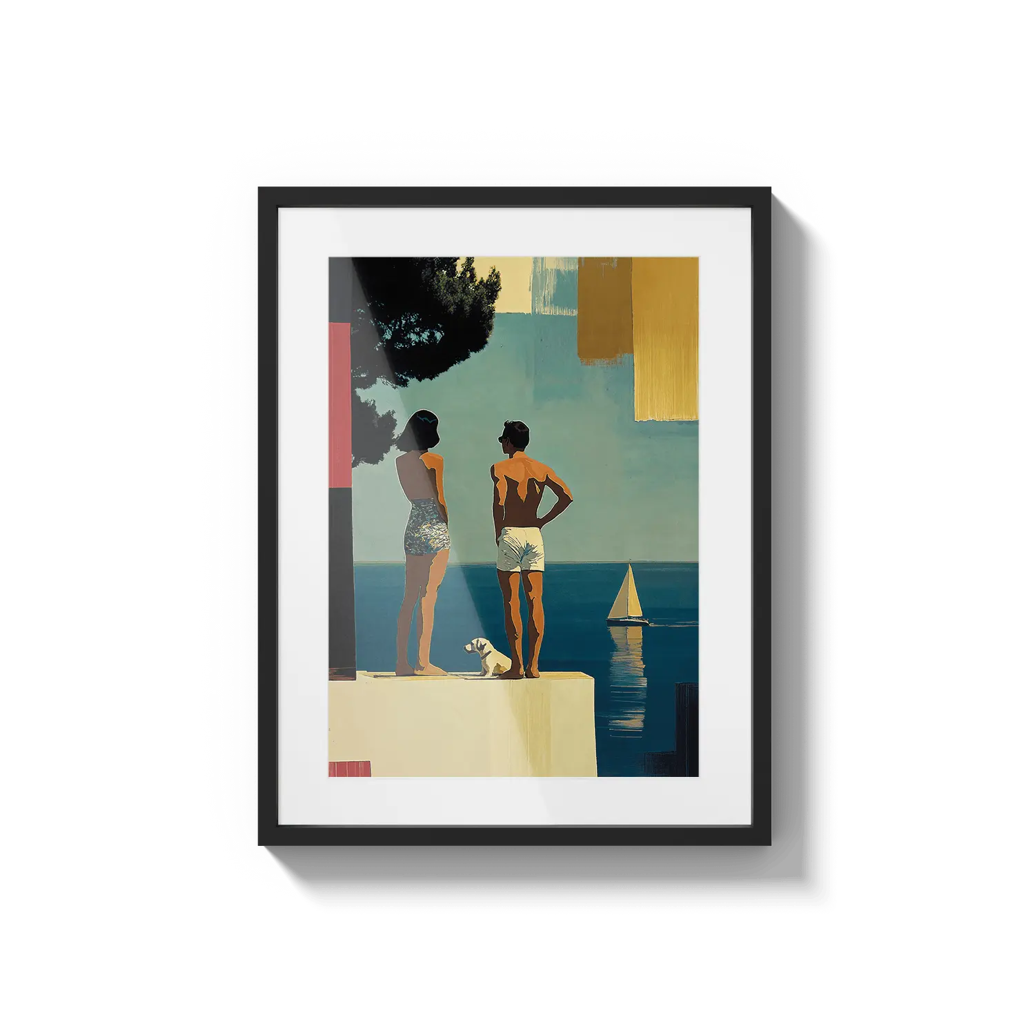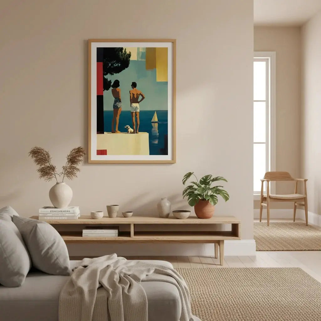 Une scène côtière ensoleillée avec des personnages debout au bord de la mer sous une lumière chaude. Une douce invitation à faire une pause et à respirer.