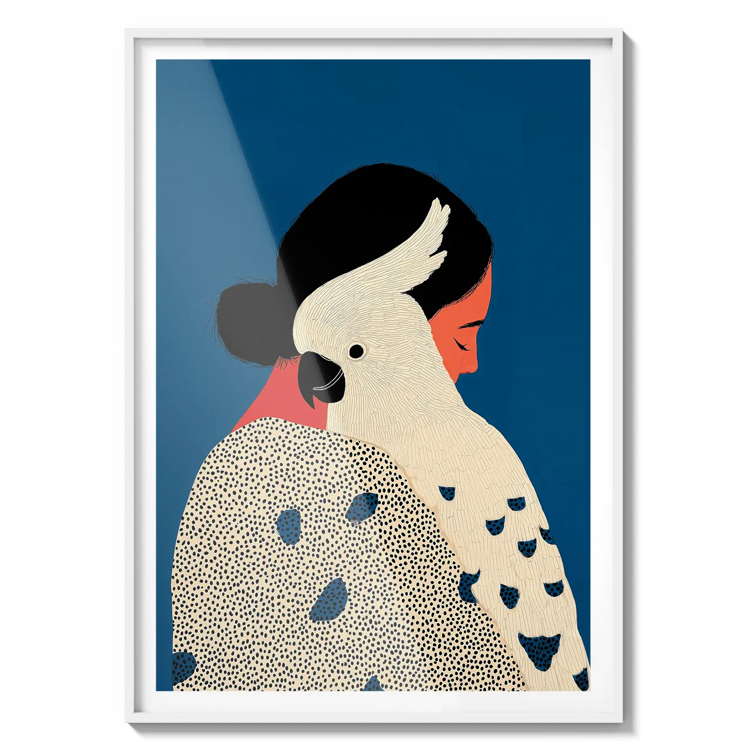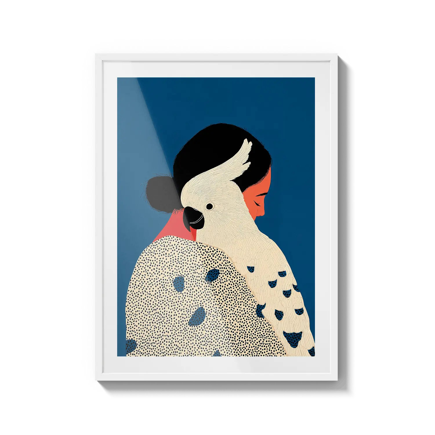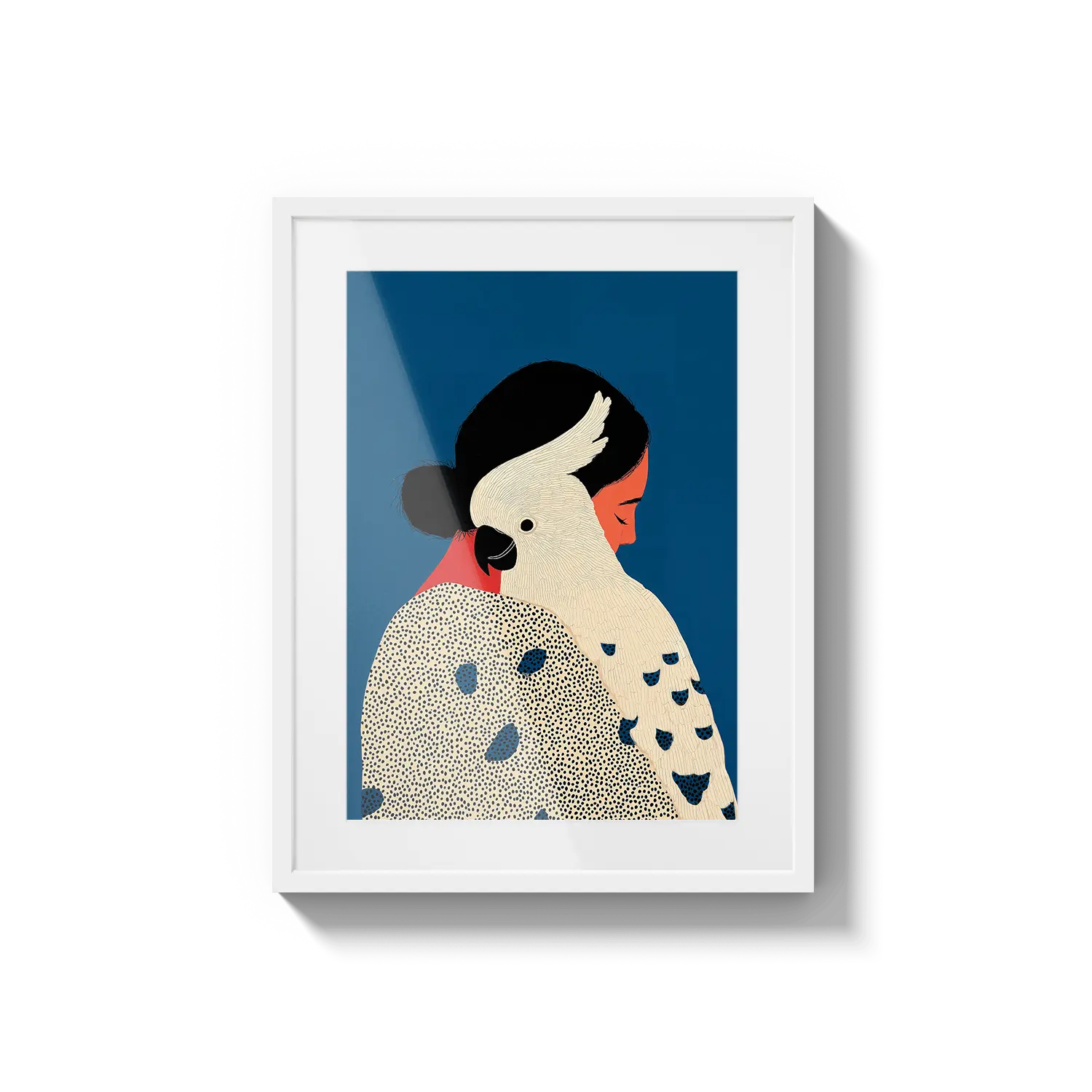 Une douce illustration d'un cacatoès blanc sur des tons bleus doux, rayonnant d'un charme calme. Un joli cadeau affectueux.