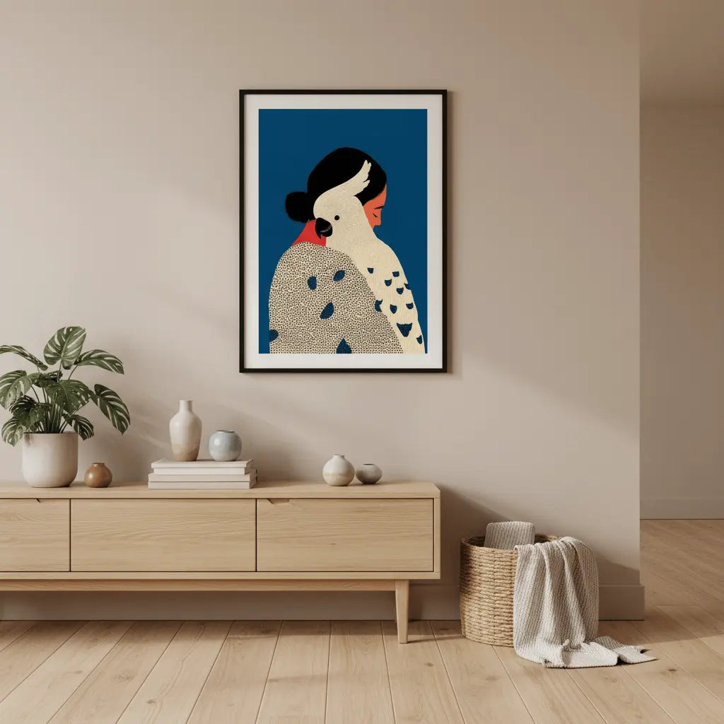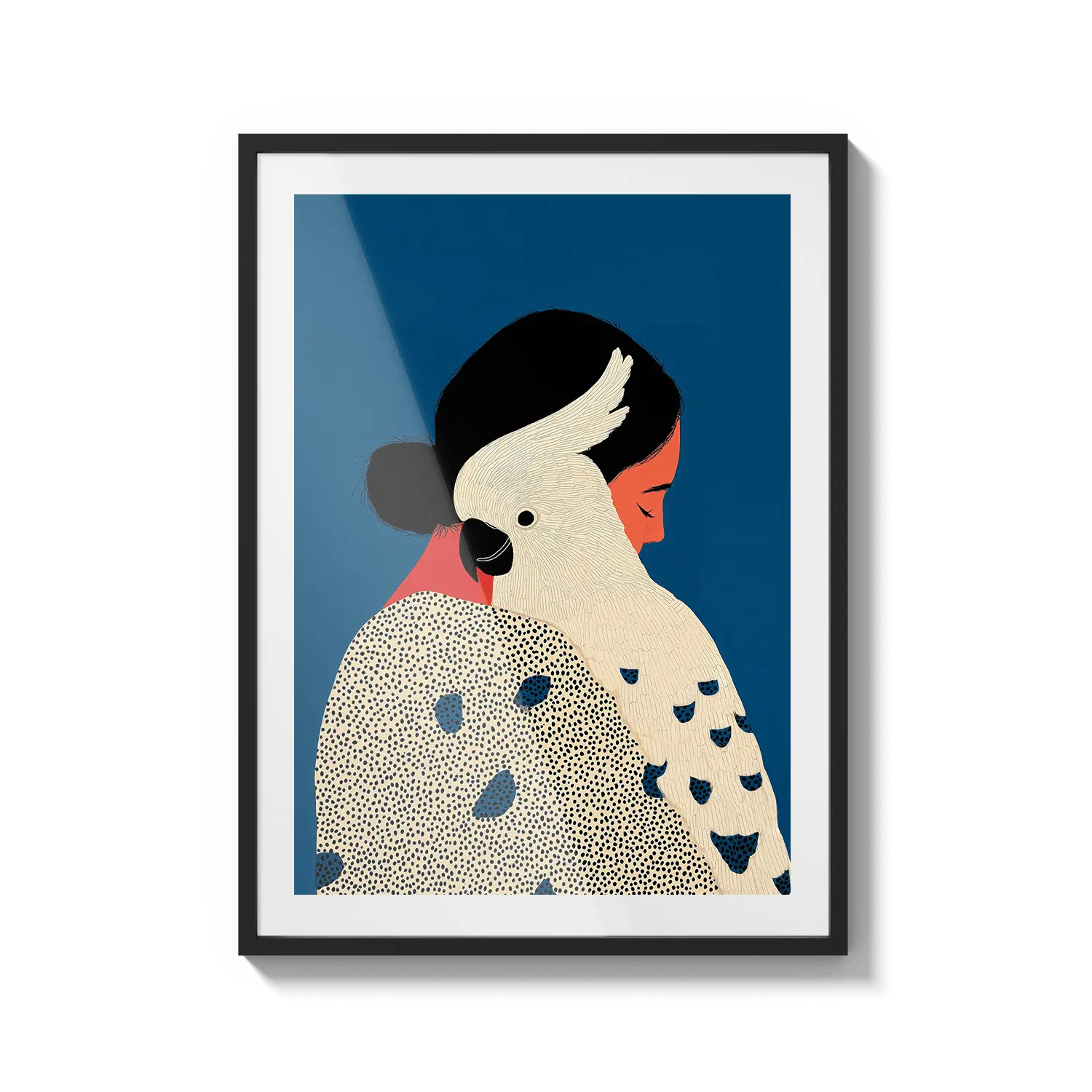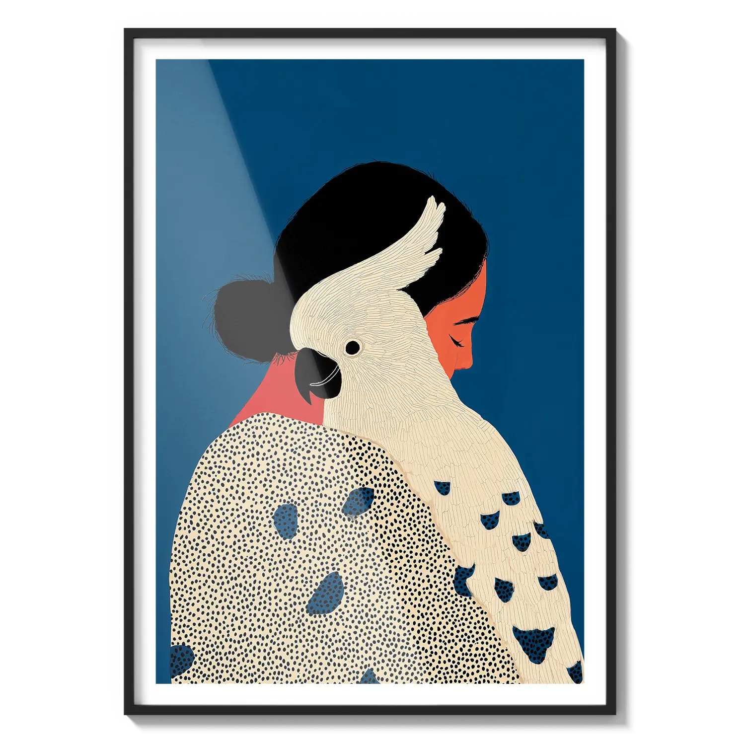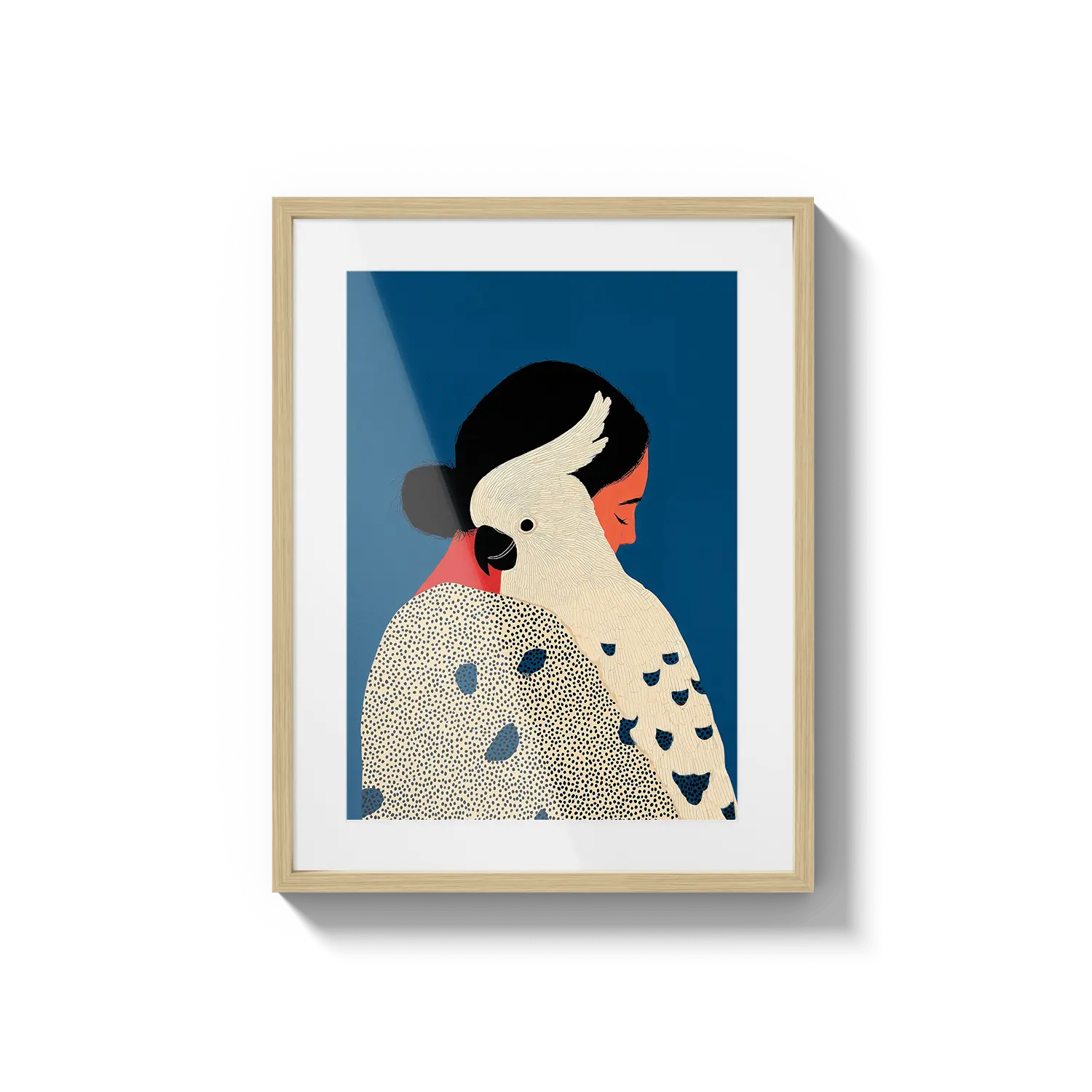 Une douce illustration d'un cacatoès blanc sur des tons bleus doux, rayonnant d'un charme calme. Un joli cadeau affectueux.