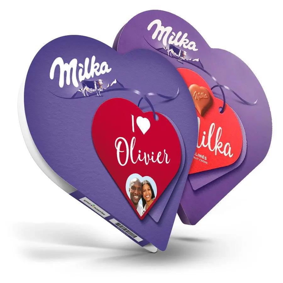 Délicieux cœur Milka avec prénom. Contient 30 pralines au chocolat fourrées à la crème de noisette onctueuse !