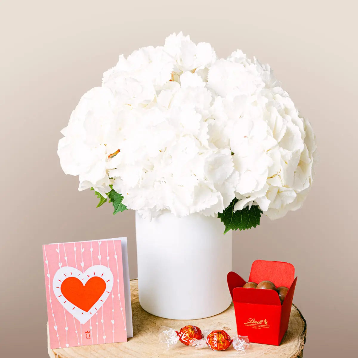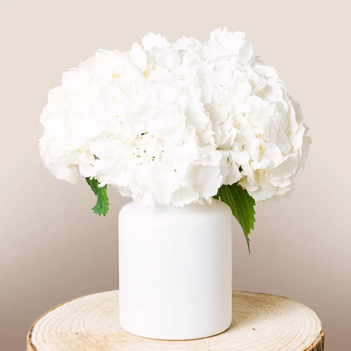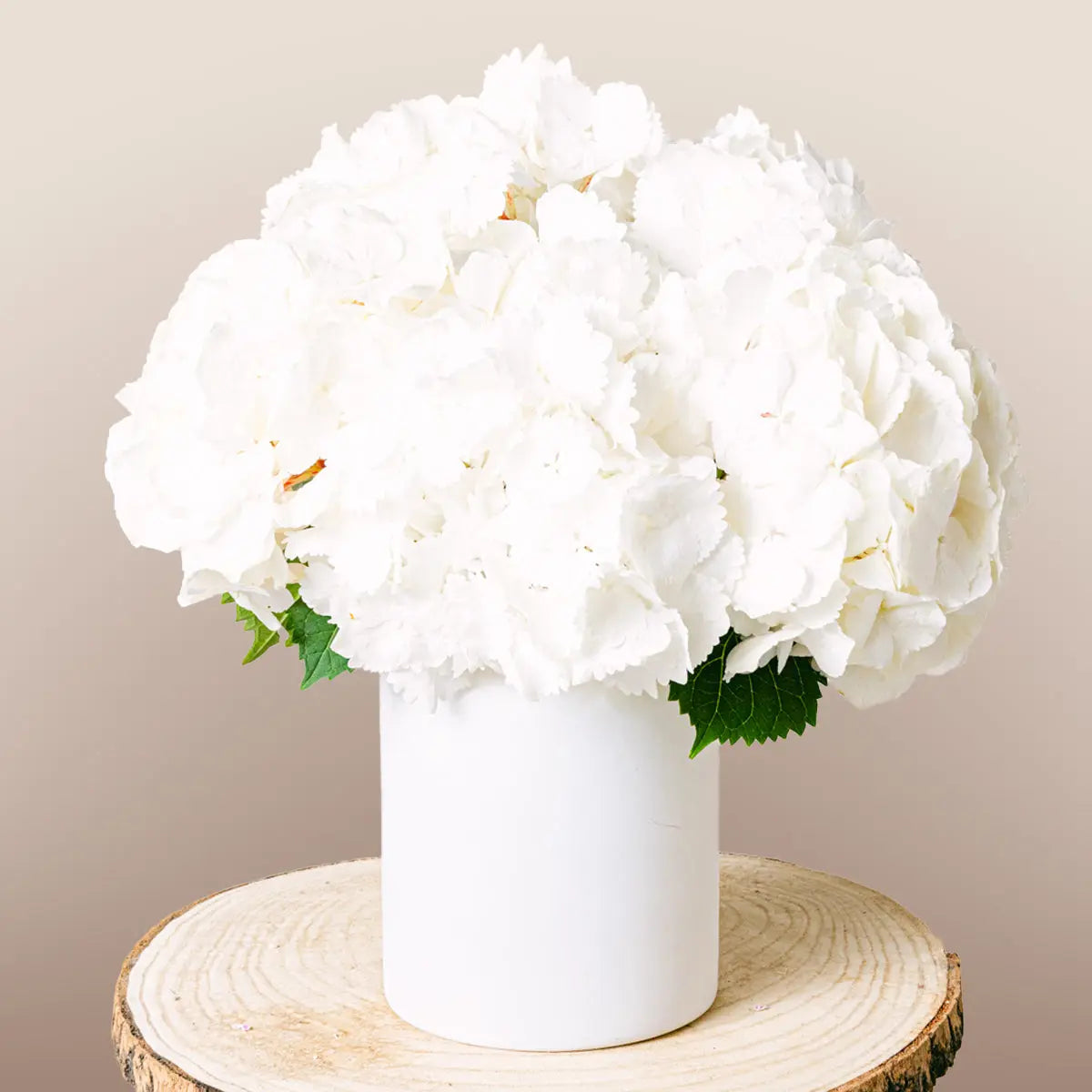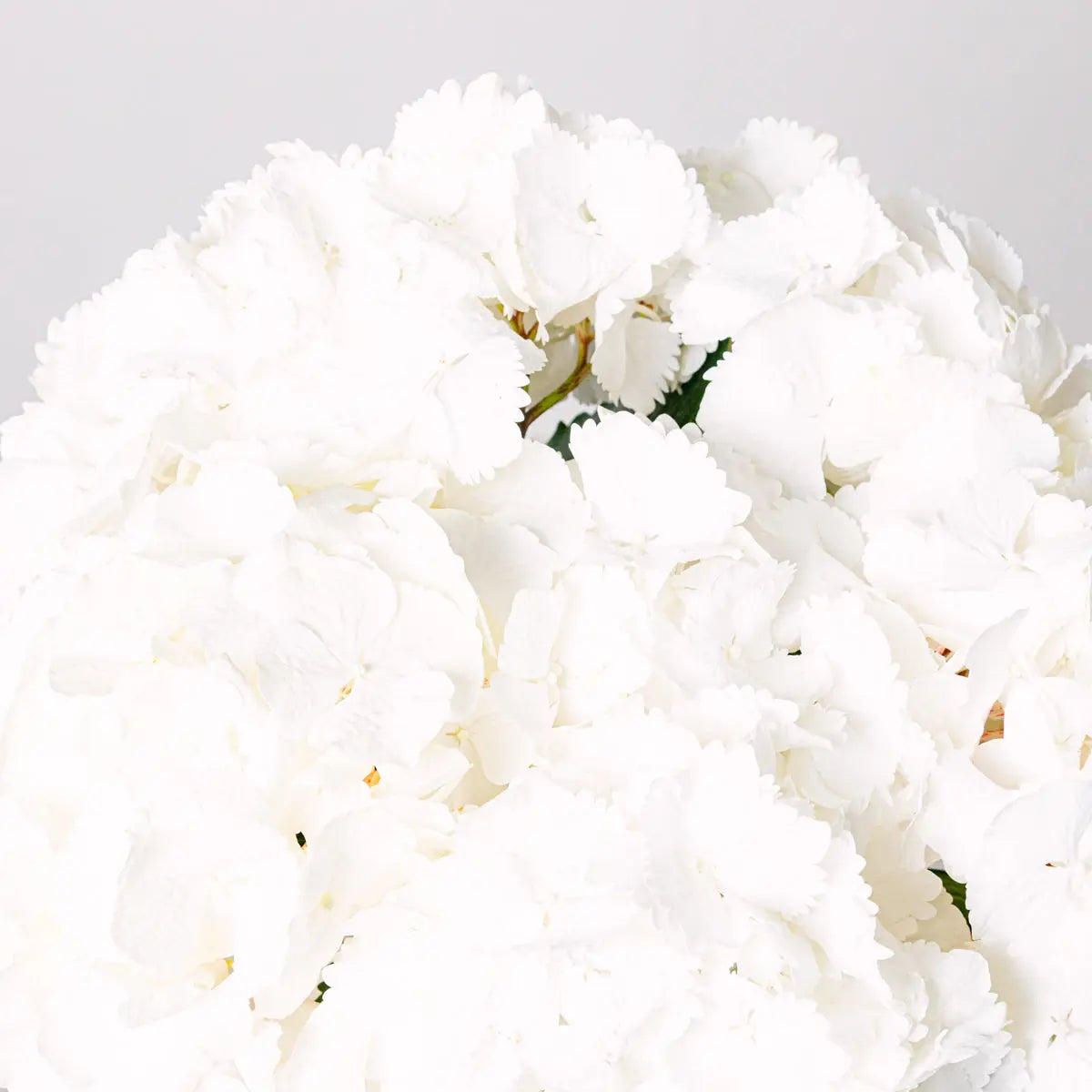 Un bouquet délicat qui évoque les belles chutes de neige hivernales. Saviez-vous que la couleur de l'hortensia peut varier selon les nutriments du sol où il pousse ? Ses fleurs volumineuses, pouvant atteindre 25 cm de diamètre, sont symboles d'abondance, de gratitude et de générosité. En fleur, ses pétales blancs lumineux transmettent élégance et pureté, ce qui en fait le choix idéal pour apporter calme et sérénité à n'importe quel espace.