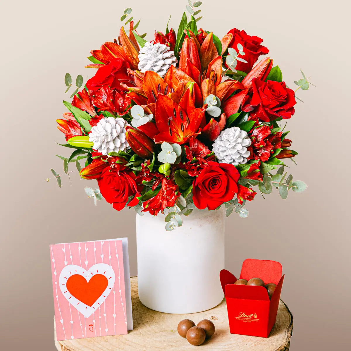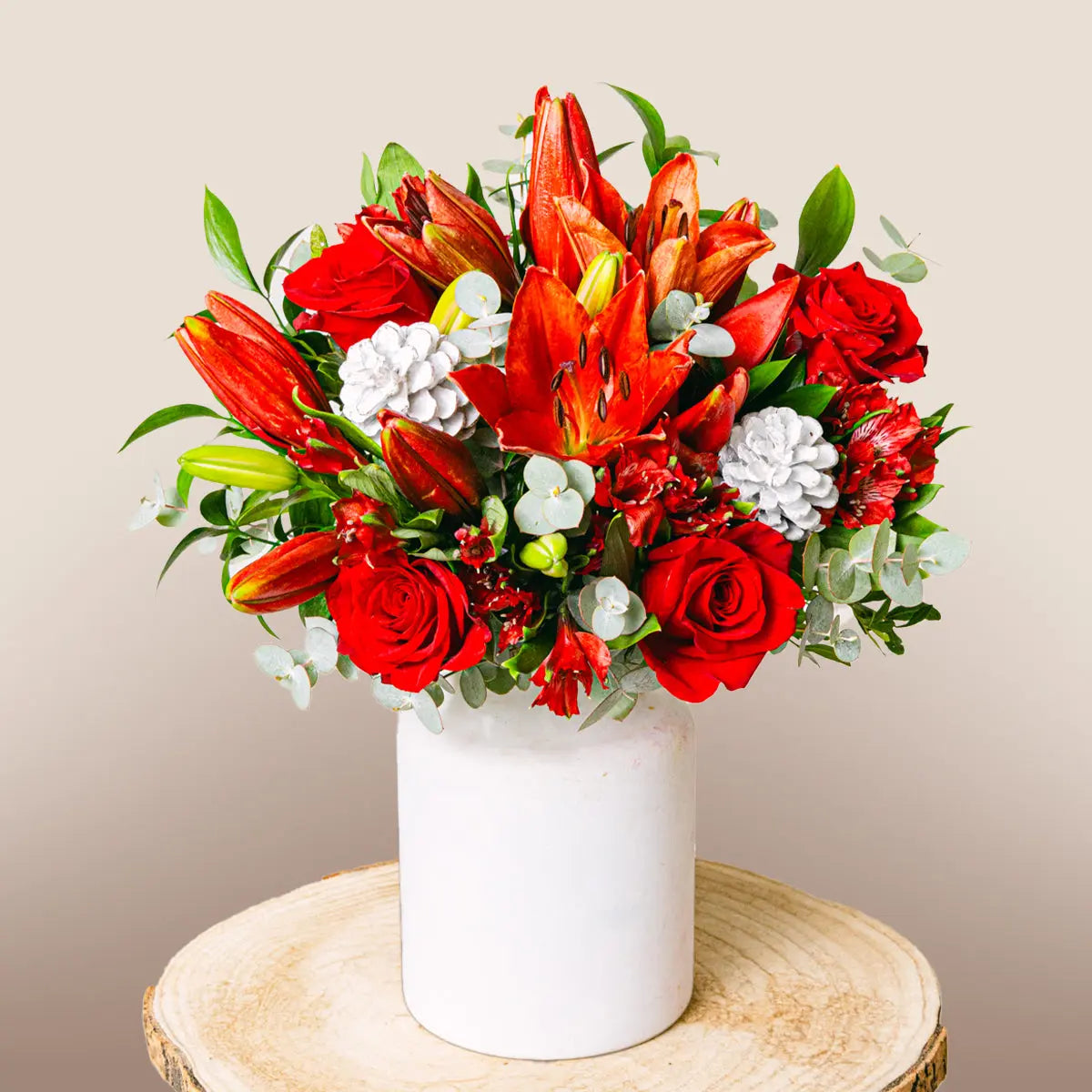 Un bouquet captivant de roses rouges veloutées, de lys rouges vibrants et de charmantes alstrœmerias, magnifiquement complété par une verdure luxuriante et des pommes de pin rustiques pour une touche festive.