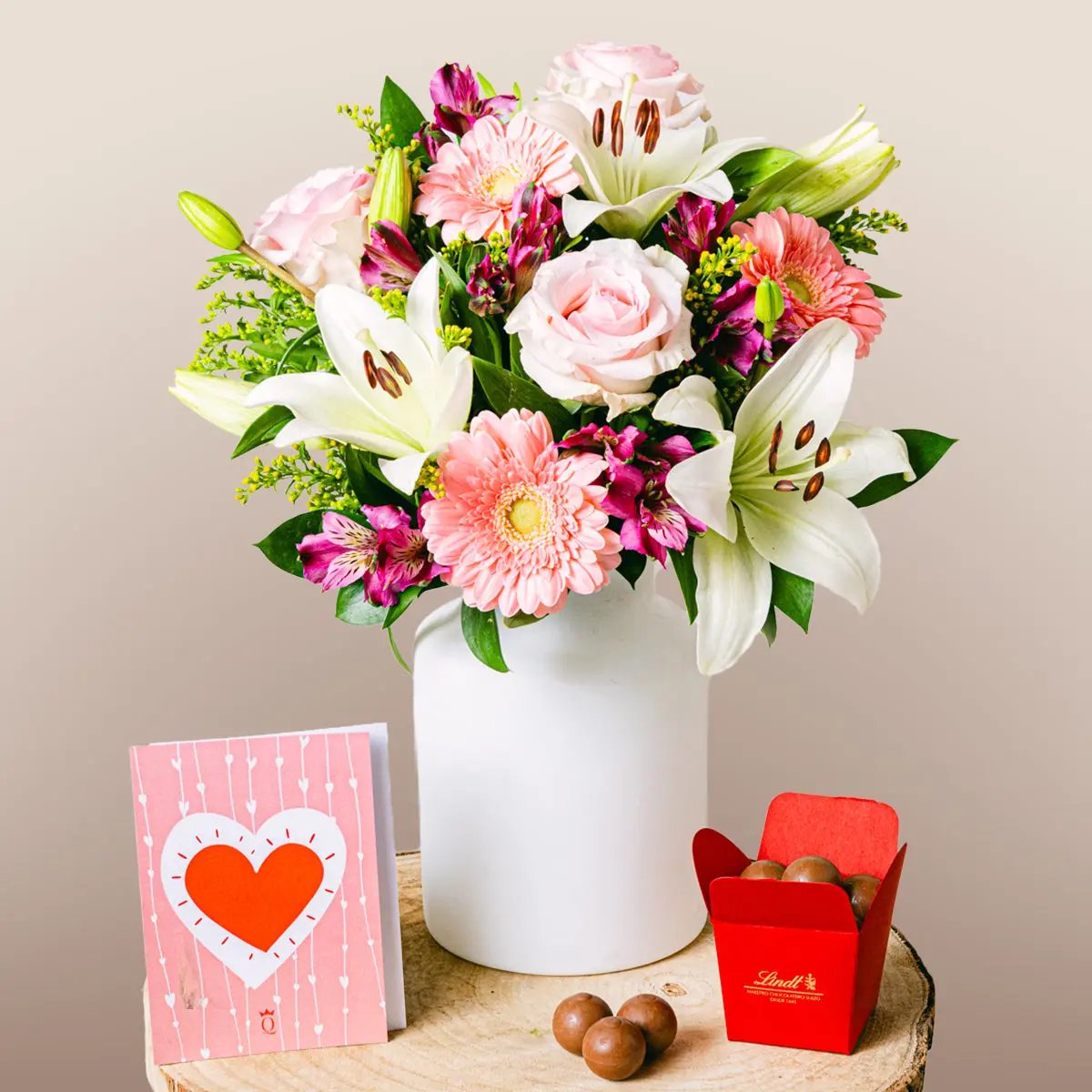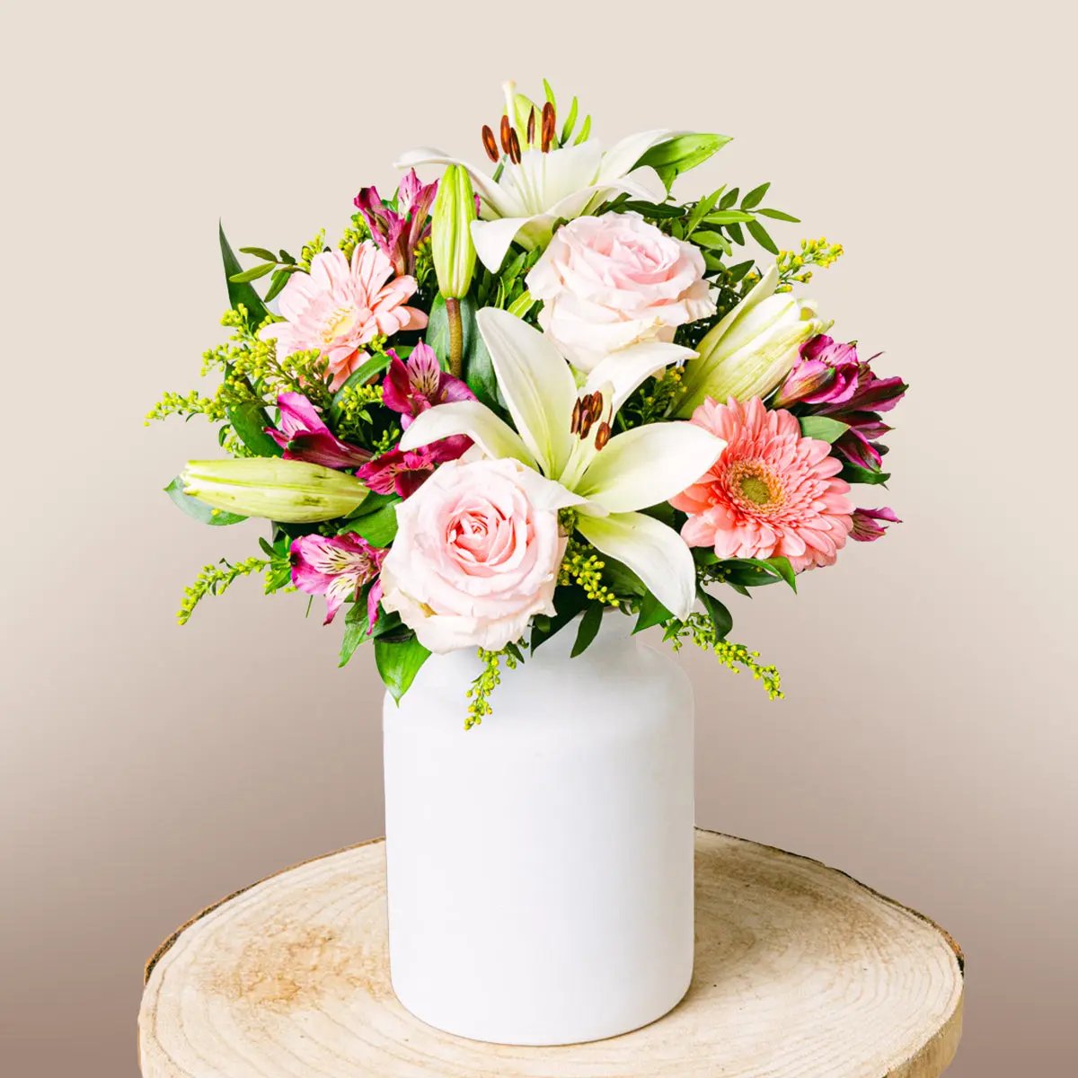 Le blanc pur des lys représente la paix, le rose des gerberas exprime la tendresse et les alstroemerias mauves symbolisent l’amitié durable. Ensemble, ces fleurs créent un bouquet réconfortant et sincère.