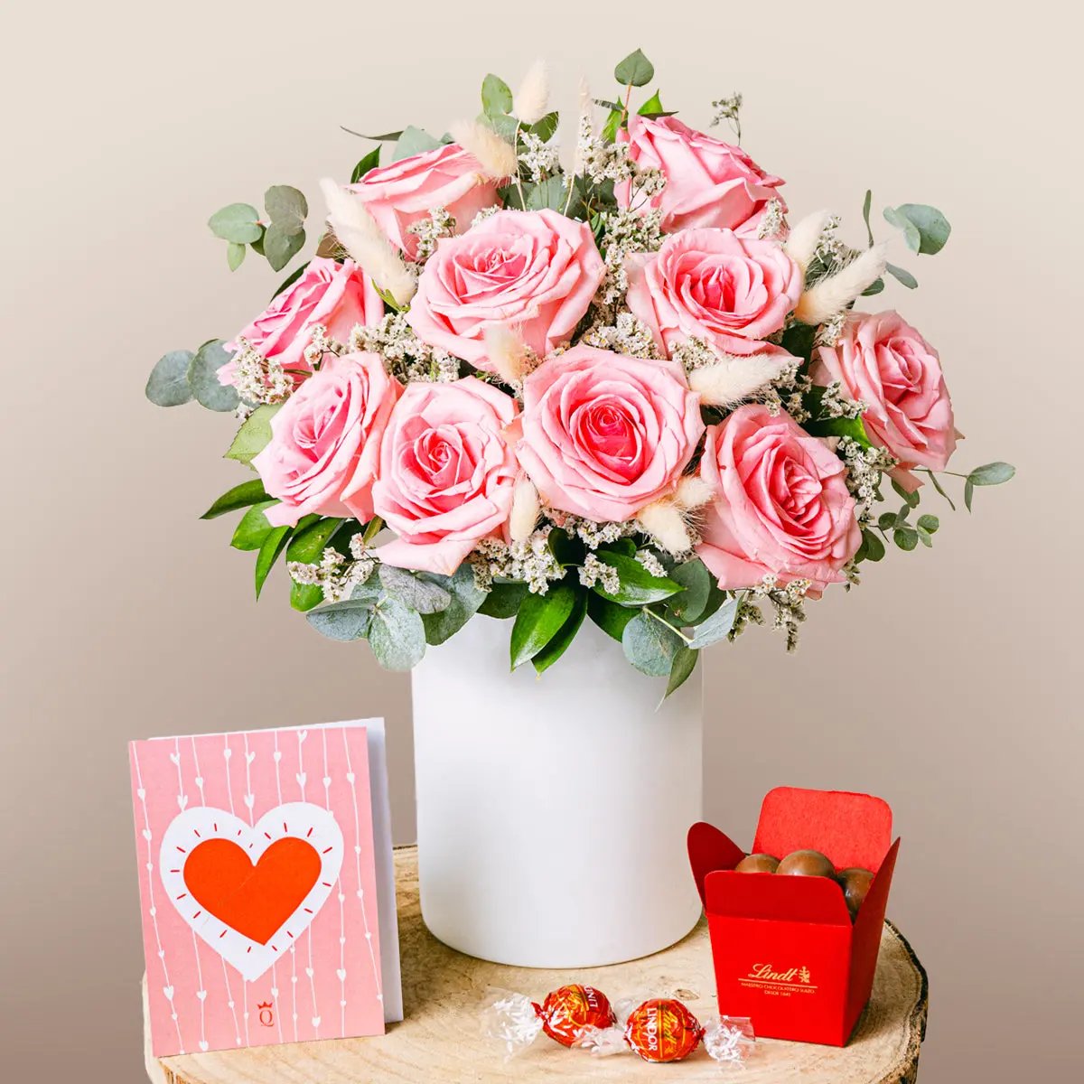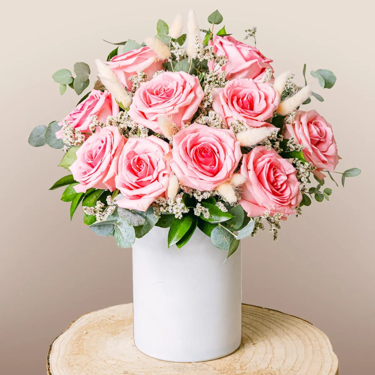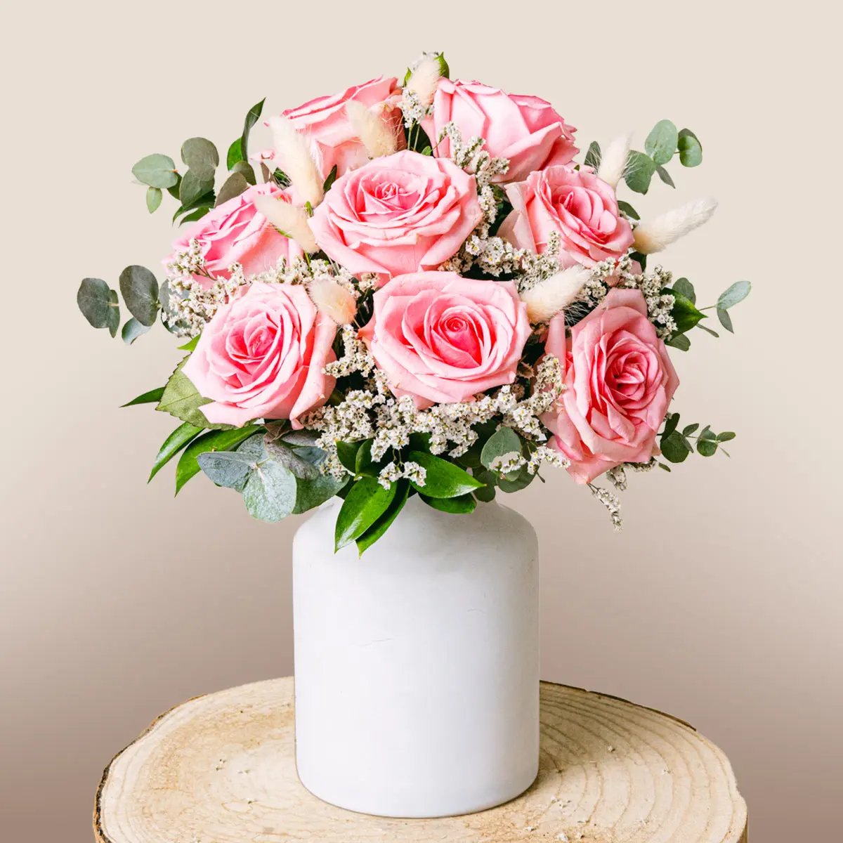 La douceur des roses roses s'allie à la pureté du limonium blanc pour créer un bouquet d'une délicatesse infinie. Un cadeau idéal pour exprimer l'affection, la gratitude et la tendresse.
