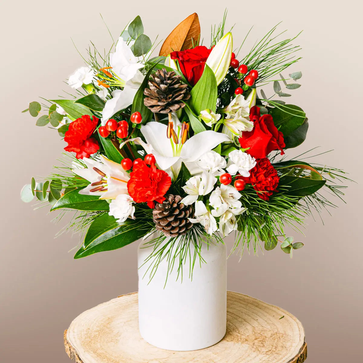 Un bouquet élégant de lys blancs, d'alstrœmerias délicates et d'œillets doux, orné de roses rouges vibrantes, de pin parfumé et de baies d'hypericum joyeuses pour une touche festive et intemporelle.