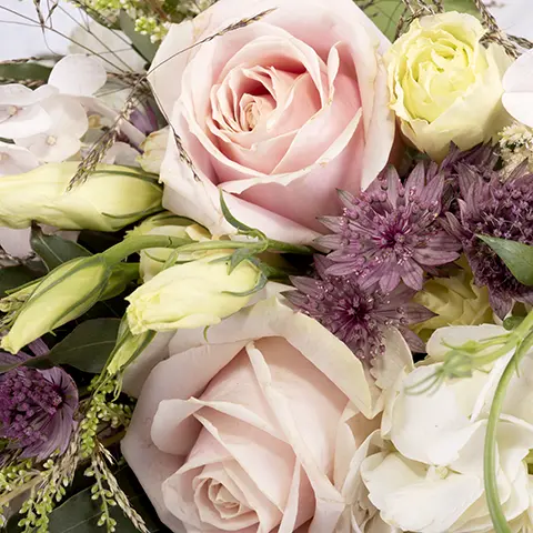 Retrouvez la douceur et la beauté de la nature, sélectionnées spécialement pour vous, dans ce magnifique bouquet de fleurs fraîches. De délicates roses, entrecoupées d'hortensias blancs, créent une base exquise et soyeuse sur laquelle le reste de la composition oscille. Les arums apportent une touche de magie grâce à leur fleur exotique en spirale, tandis que la véronique apporte des notes de force, de courage et de persévérance à la composition. Offrez un bouquet débordant de bonnes sensations avec cette option VIP d'une élégance suprême.