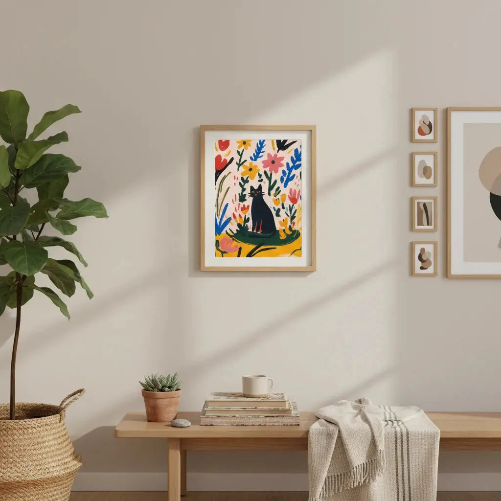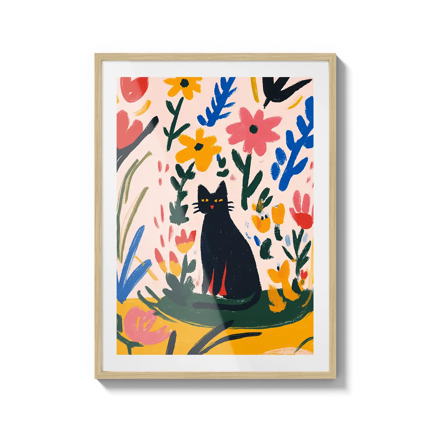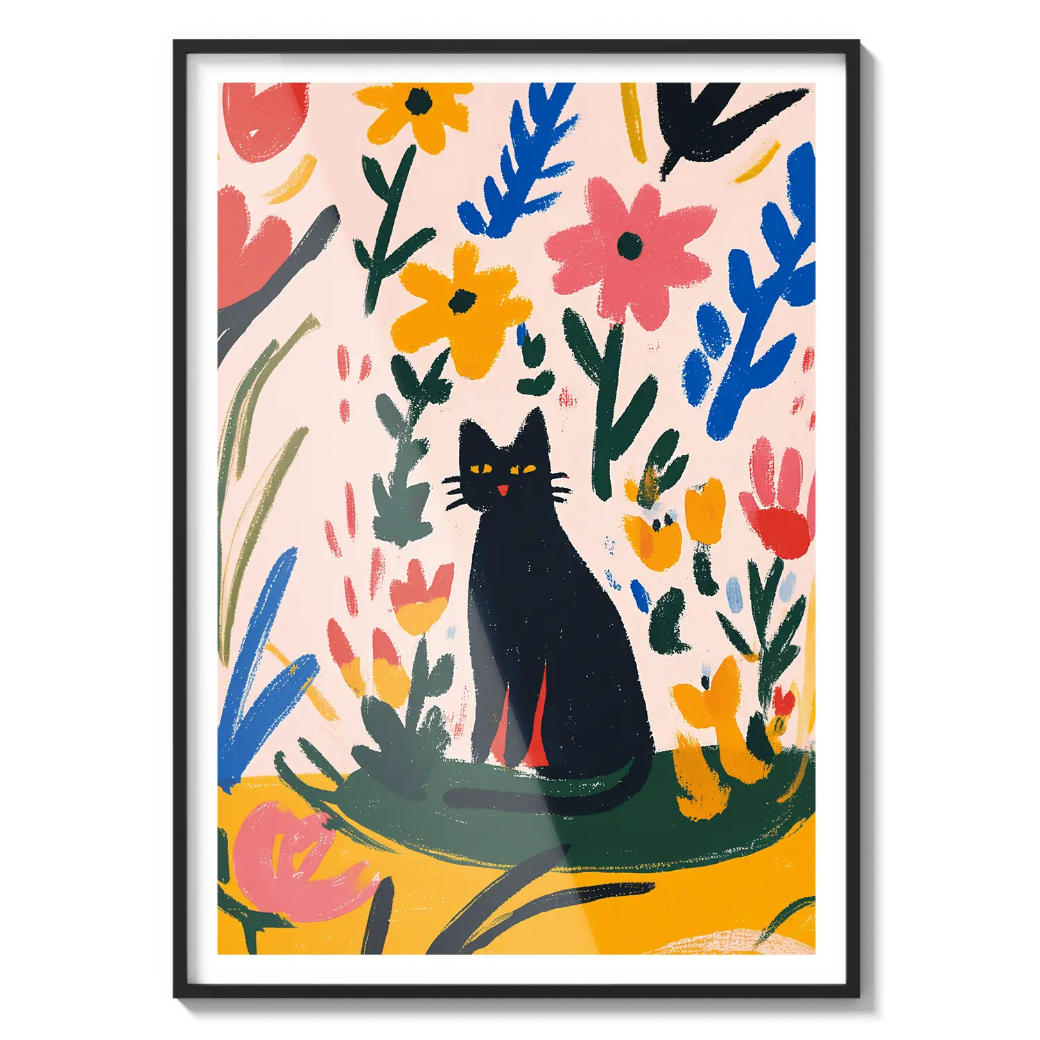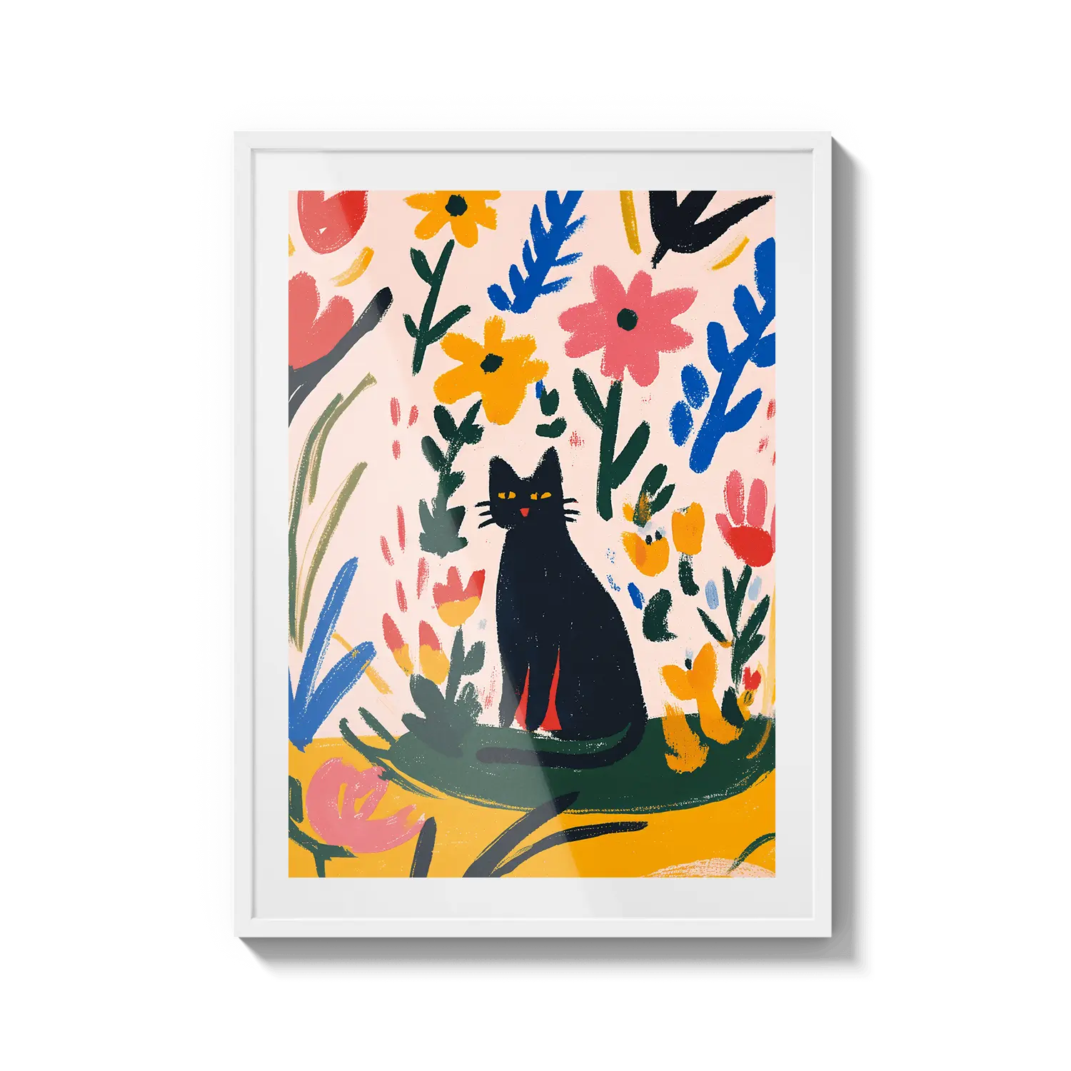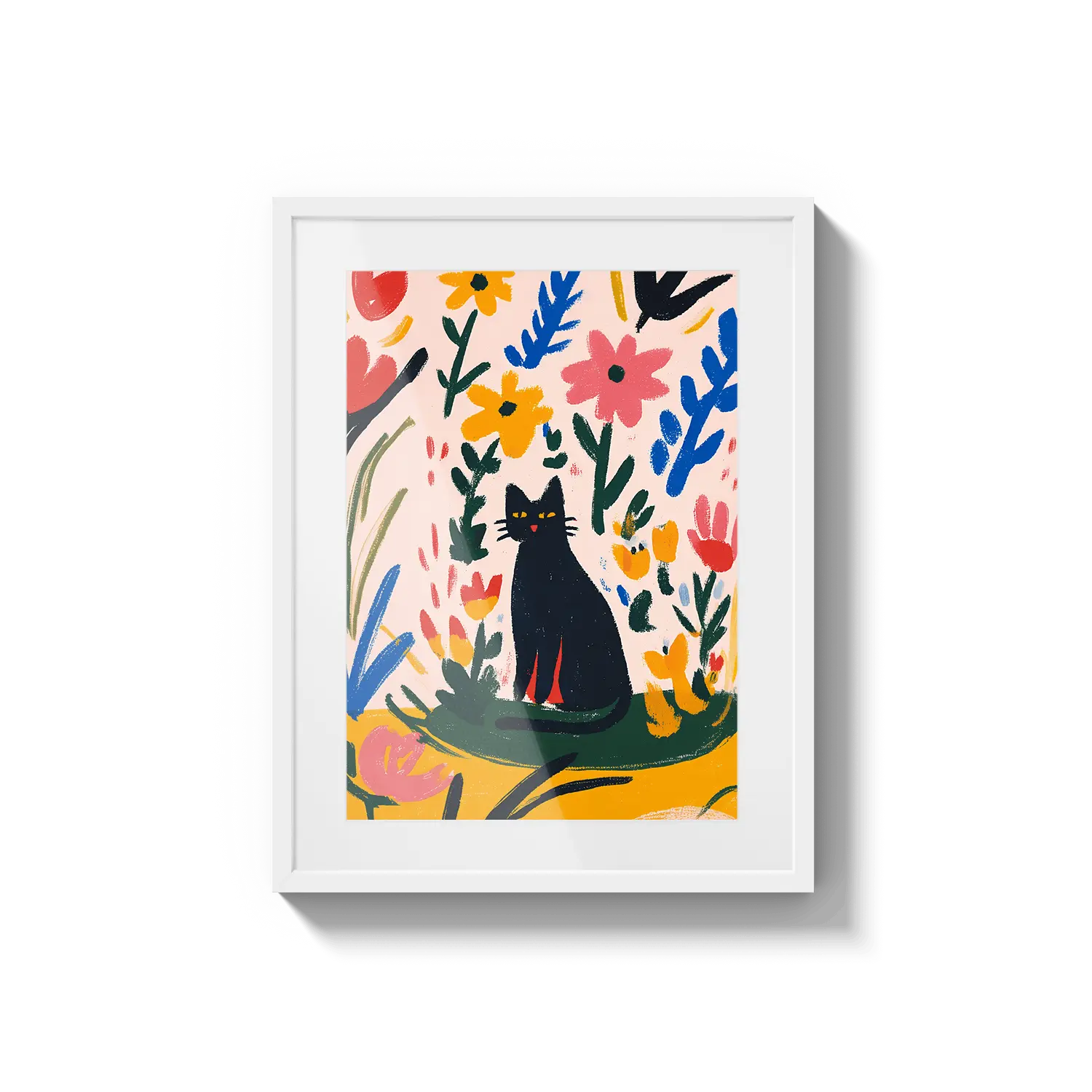Une charmante scène graphique d'un chat se reposant parmi des feuilles colorées, rayonnant d'une chaleur joyeuse. Un joli cadeau pour égayer la journée de quelqu'un.