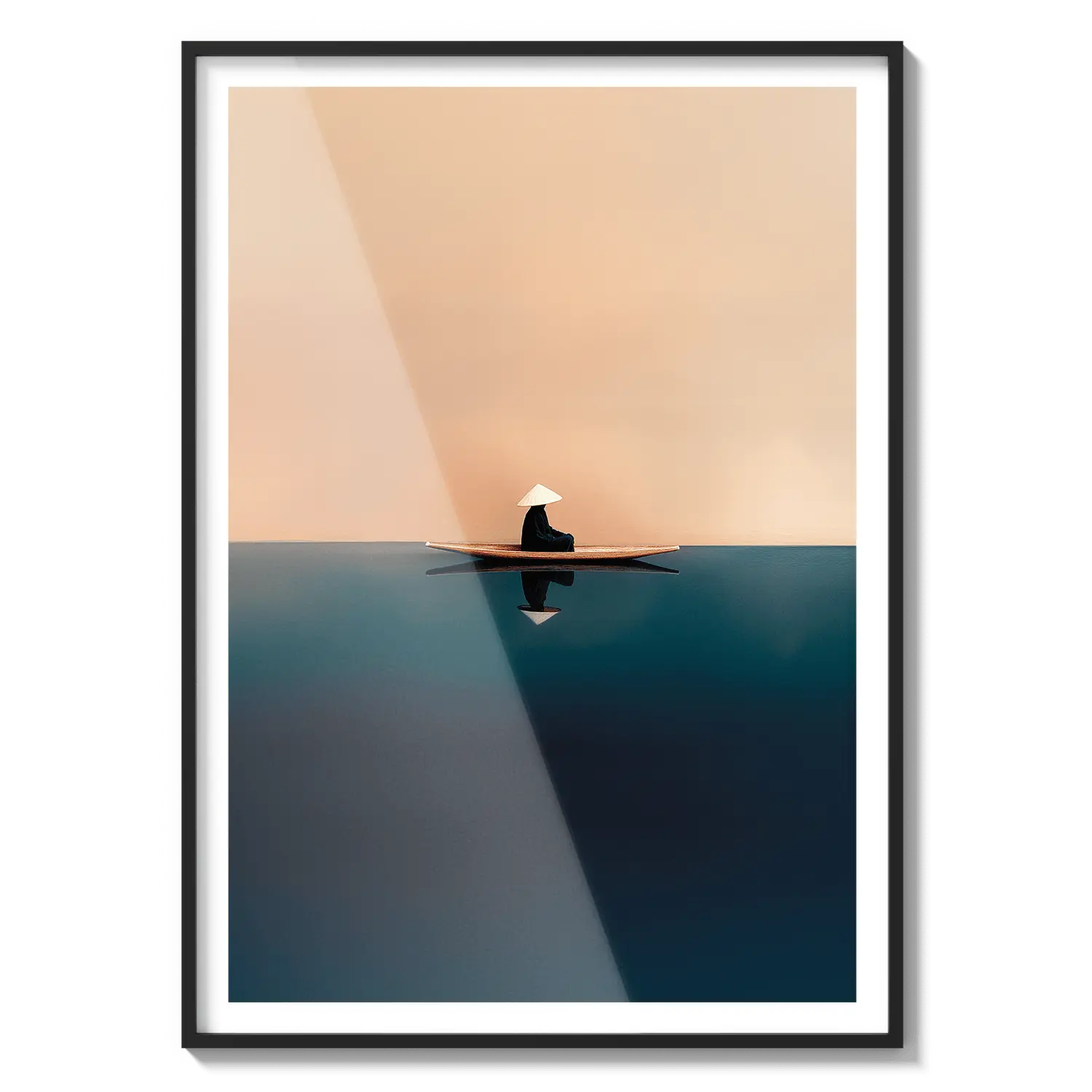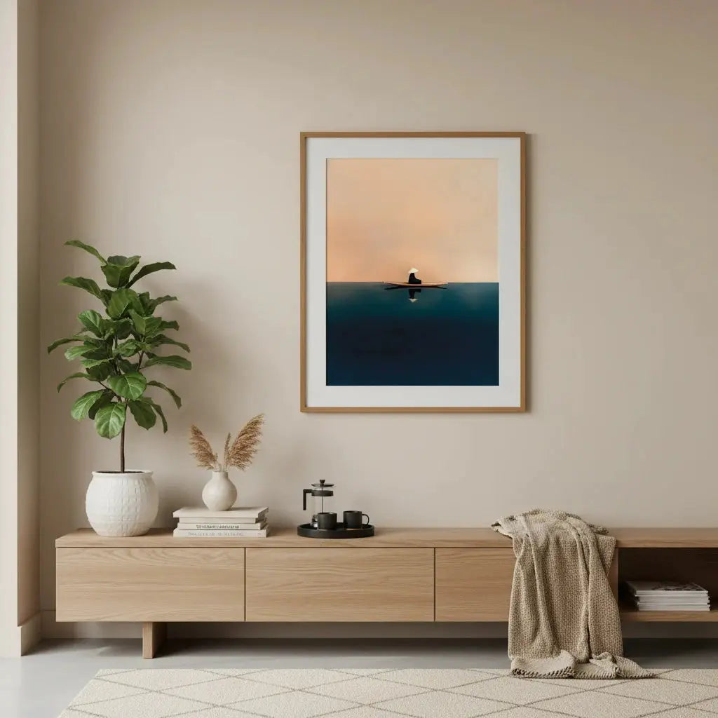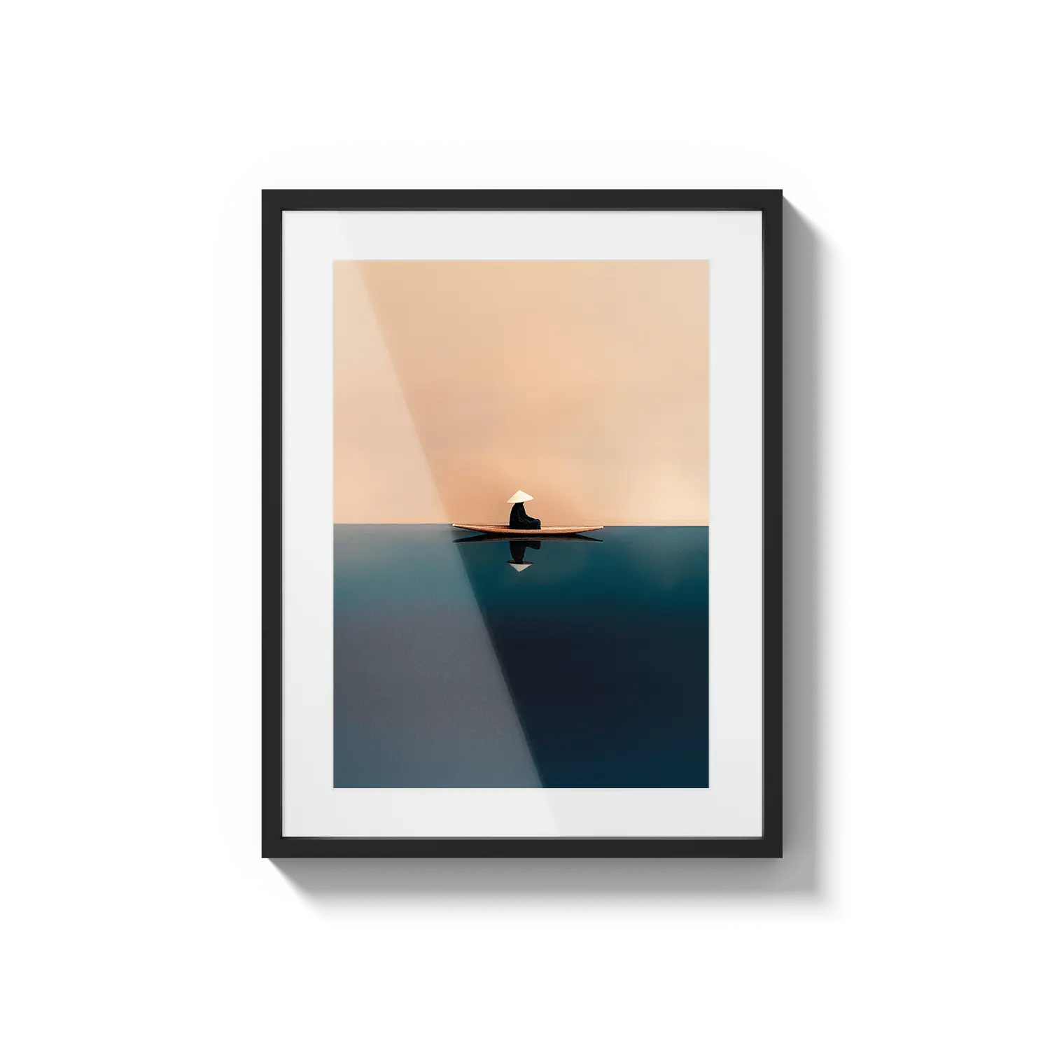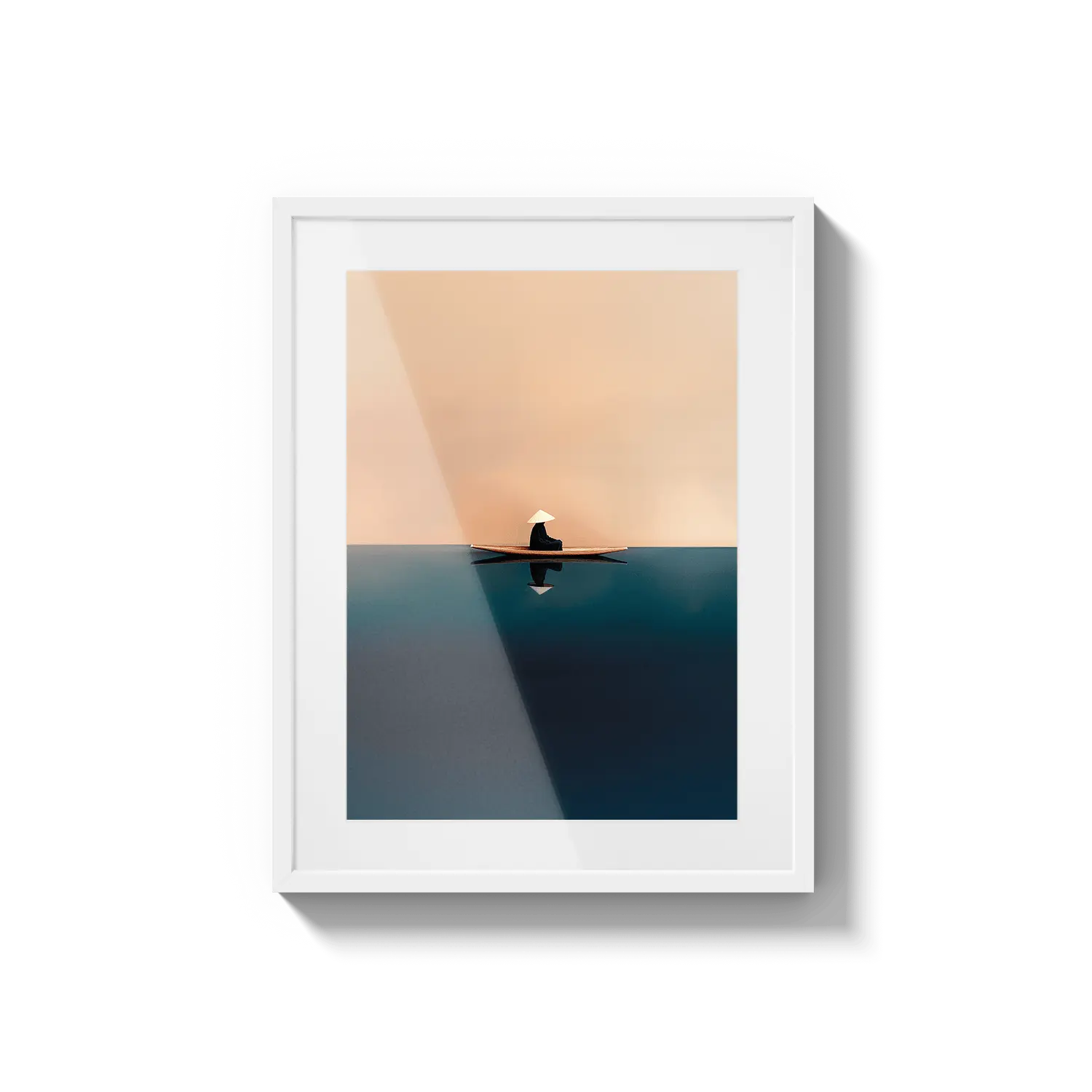 Un voilier tranquille dérivant sur des eaux douces orange et bleues, offrant calme et contemplation. Un cadeau paisible et apaisant.