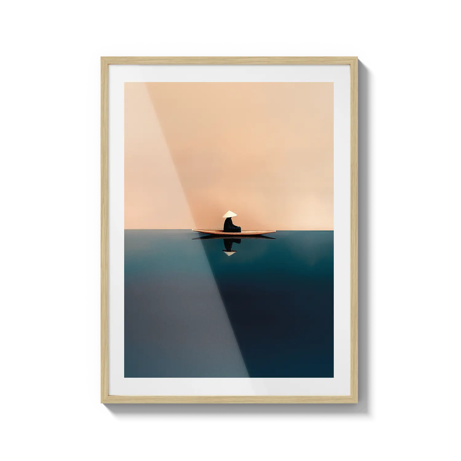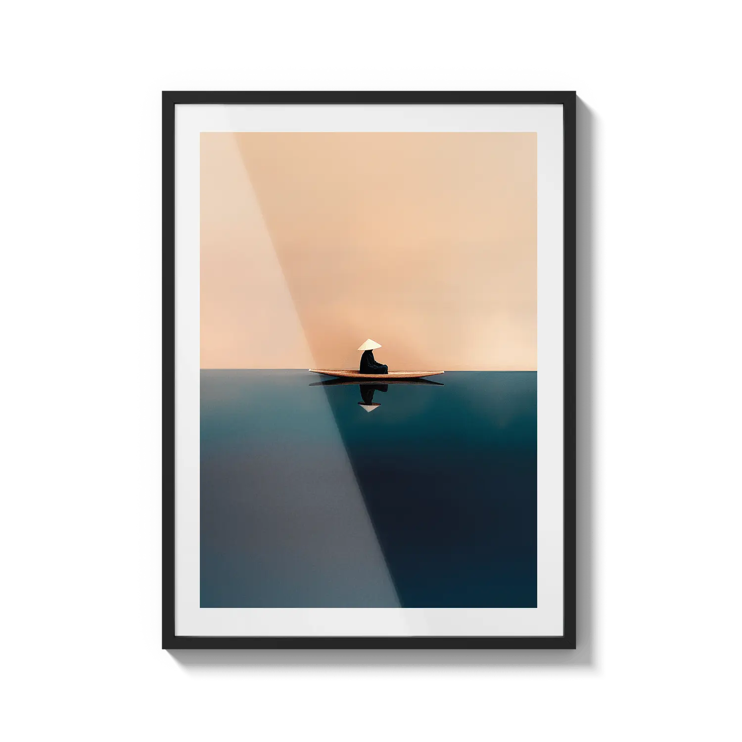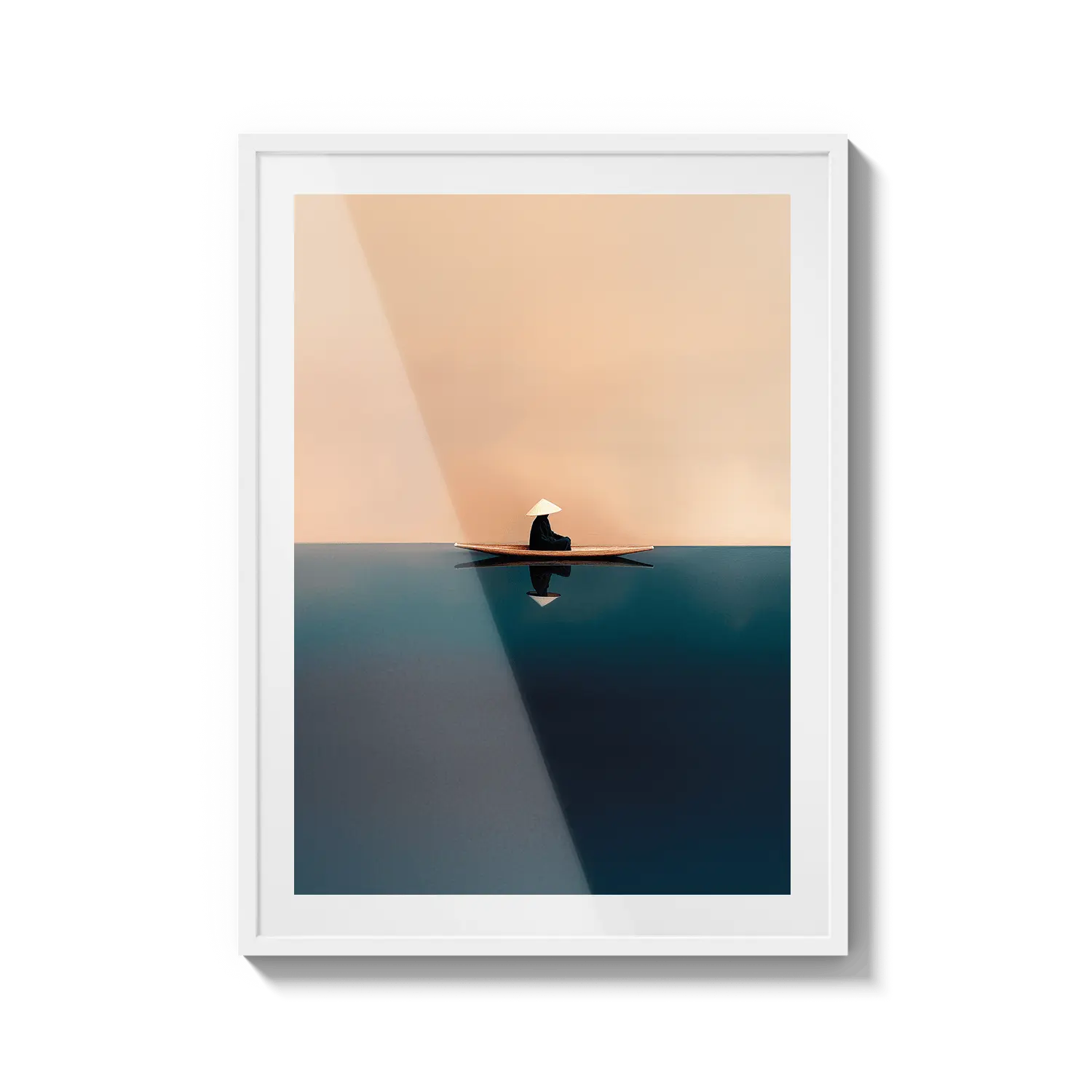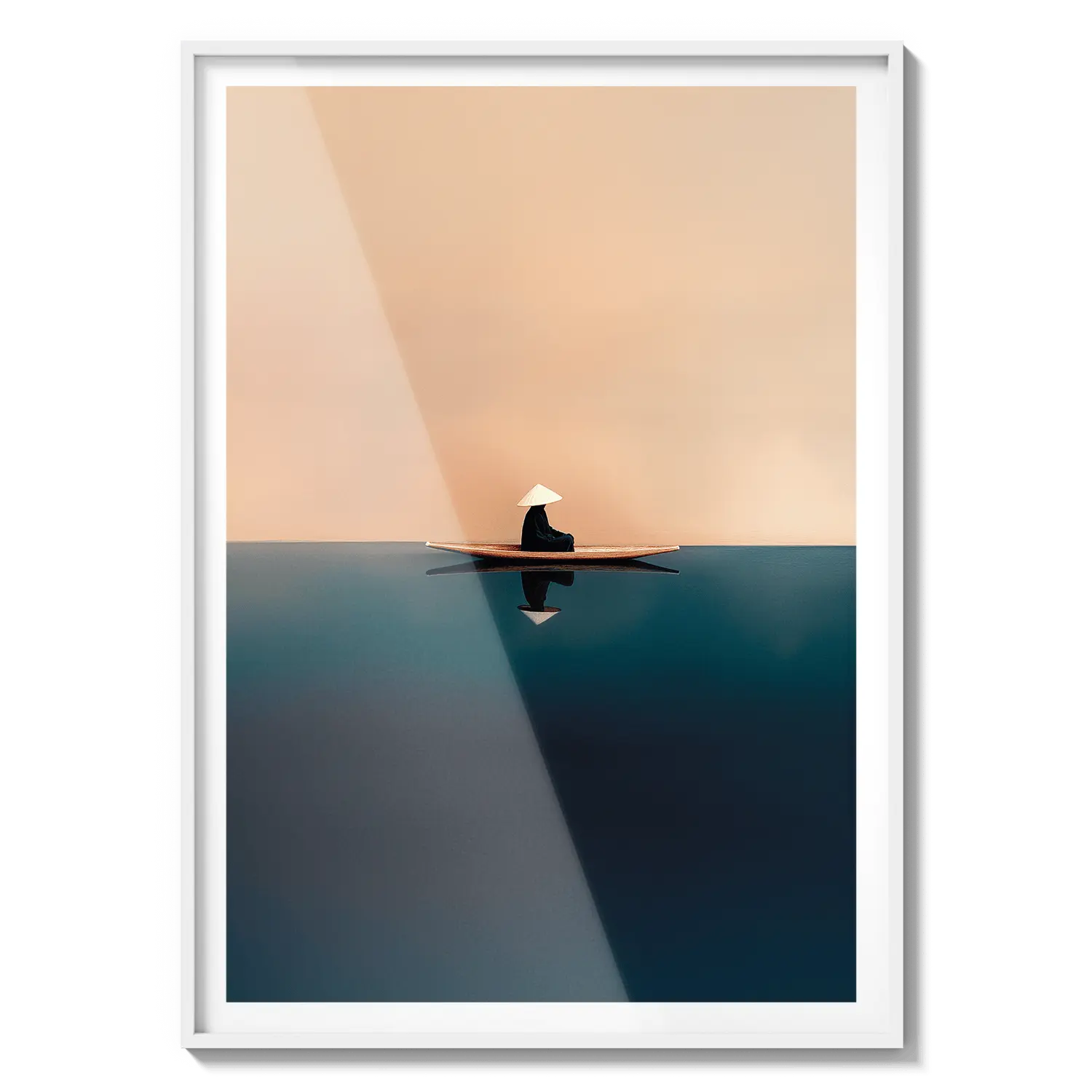 Un voilier tranquille dérivant sur des eaux douces orange et bleues, offrant calme et contemplation. Un cadeau paisible et apaisant.