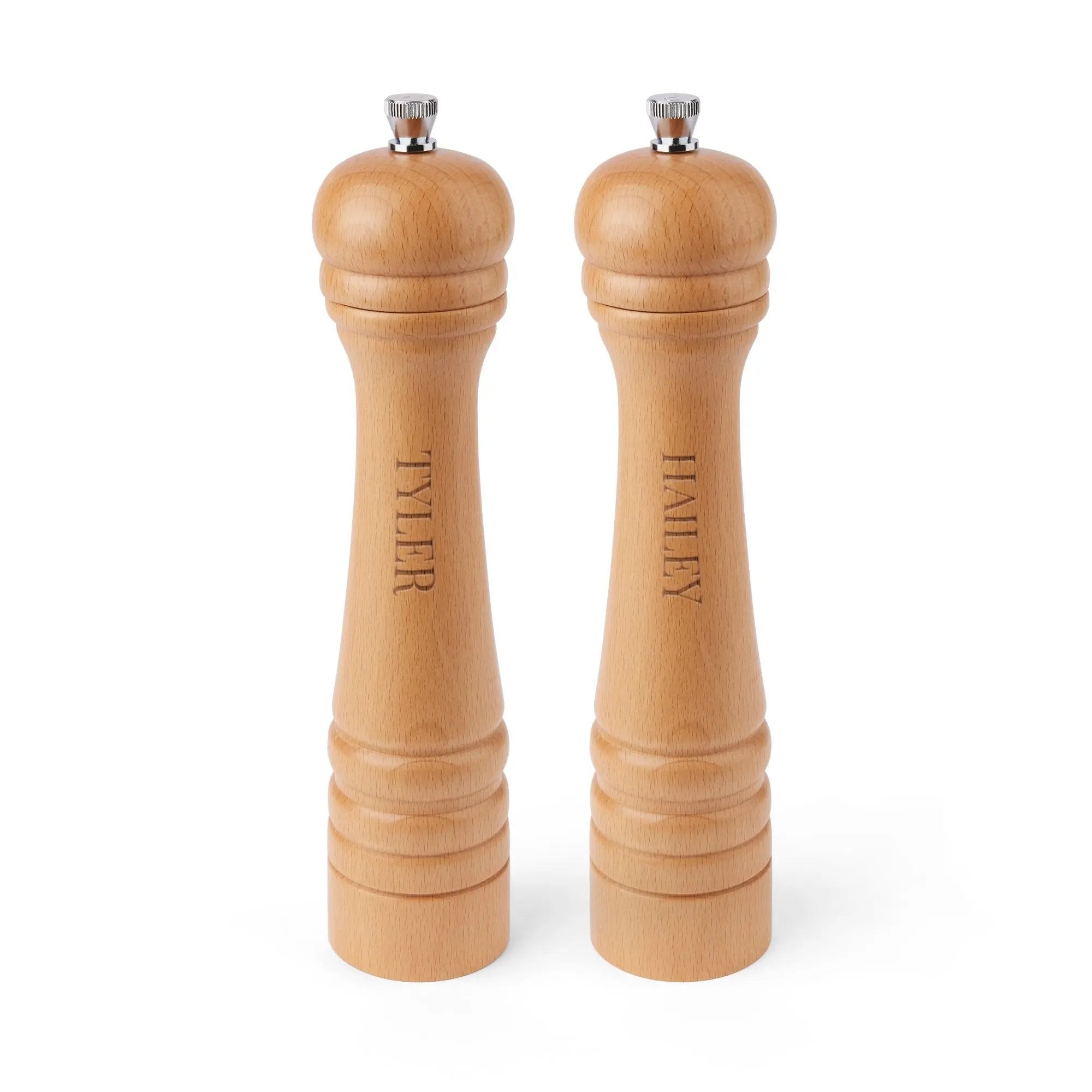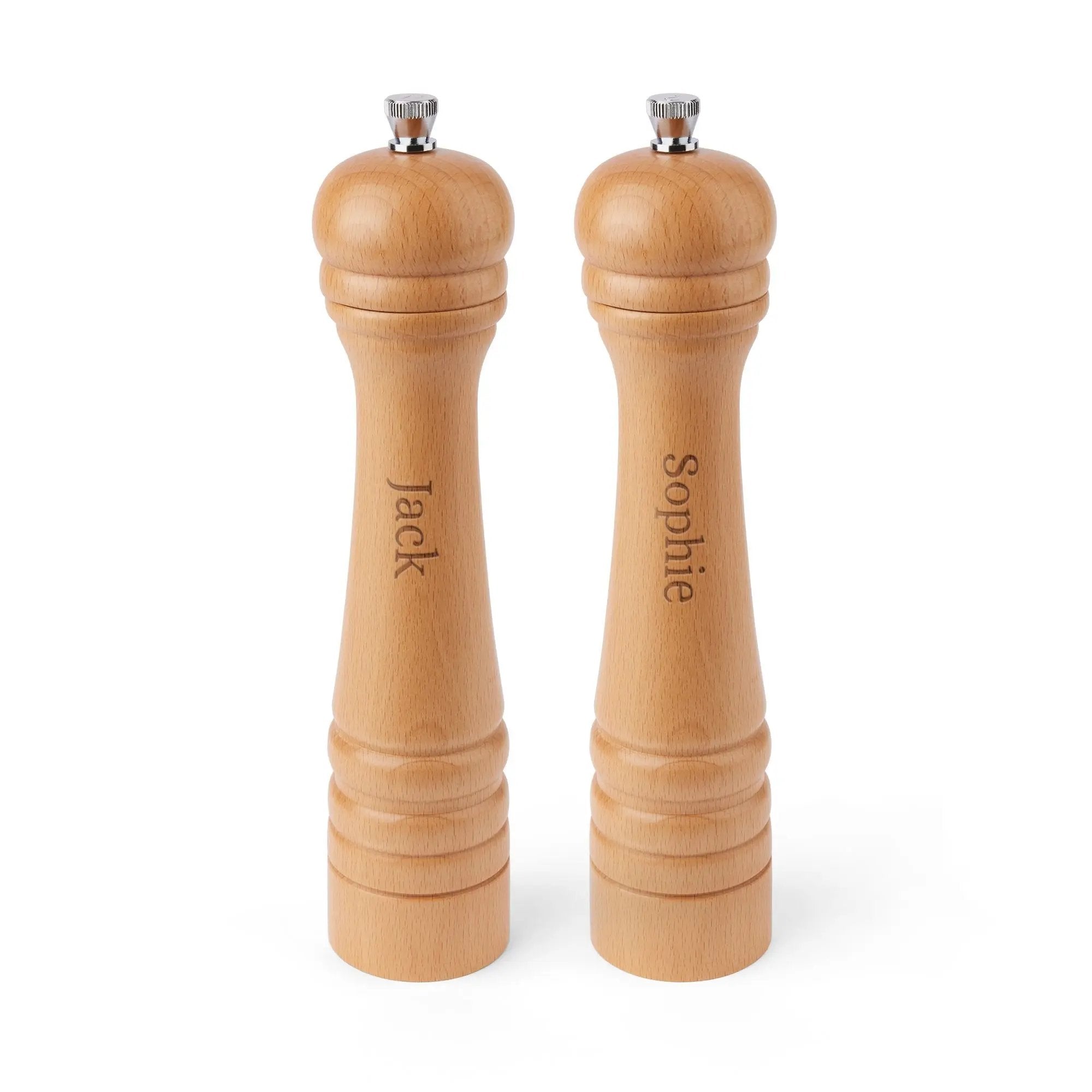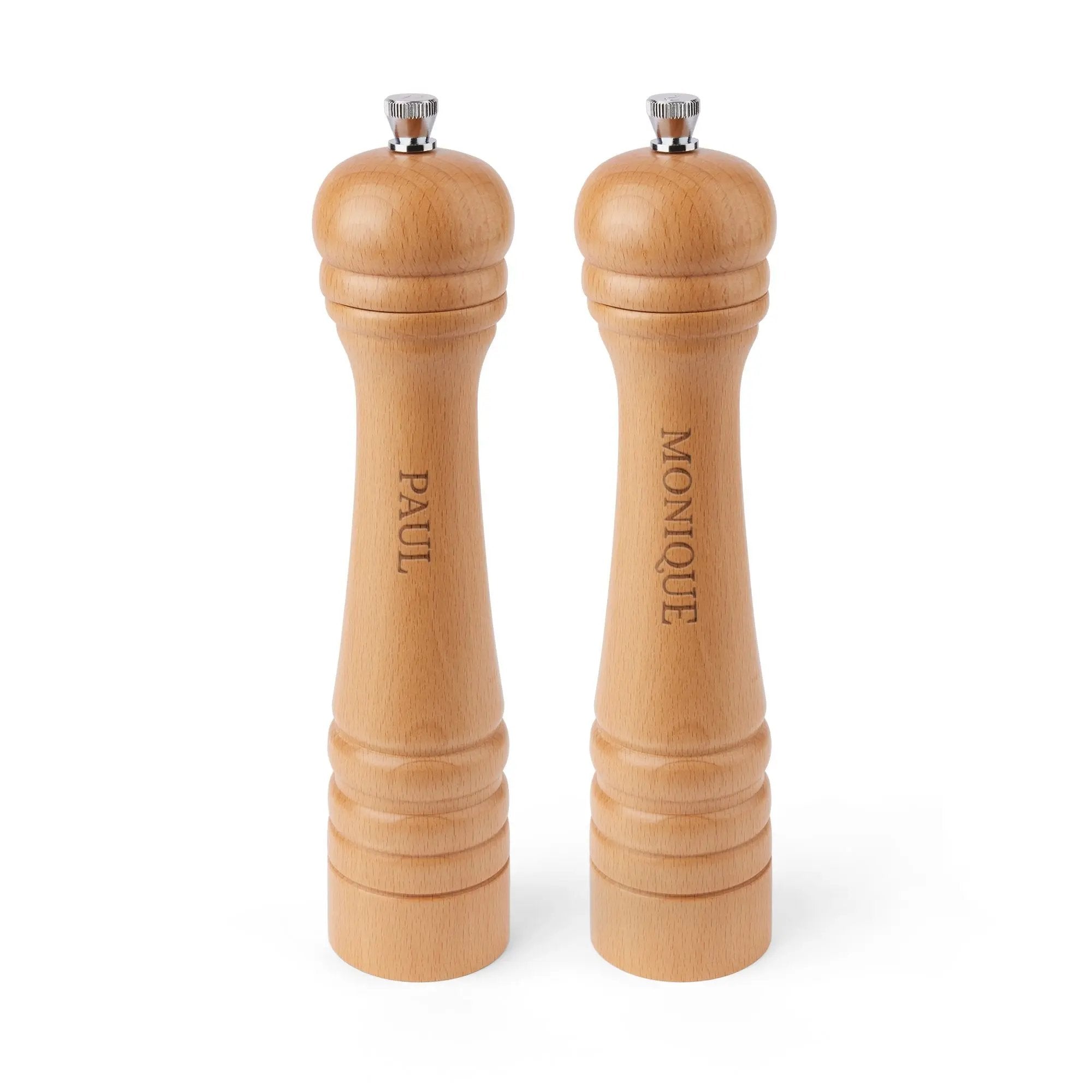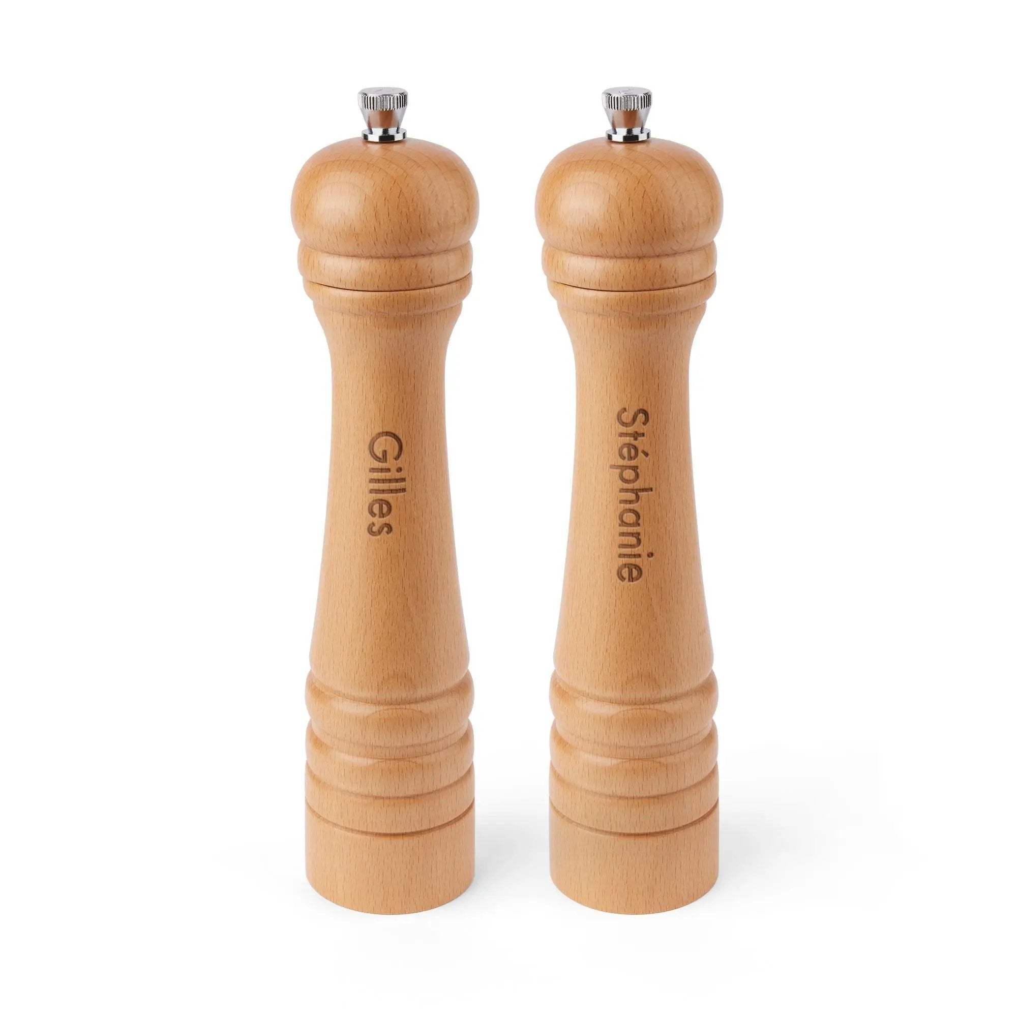 Rehaussez votre collection d'ustensiles de cuisine avec notre moulin à poivre personnalisé en bois, d'une fabrication exquise. Fabriqué en hêtre de haute qualité, ce moulin à poivre se distingue par son design élégant et son excellence fonctionnelle. Grâce à son mécanisme de broyage robuste, il garantit efficacité et longévité. Son atout majeur est la possibilité de personnalisation : vous pouvez y graver le nom de votre choix pour une touche personnelle et charmante. Idéal pour le poivre et le sel, c'est un outil polyvalent pour tous les chefs. Sa finition naturelle sophistiquée s'harmonise avec tous les styles de cuisine, ce qui en fait un cadeau idéal pour une pendaison de crémaillère, un mariage ou pour les amateurs de cuisine. Facile à remplir et à utiliser, ce moulin à poivre allie praticité et élégance. Veuillez noter qu'en raison du matériau naturel, le grain du bois peut varier, ajoutant un caractère unique à chaque pièce. Adoptez l'art culinaire avec un moulin qui est à la fois un témoignage de savoir-faire artisanal et un souvenir personnalisé.