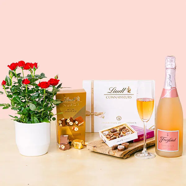 {"type":"root","children":[{"type":"paragraph","children":[{"type":"text","value":"It includes:"}]},{"type":"list","listType":"unordered","children":[{"type":"list-item","children":[{"type":"text","value":"Red Rose Plant."}]},{"type":"list-item","children":[{"type":"text","value":"Carta Rosé Cava (75cl)."}]},{"type":"list-item","children":[{"type":"text","value":"Lindt Mini Pralines (44g)."}]},{"type":"list-item","children":[{"type":"text","value":"Lindt Du Confiseur (250g)."}]},{"type":"list-item","children":[{"type":"text","value":"Lindt Nuxor Milk Ballotin (165g)."}]}]}]}