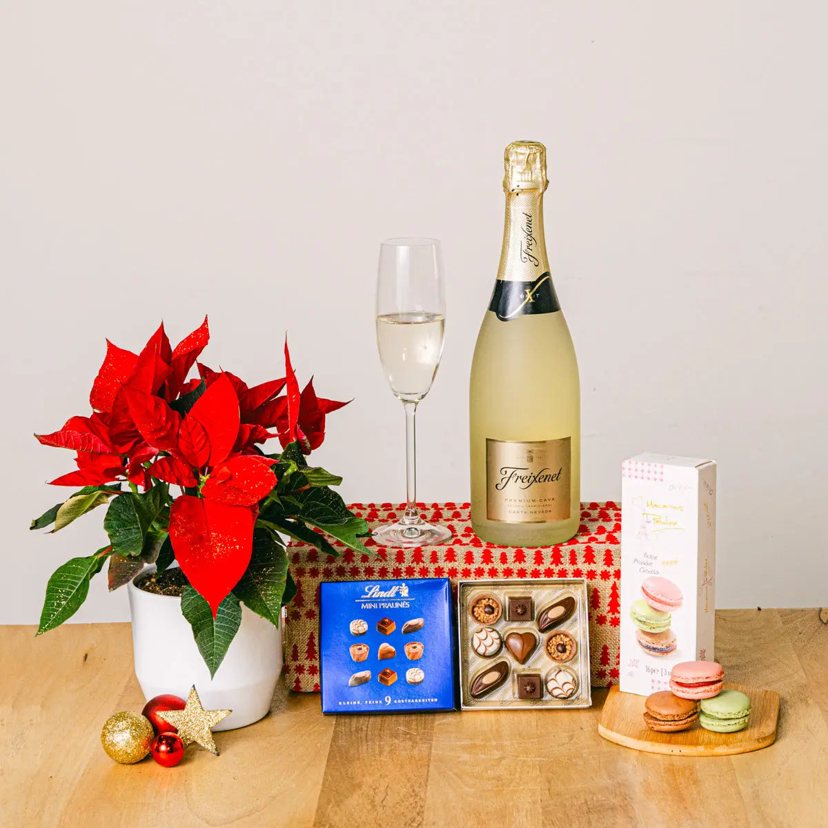 Le magnifique poinsettia est associé à l'arrivée d'un nouveau départ, et sa couleur vive symbolise l'espoir et la joie pour la nouvelle année. À côté, une bouteille de vin mousseux (parfait pour un toast du Nouvel An !) et une sélection de délicieuses douceurs. Une façon élégante de transmettre joie et vœux à vos proches tout en célébrant le début de l'année 2025. Ce cadeau comprend : - Un poinsettia en pot. - Une bouteille de vin mousseux Freixenet Carta Nevada. - Une sélection de mini pralinés au chocolat suisse, 44 g. - Un assortiment de macarons, 36 g.