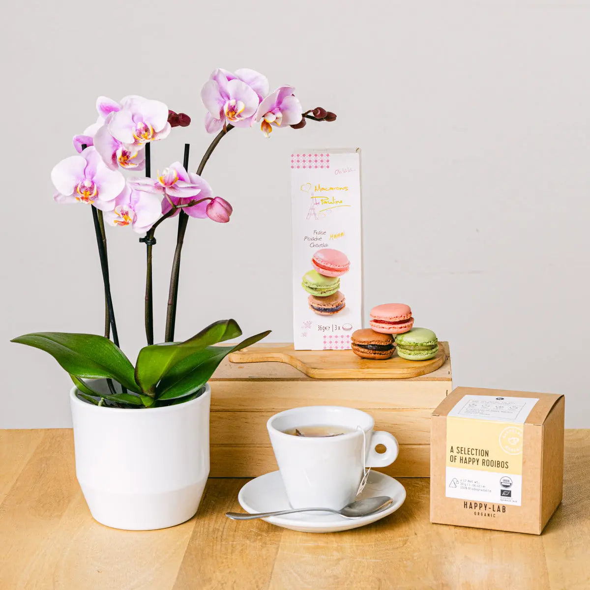 Offrez un cadeau à un être cher avec un panier cadeau composé de thé et d'une magnifique mini-orchidée ! Notre panier cadeau déborde de saveurs. Le thé sélectionné pour ce panier est un mélange unique de saveurs premium. Pour compléter le cadeau, une magnifique mini-orchidée, aux couleurs et au parfum exquis, saura égayer tous les invités. Ce panier cadeau est idéal pour réconforter un être cher en toute occasion. Offrez-lui le sourire avec ce cadeau exceptionnel !