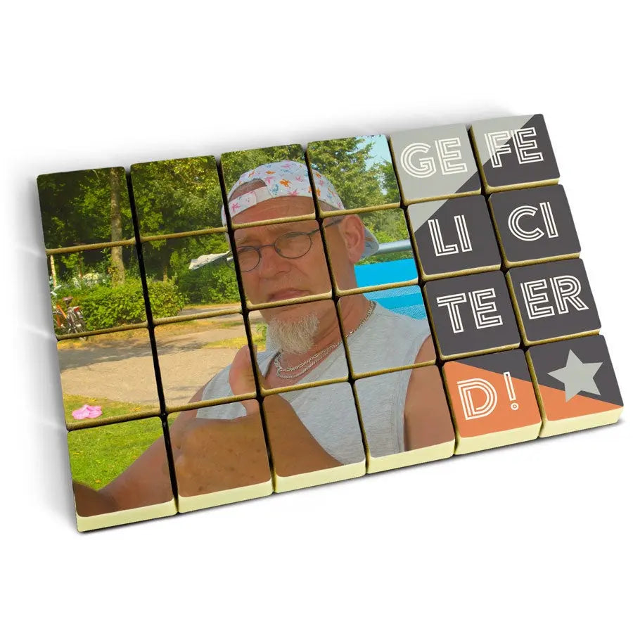 Plus d'informations sur la photo des pralines au chocolat :Quantité : 24 chocolatsChocolat : chocolat au lait avec une couche de chocolat blanc sur le dessusGarniture : pralinéDimensions par chocolat : 2,6 x 2,6 x 1,2 cmDimensions par ensemble : 23 x 18 x 2,5 cmPersonnalisation : imprimé avec photo ou logoImpression : impression comestible en couleurLorsque la température extérieure est de 25 degrés Celsius ou plus, nous ne pourrons pas garantir la qualité du chocolat.Conseils de conservation : Peut être conservé jusqu'à 10 semaines dans un endroit frais et sombre entre 14 et 18 °C. Informations allergènes : contient du soja, du lait et peut contenir des traces de fruits à coque et de gluten. Ingrédients : Pralinés au chocolat fourrés aux noisettes et imprimés comestibles : sucre, noisettes, pâte de cacao, beurre de cacao, lait entier en poudre, émulsifiant (lécithine de soja), arôme naturel de vanille. Imprimés comestibles : amidon de maïs, amidon modifié : E1422, fécule de pomme de terre, eau, protéines de poulet en poudre, lait écrémé en poudre, huile d'olive, sel, humectant E422, émulsifiant : E433, colorants : E102, E110, E122 : peut affecter l'activité ou la concentration chez les enfants, E133, E151. Enrobage : E904.
