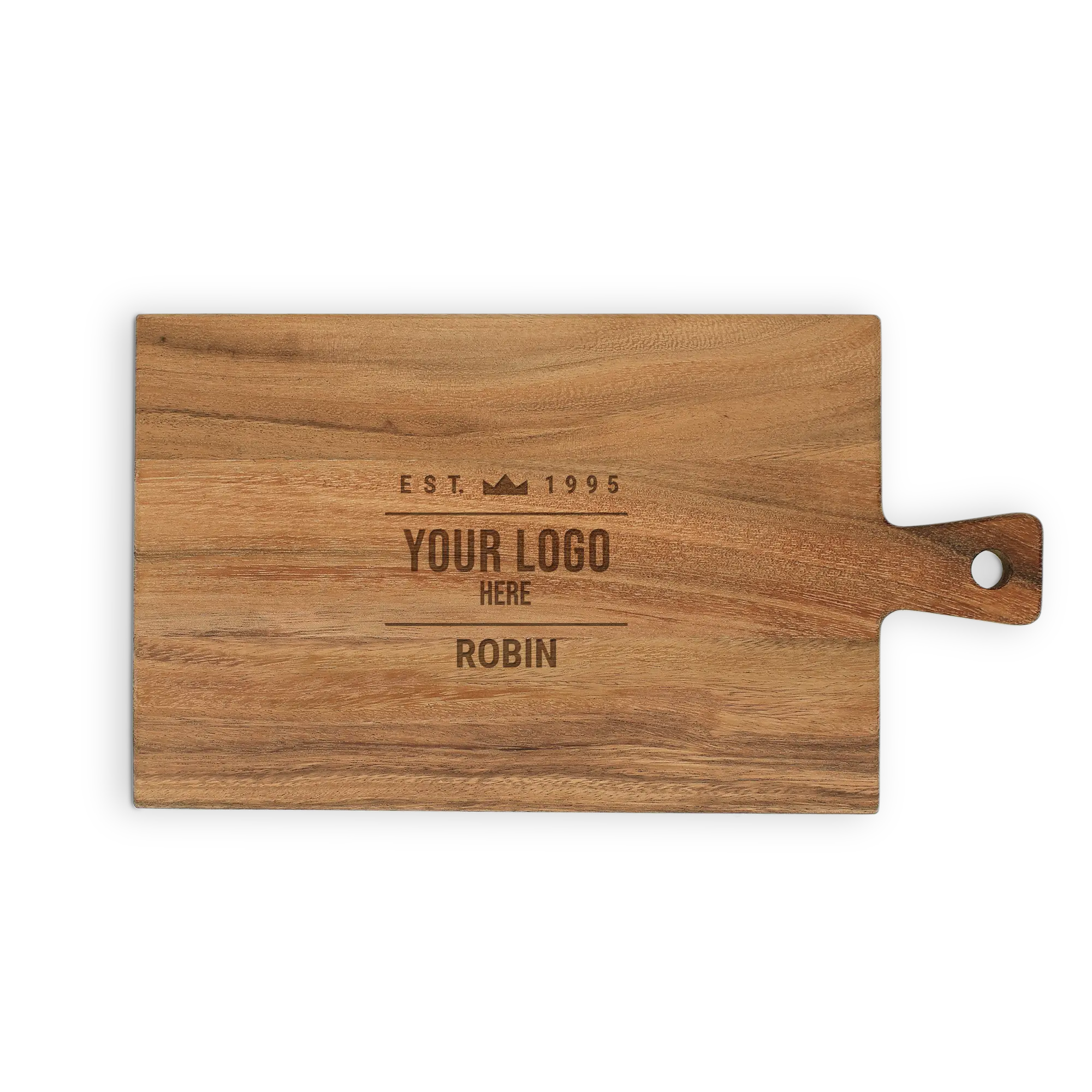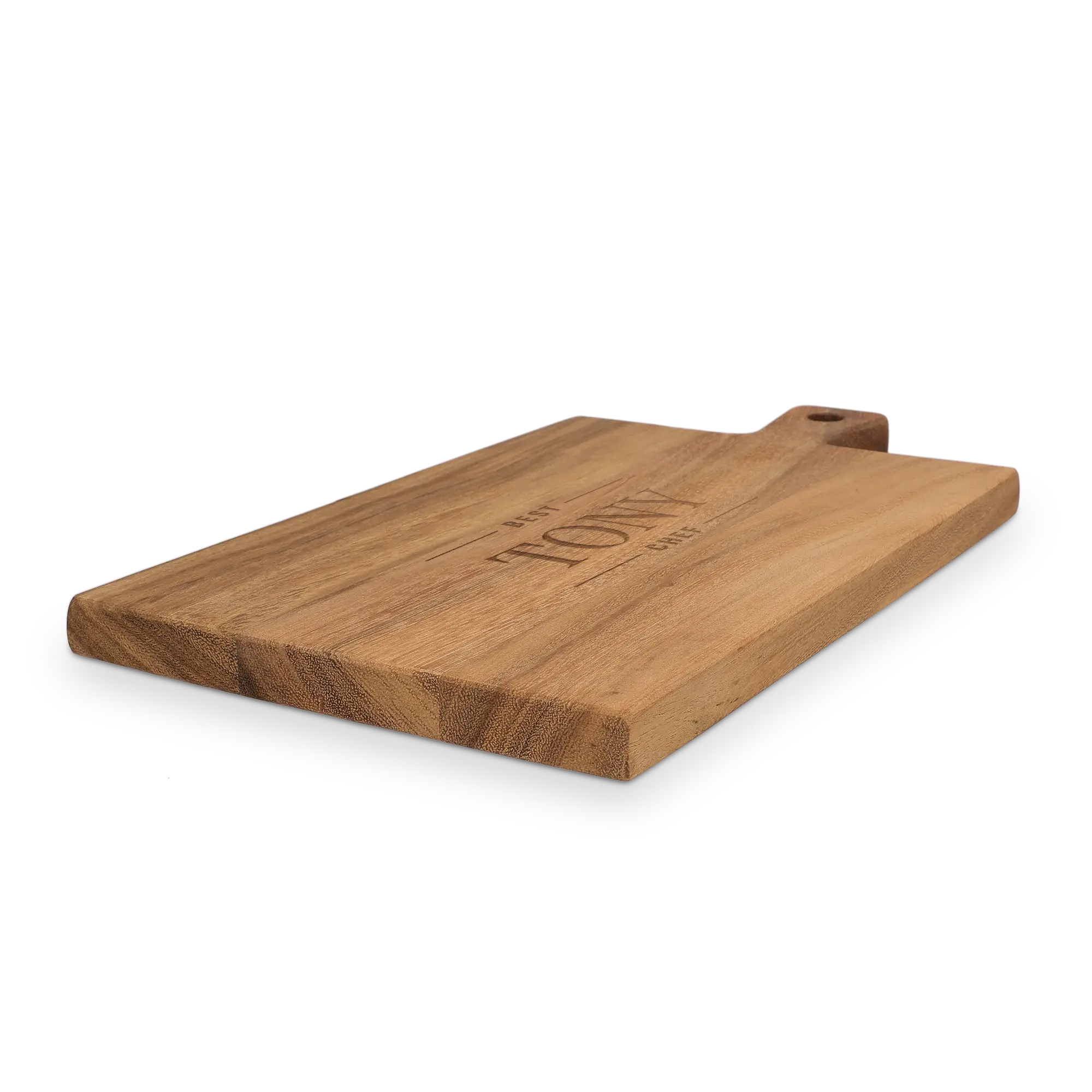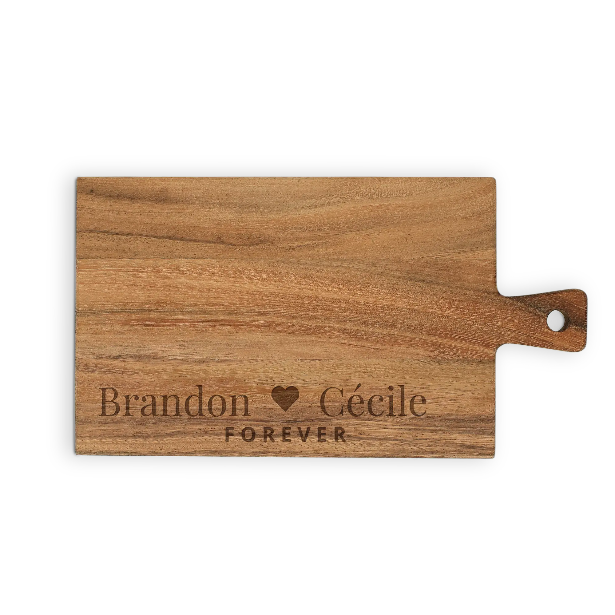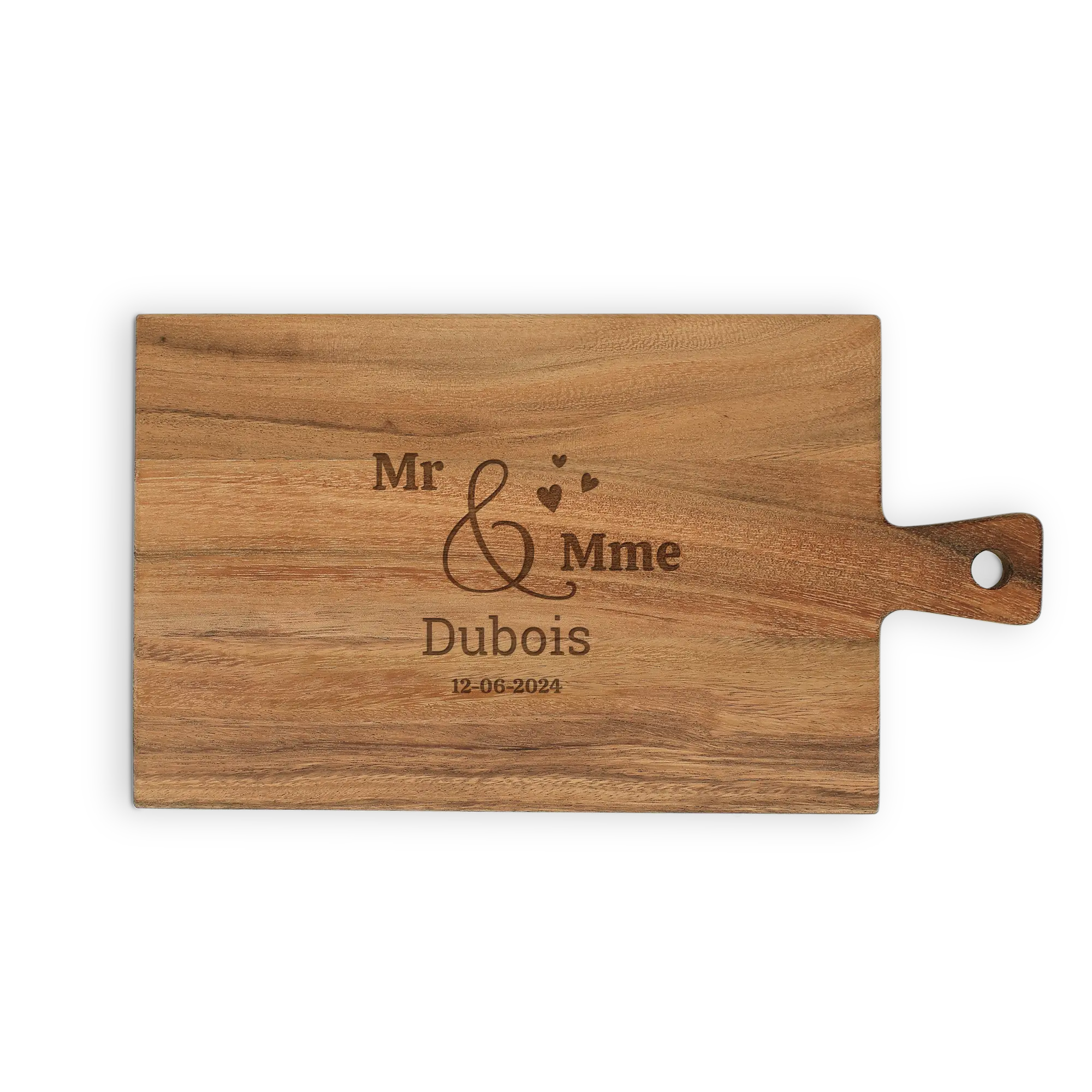 Plus d'informations sur le plateau de service en bois :Matériau : teck massif de haute qualité Finition : huilé et cordon en cuir inclus Dimensions : 34,5 x 20 x 1,5 cm Poids : +/- 460 grammes Personnalisation : gravure de texte Gravure couleur : bois Extra : - Ne convient pas au lave-vaisselle !- Le bois est un produit naturel. Cela signifie que votre cadeau peut différer légèrement de la photo d'exemple.Malheureusement, pour des raisons techniques, il n'est pas possible de traiter les caractères cyrilliques, turcs ou spéciaux.