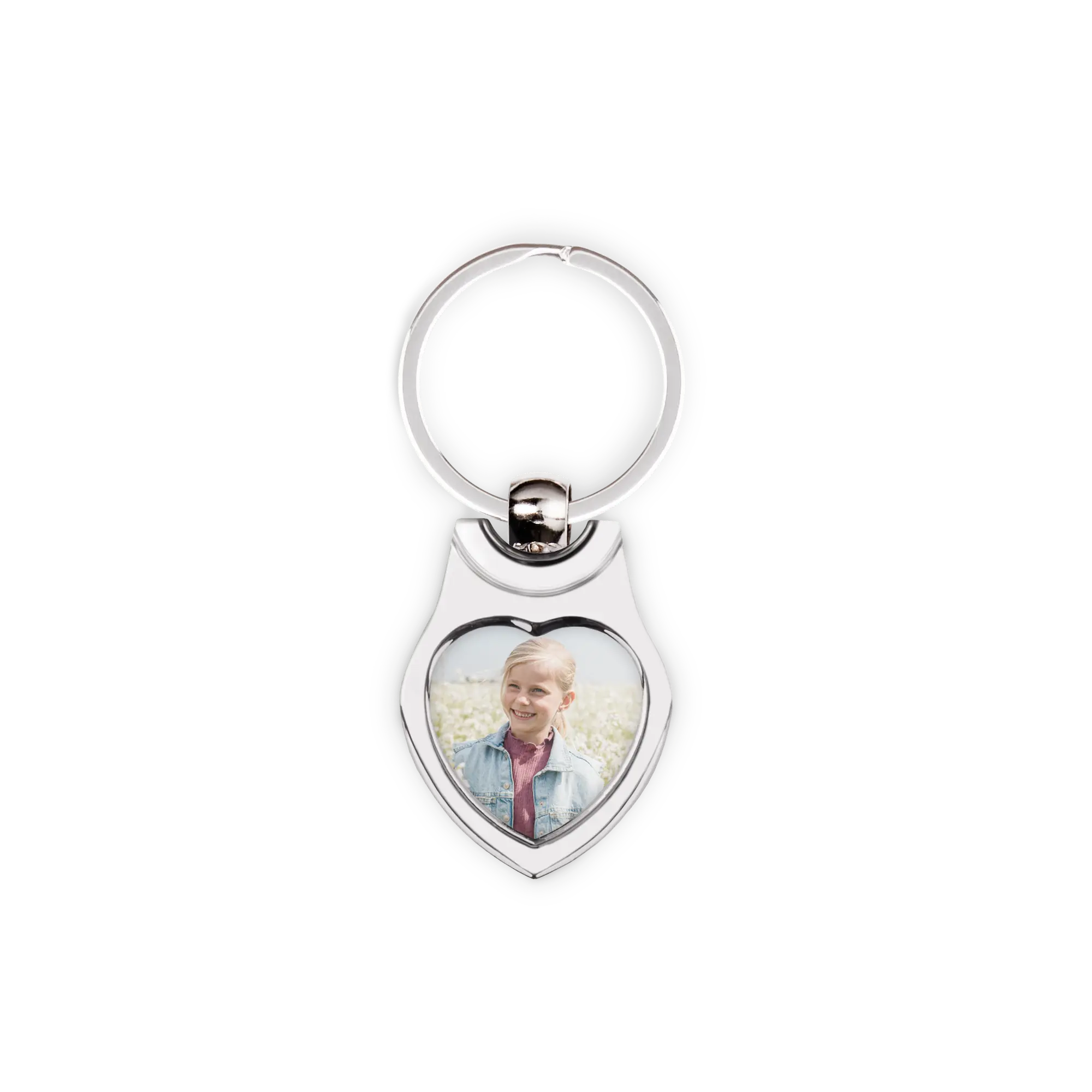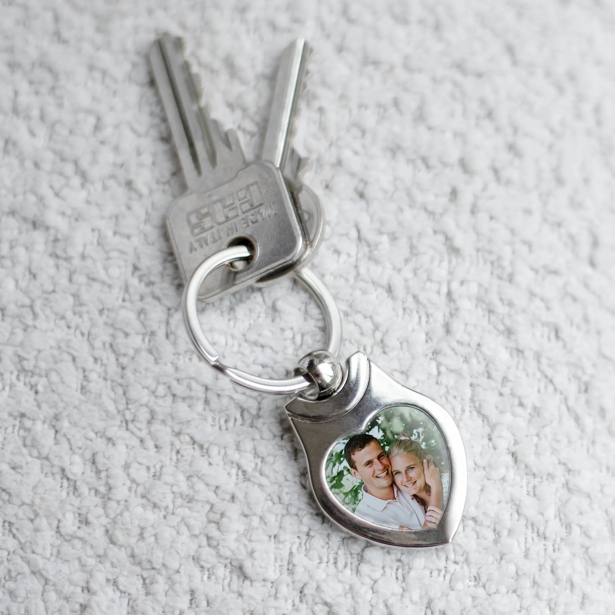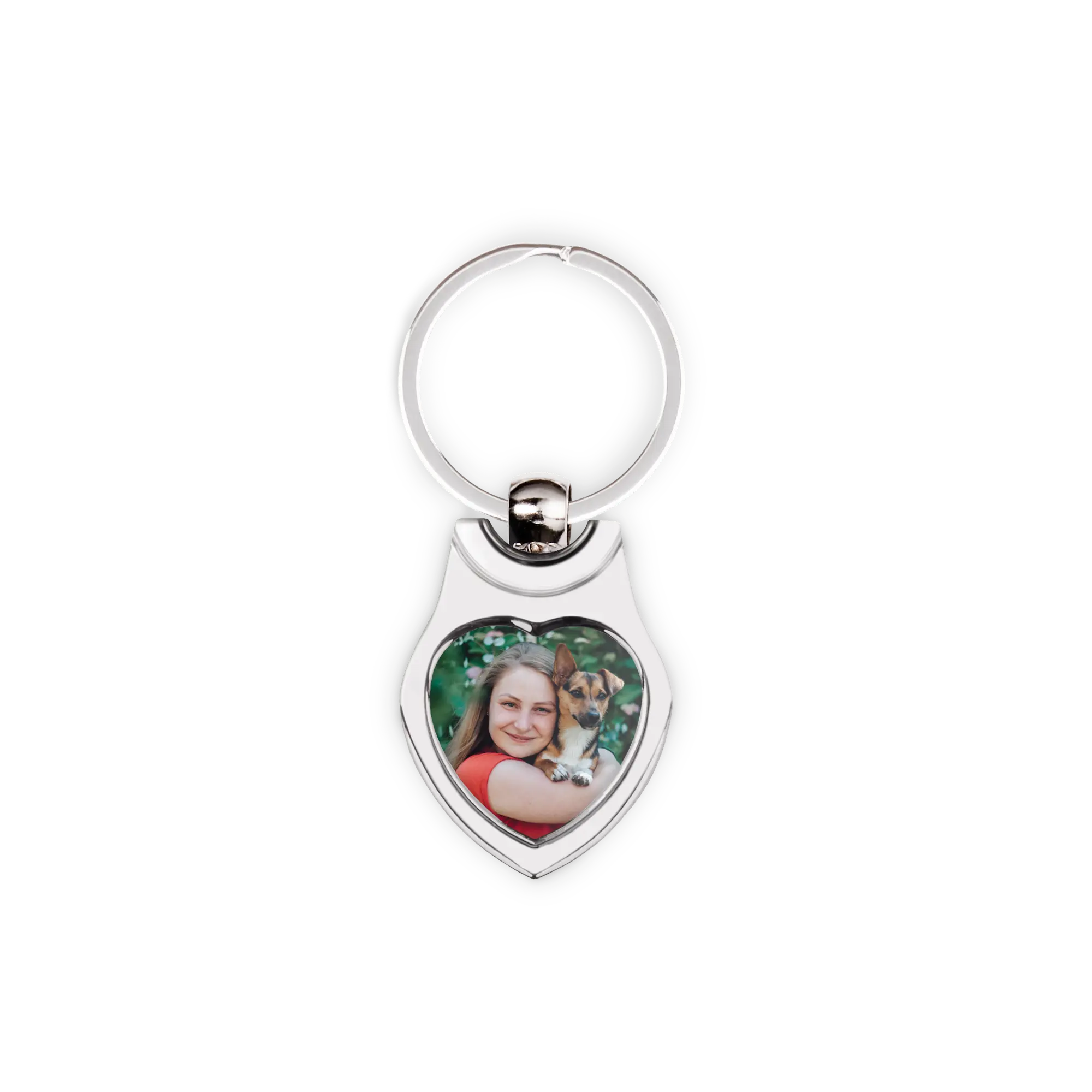 Un joli porte-clés en forme de cœur avec votre propre photo ou logo.