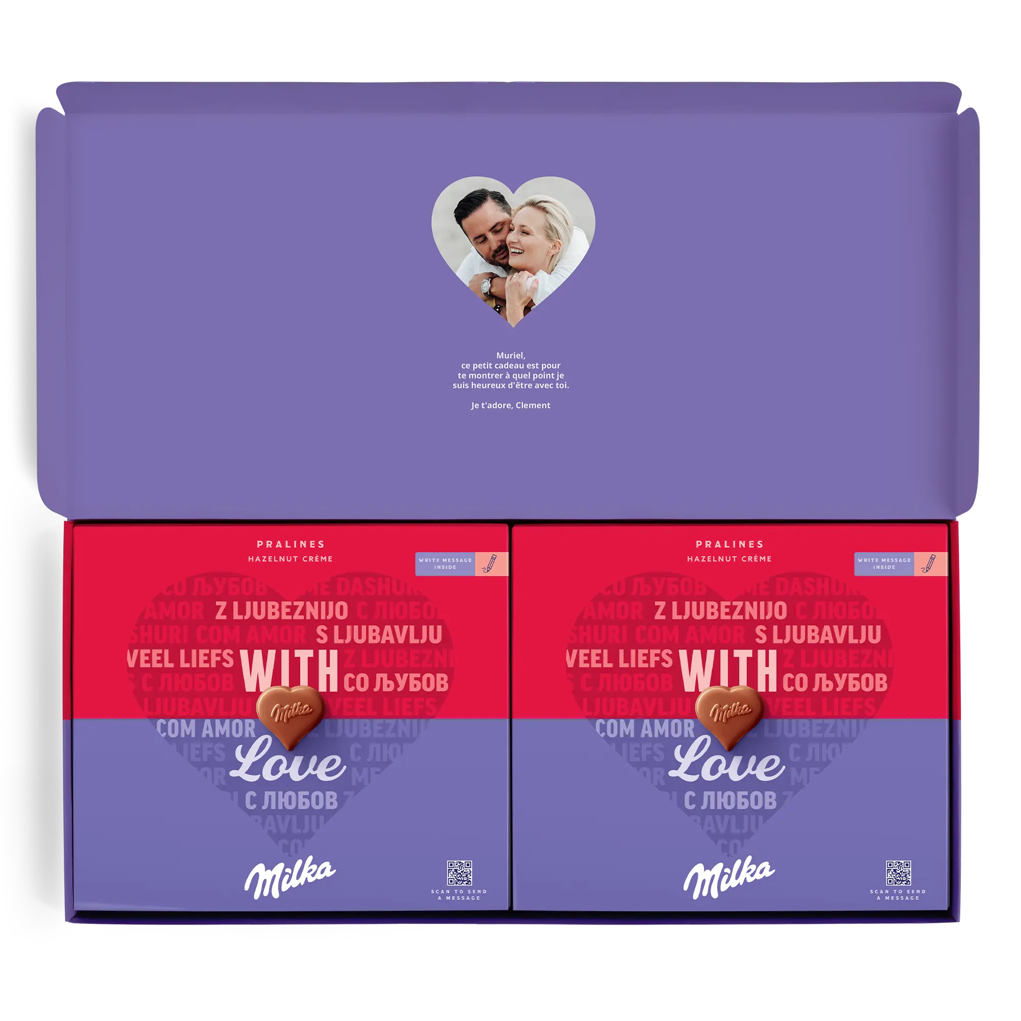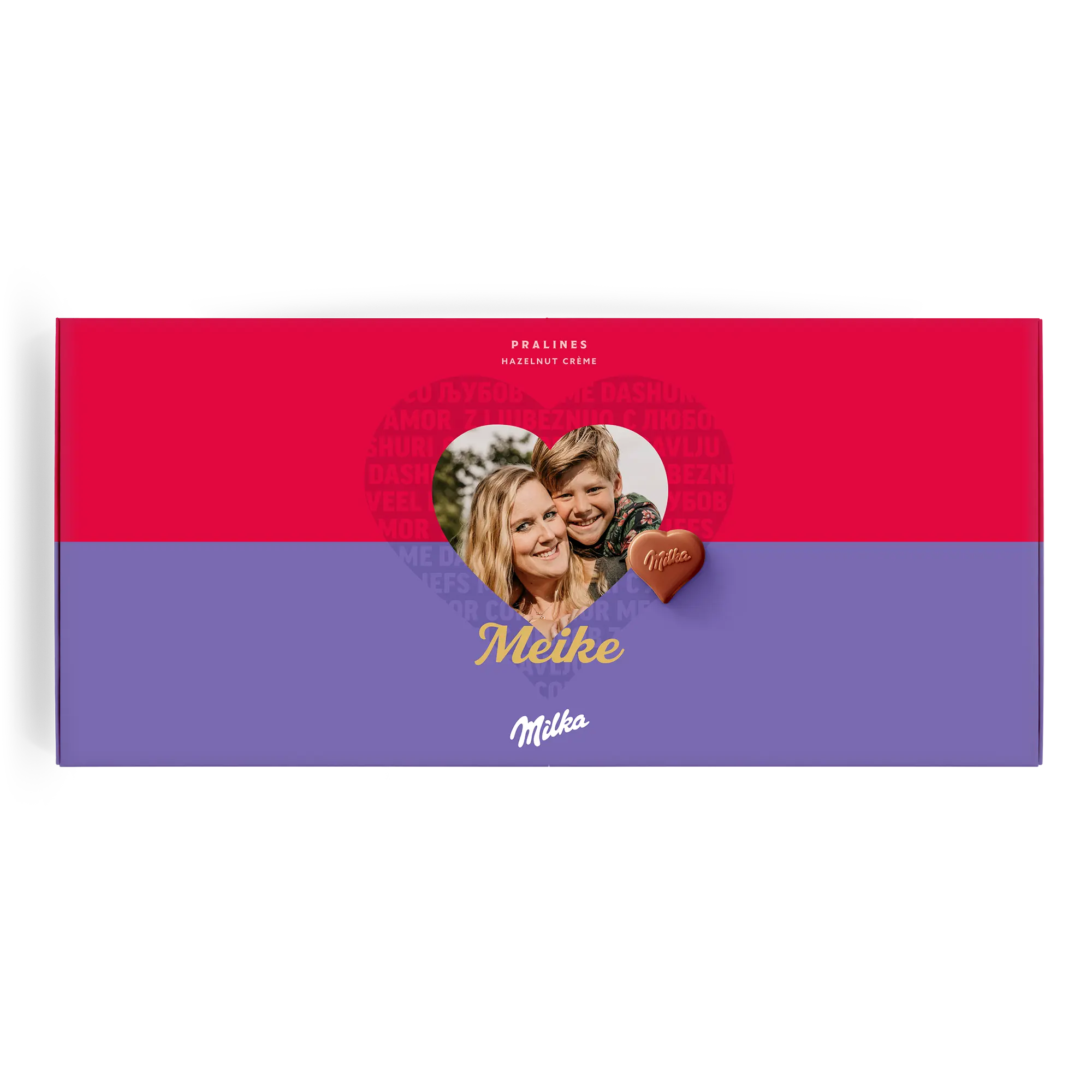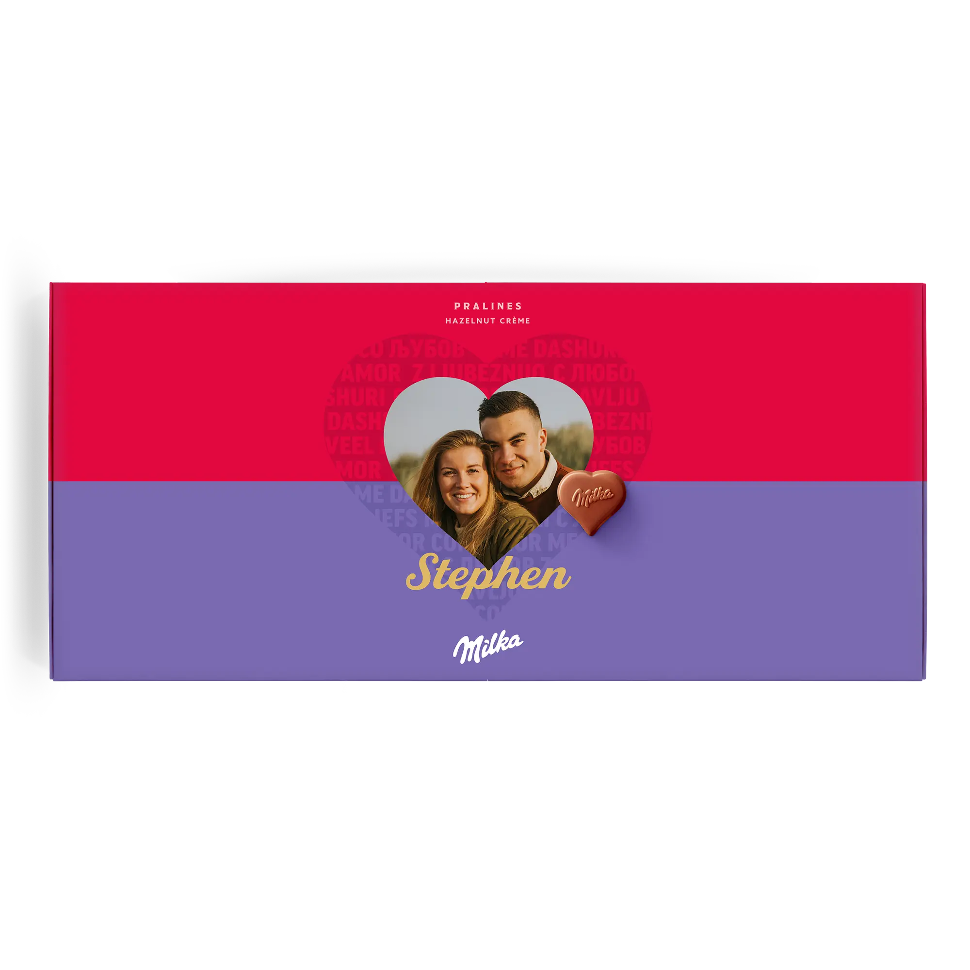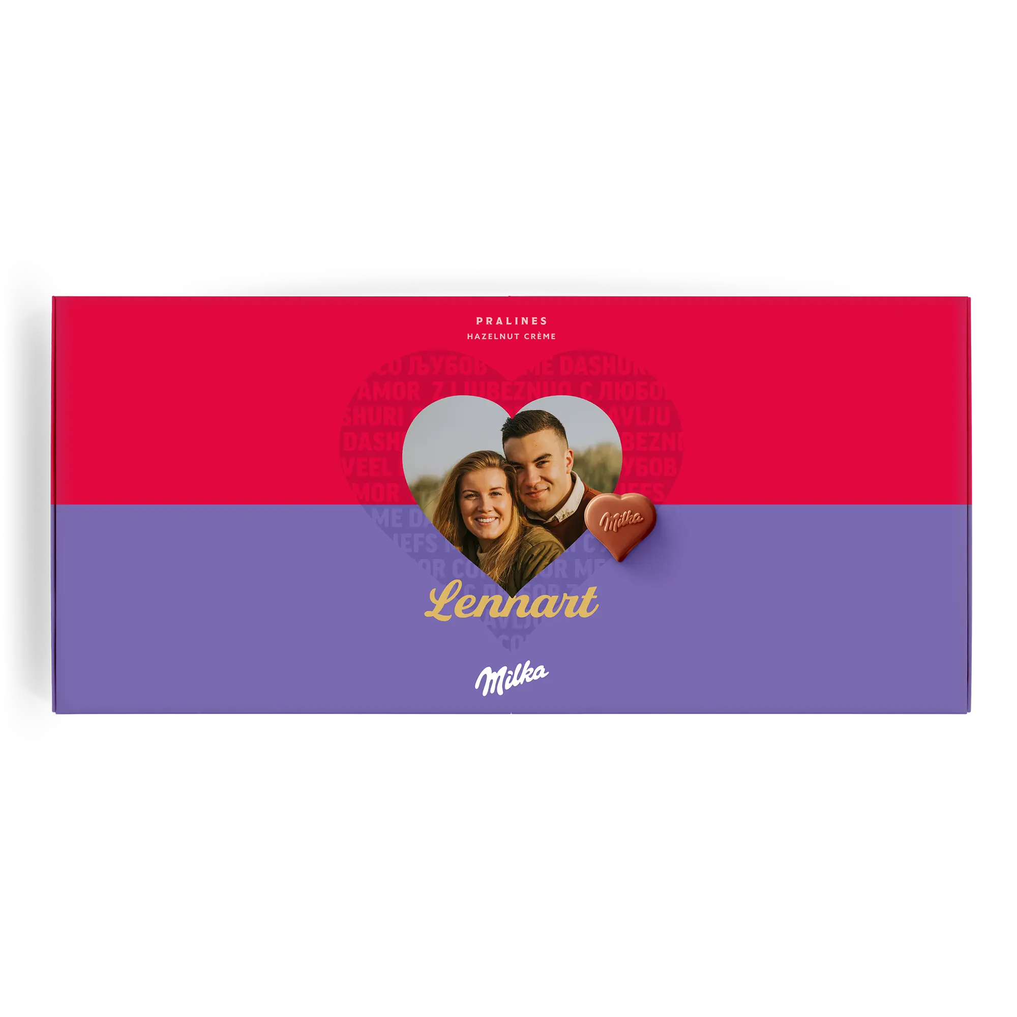 Coffret spécial Dites-le avec Milka pour votre amoureux. De délicieuses pralines avec nom, photo et un message romantique. Surprenez l'être cher !