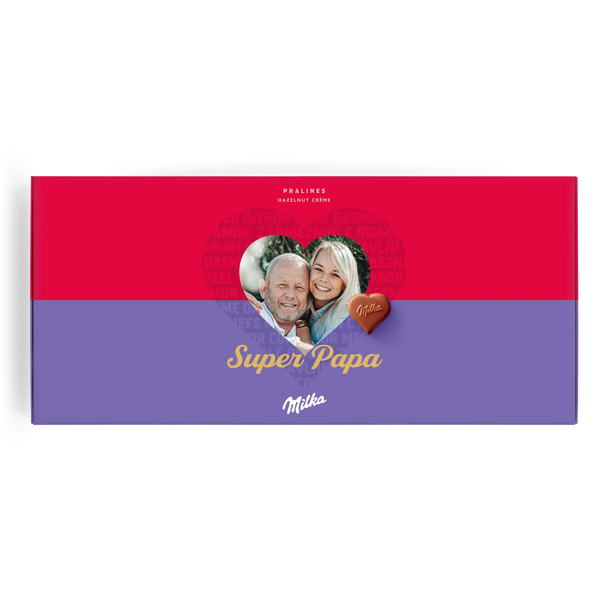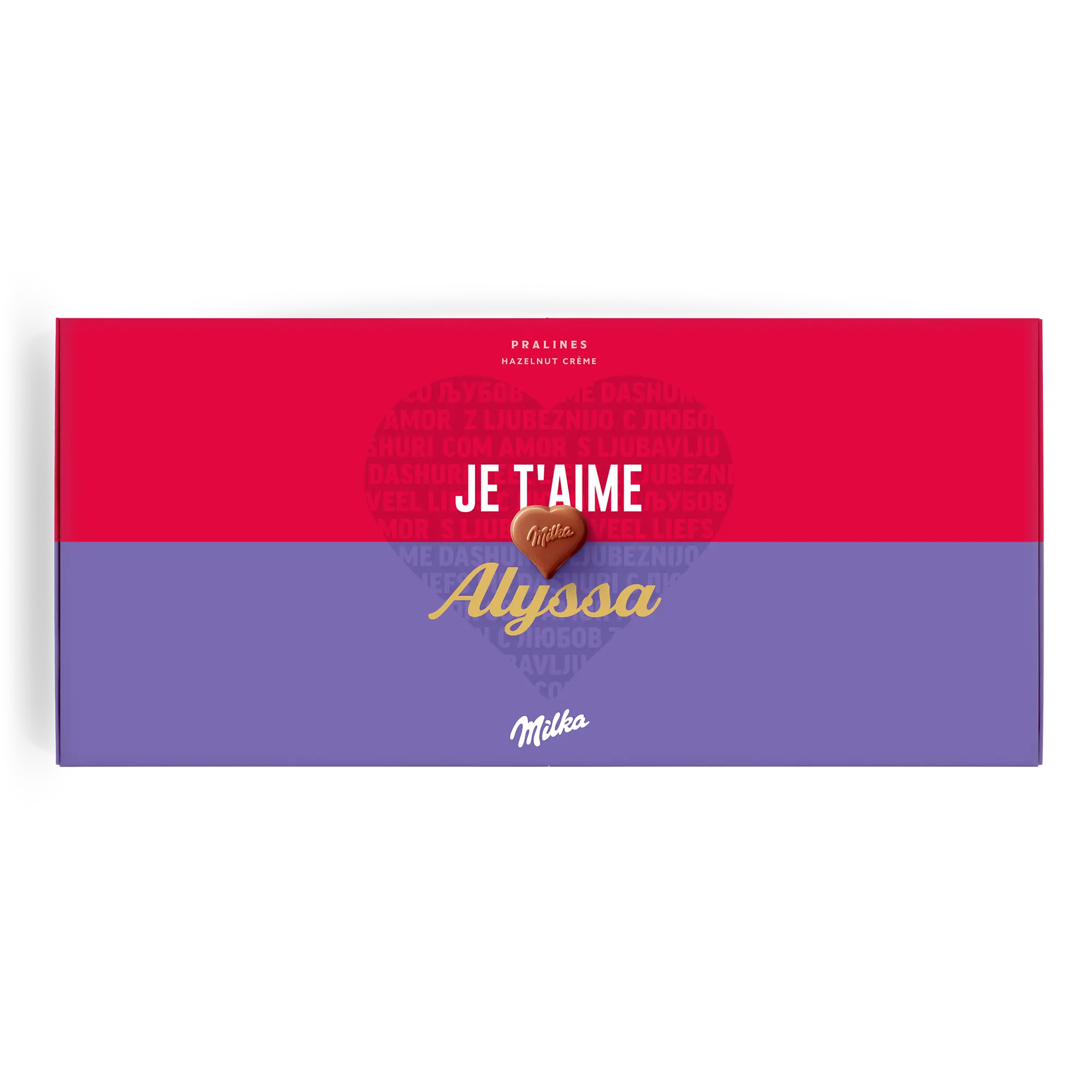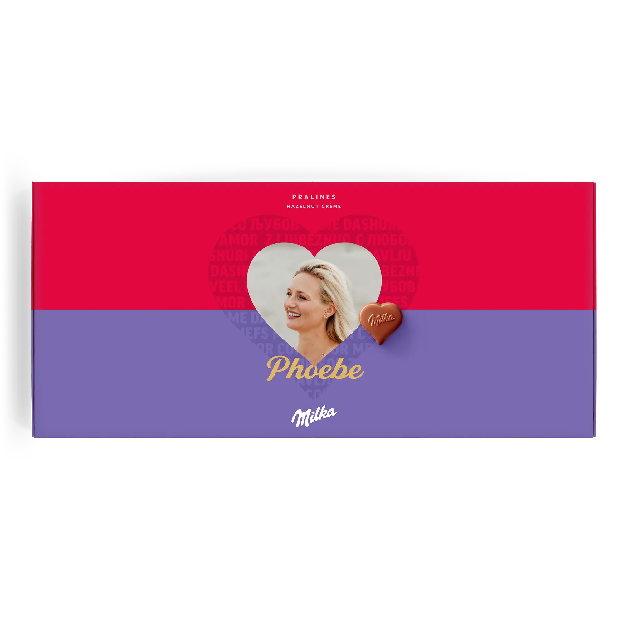 Coffret spécial Dites-le avec Milka pour votre amoureux. De délicieuses pralines avec nom, photo et un message romantique. Surprenez l'être cher !