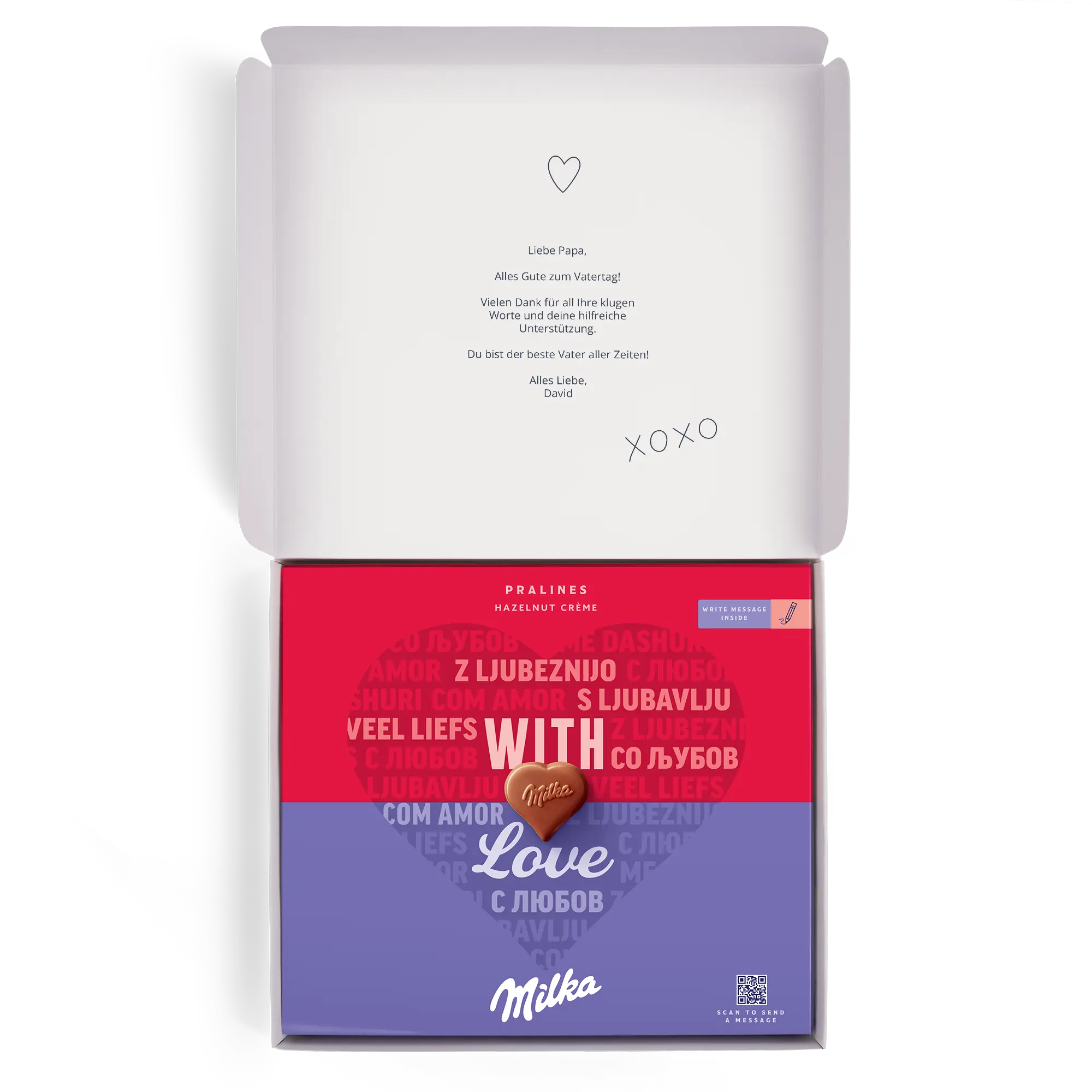 Surprenez votre papa avec ce coffret cadeau Milka spécial ! De délicieux chocolats en forme de cœur. Des motifs amusants pour la fête des pères !