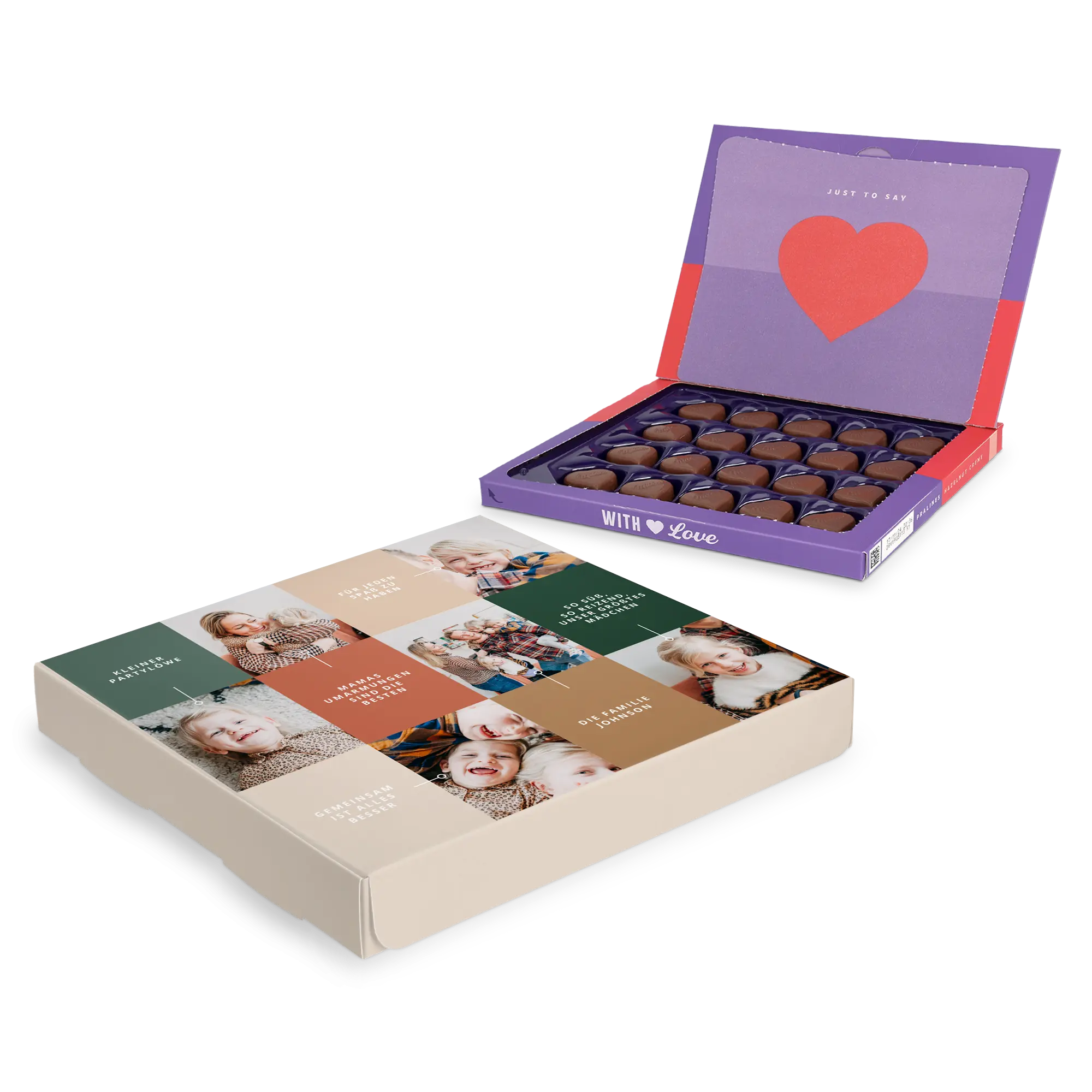 Plus d'informations sur le coffret cadeau Milka personnalisé :Chocolat : Chocolat au lait alpin fourré au nougat noisette Forme : cœur Quantité : 20 chocolatsPoids : 110 grammesDimensions du coffret cadeau : 19,5 x 18 x 2 cmPersonnalisation : photo, nom et message personnelImpression : parfaite image et en couleurRemarque : lorsque la température extérieure est de 25 degrés Celsius ou plus, nous ne pouvons pas garantir la qualité du chocolat. Si vous avez des questions concernant vos commandes de chocolat, veuillez contacter notre service client. Pour des raisons techniques, il n'est pas possible de traiter les caractères cyrilliques, turcs, asiatiques, arabes, grecs, scandinaves et spéciaux.Ingrédients : Sucre, beurre de cacao, huile de palme, pâte de cacao, lactosérum en poudre (LAIT), LAIT écrémé en poudre, matière grasse du LAIT, pâte à tartiner NOISETTES 5 %, émulsifiants (lécithine de SOJA, E476), arômes (contenant du LAIT)Allergènes : Contient des noisettes, du lait et du soja. Peut contenir (des traces de) d'autres fruits à coque.