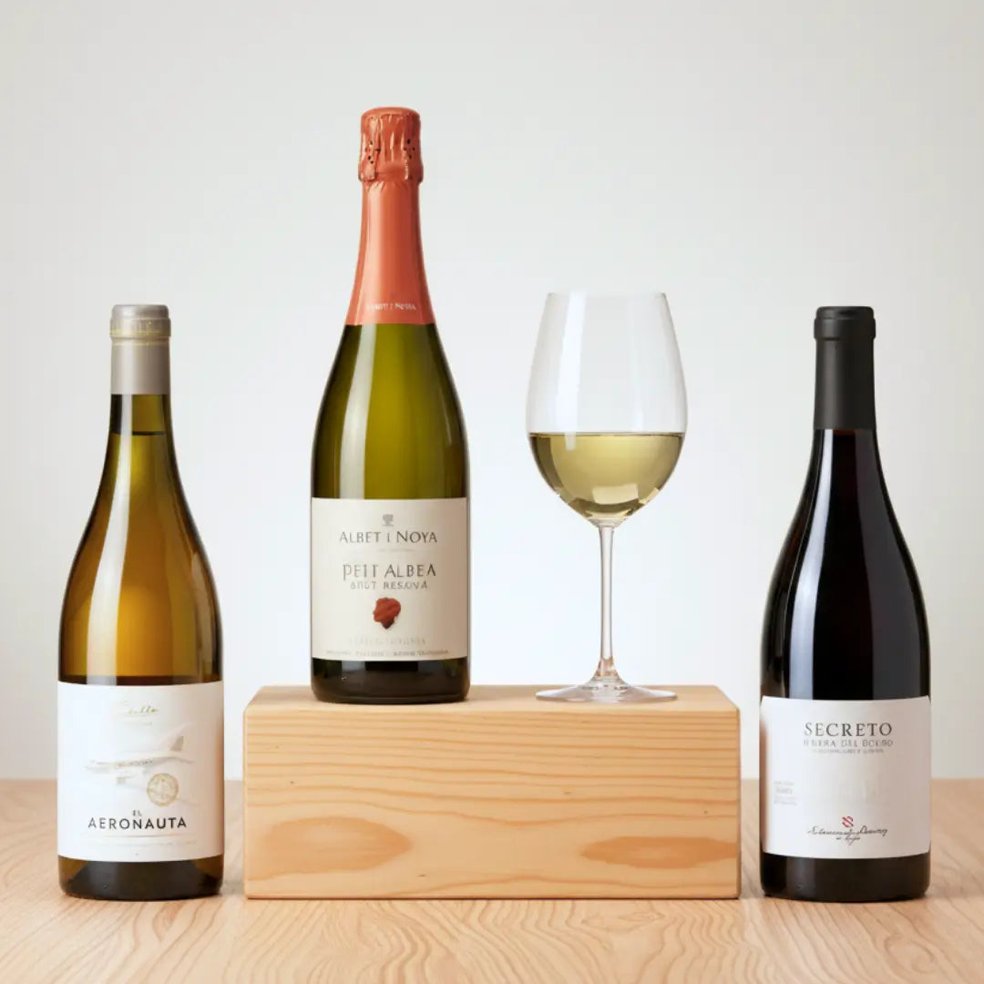 Collection de vins sélectionnés, comprenant un Cava Brut Reserva pétillant, un vin blanc élégant et un vin rouge riche, chacun choisi pour sa qualité et son caractère exceptionnels.