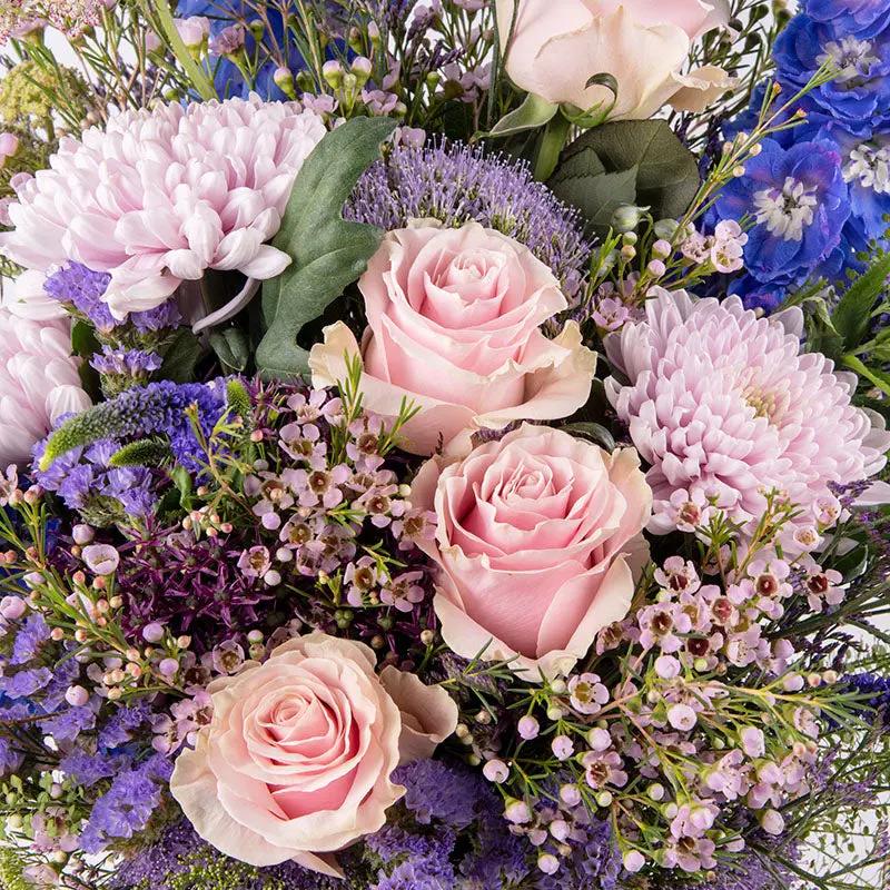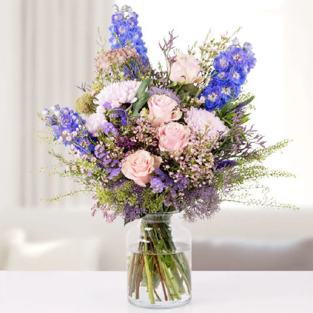 Une composition exclusive et unique, conçue spécialement pour surprendre. Les pieds-d'alouette d'un bleu intense captivent fièrement et ne manqueront pas de faire tourner les têtes. Aussi appelée Delphinium, cette plante doit son nom à ses fleurs en forme de dauphin, qui en font une fleur exotique et très convoitée. Les fines tiges du limonium violet apportent une touche délicate et légèrement sauvage, tandis que les élégantes roses et anastasias apportent à la composition une touche exaltante, apportant une sensation magique d'équilibre.