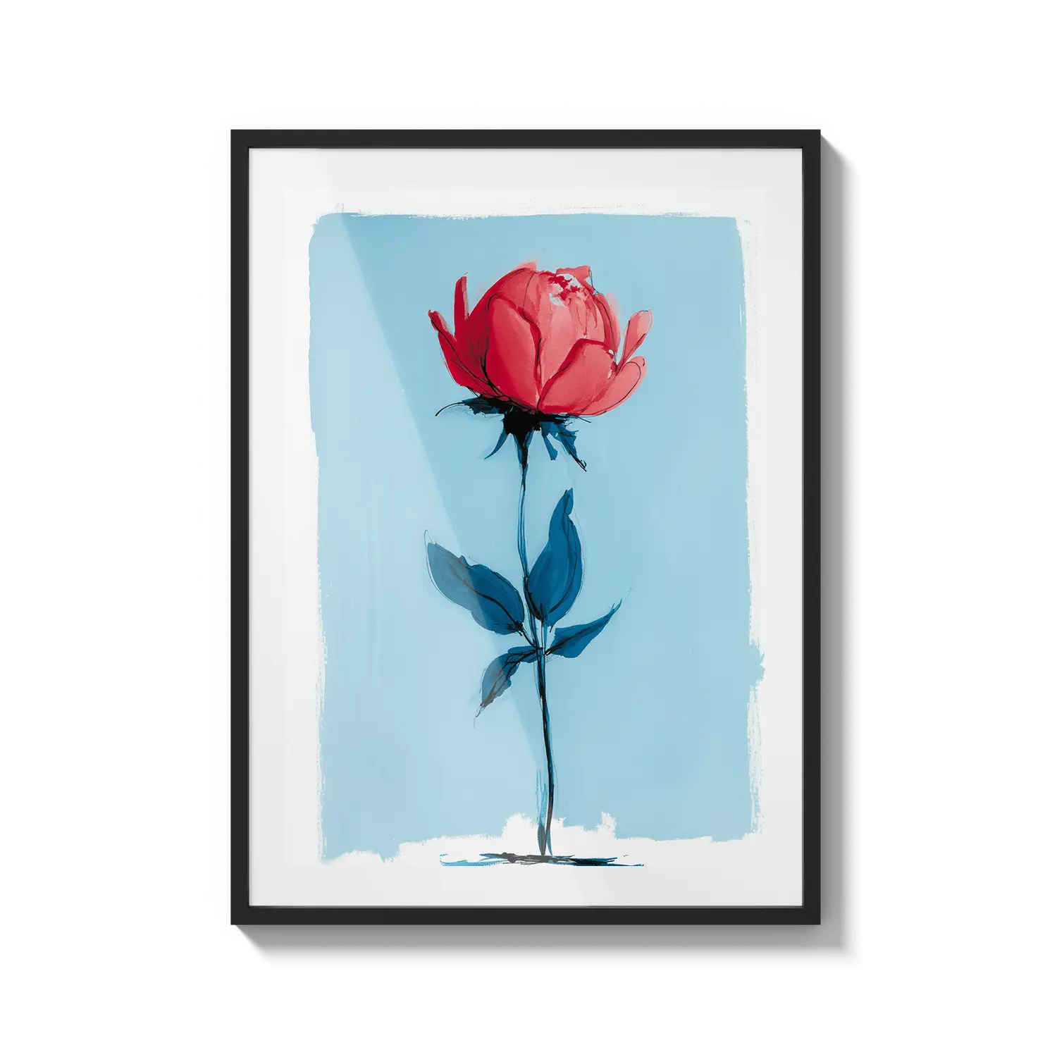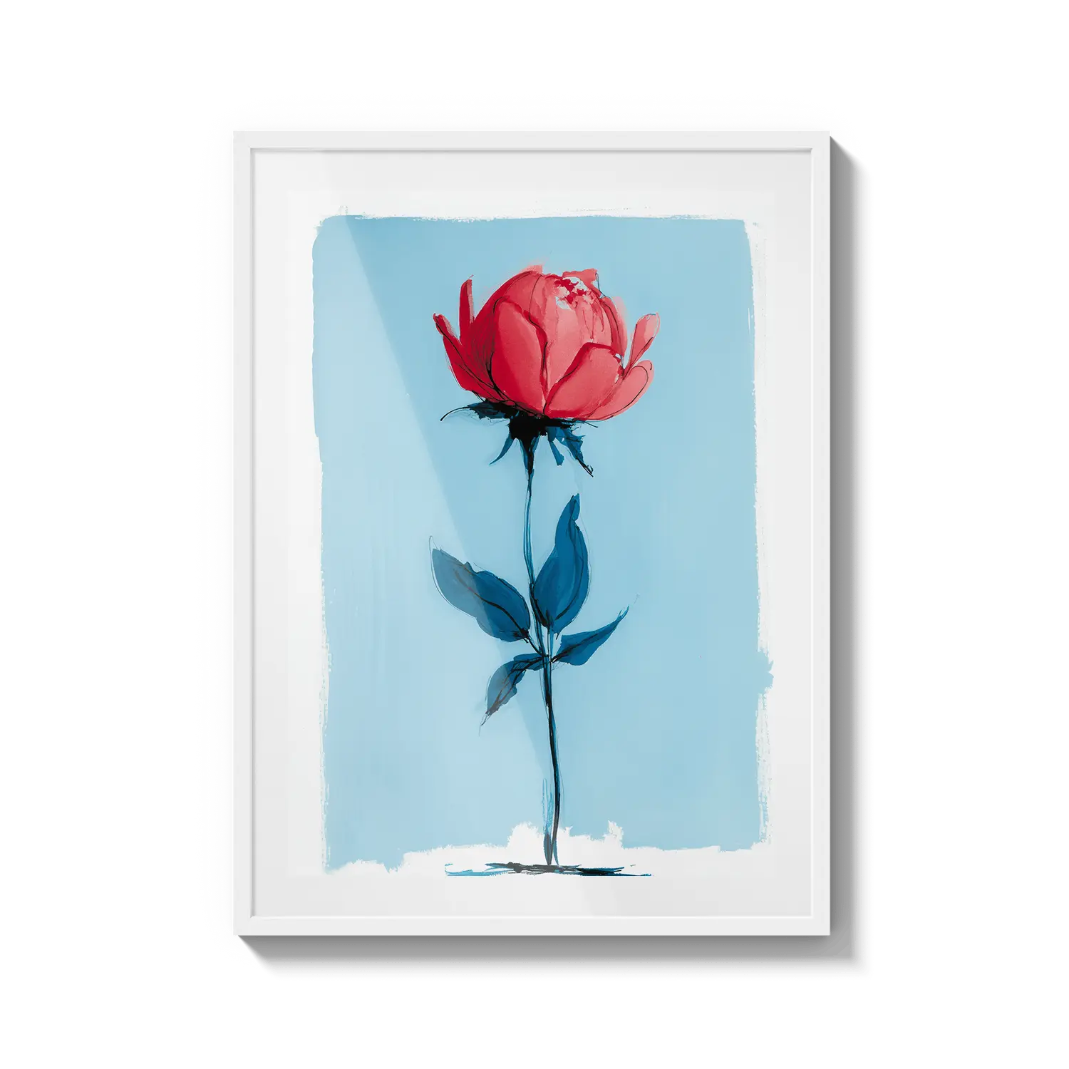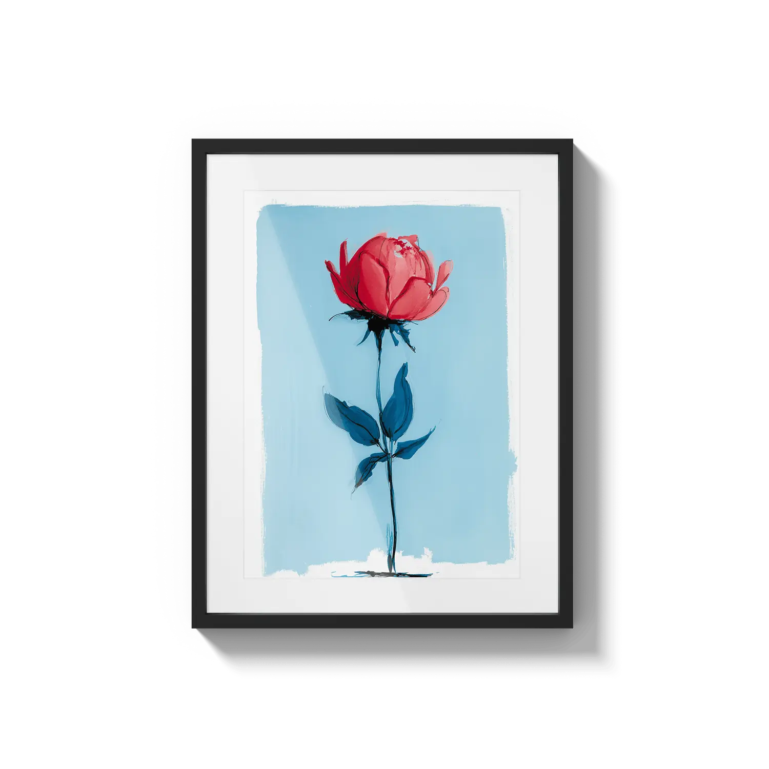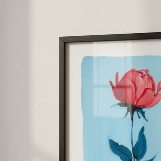 Une rose minimale se tenant avec une force délicate sur un fond bleu doux. Un cadeau tendre qui parle avec une beauté tranquille.
