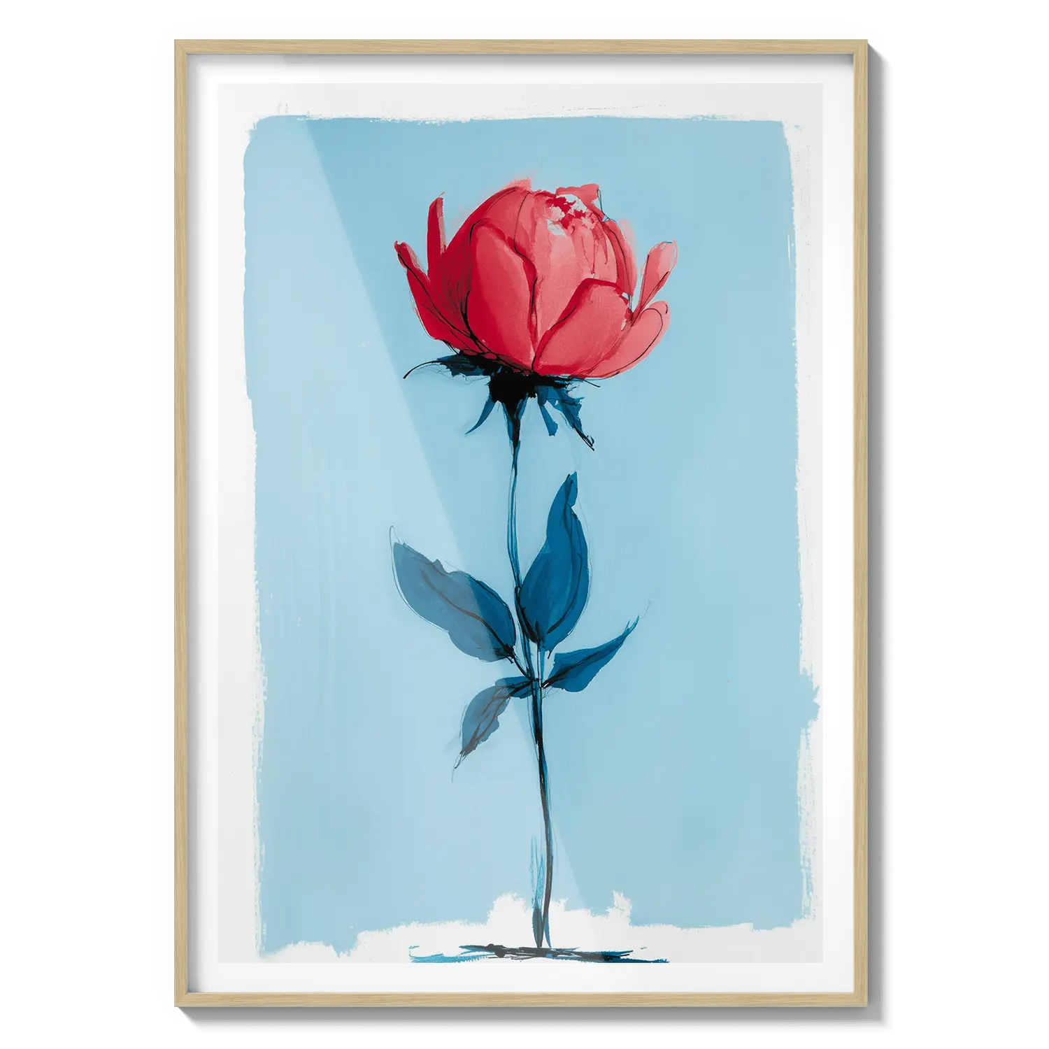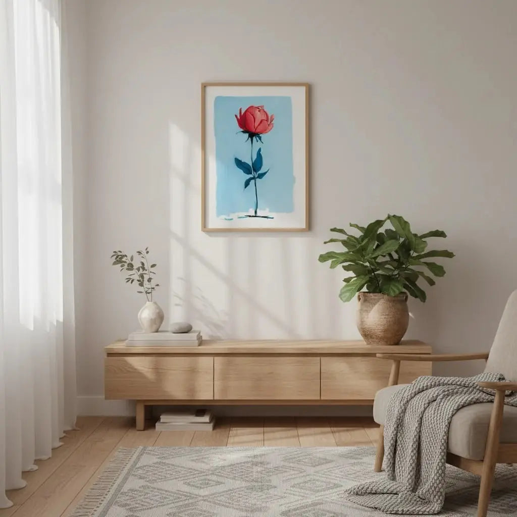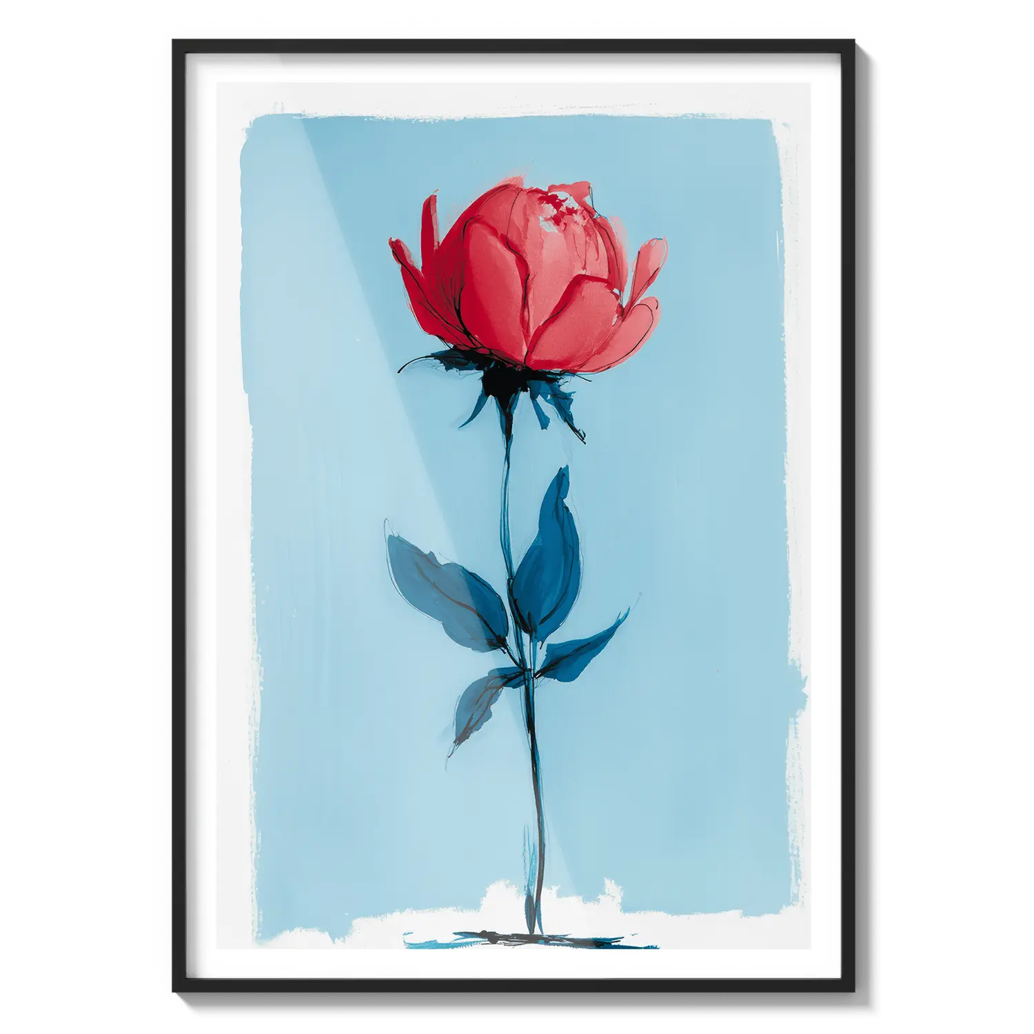 Une rose minimale se tenant avec une force délicate sur un fond bleu doux. Un cadeau tendre qui parle avec une beauté tranquille.