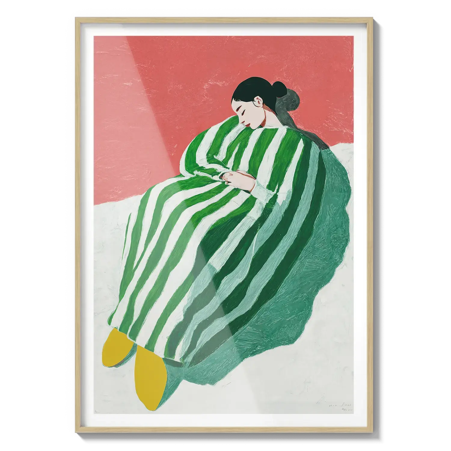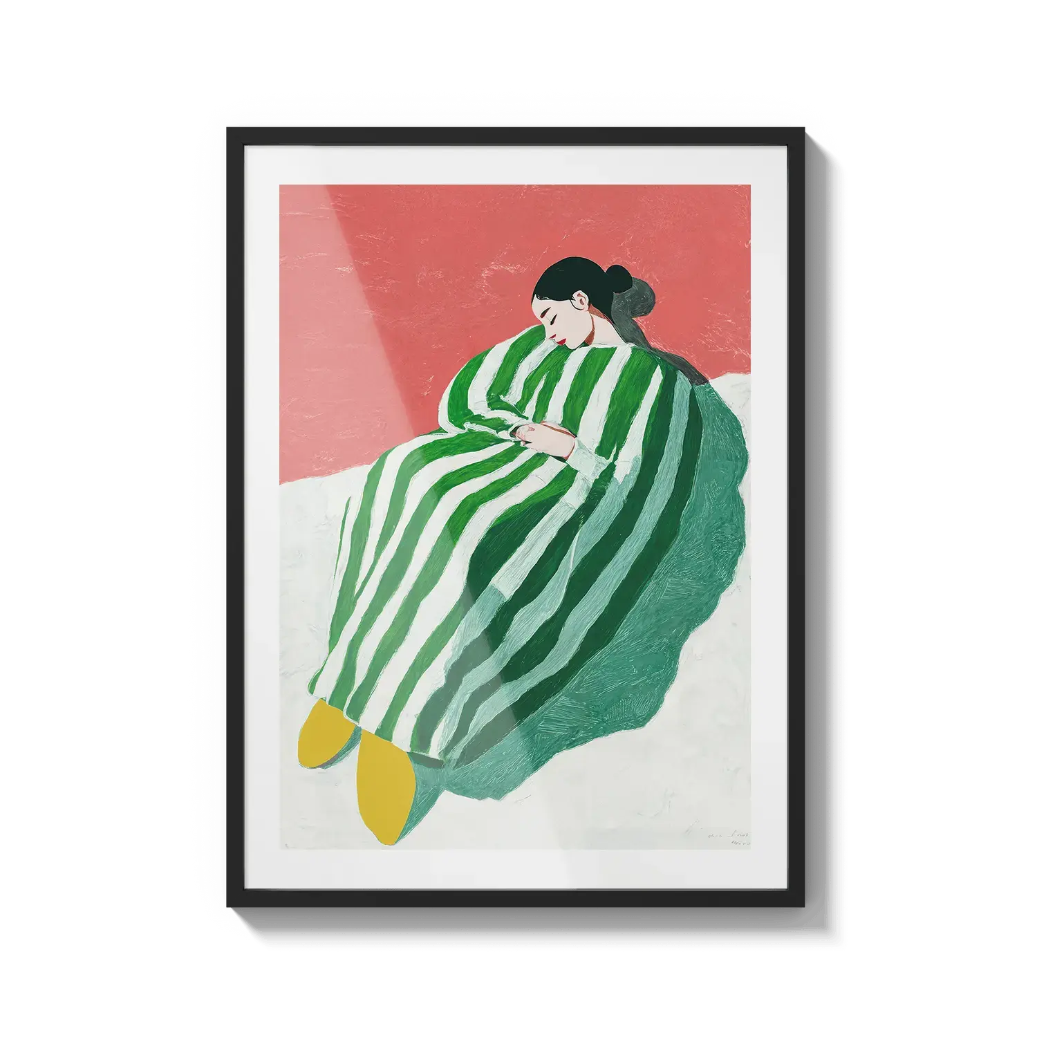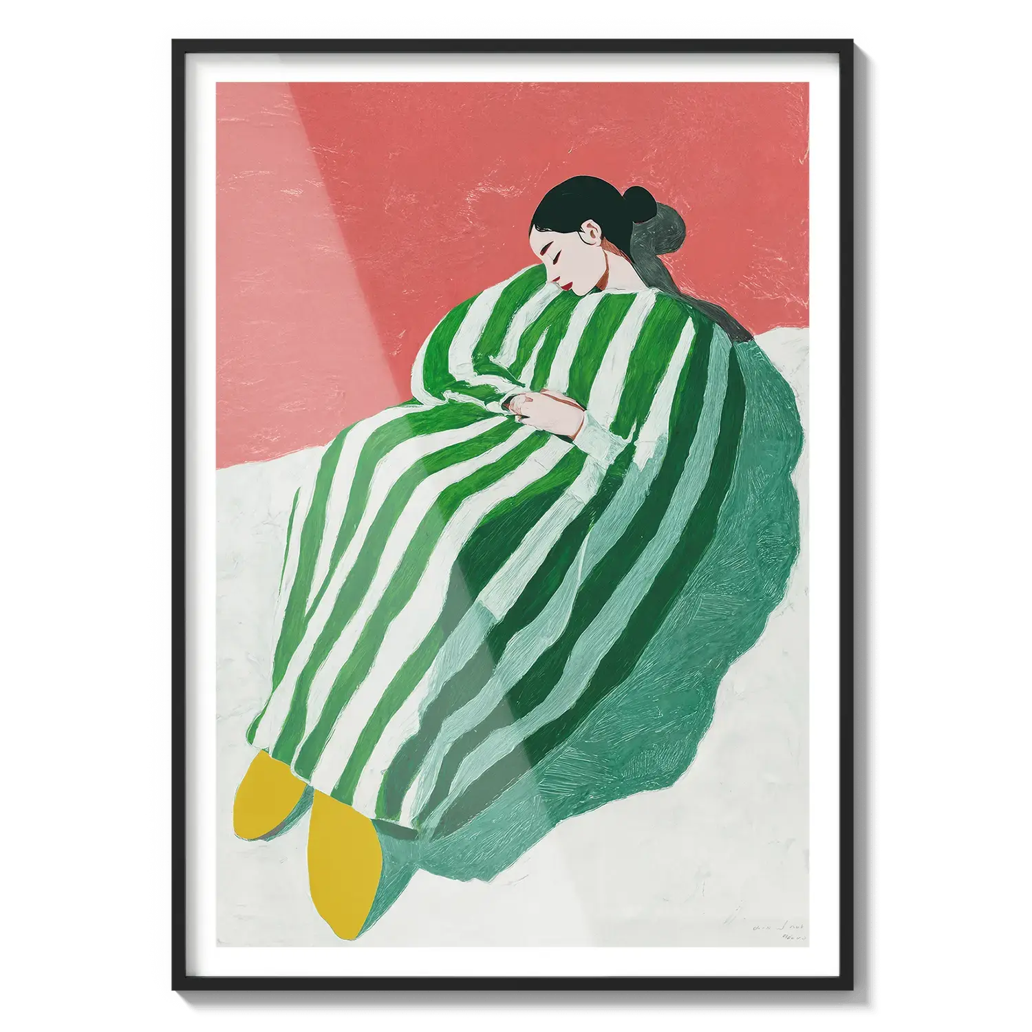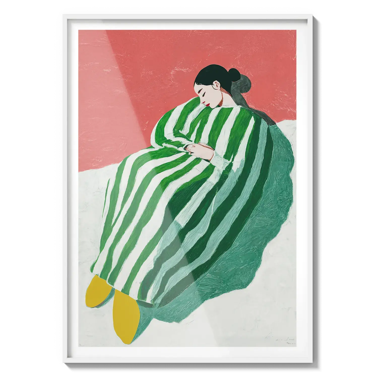Une silhouette enveloppée de rayures vertes et blanches reposant avec une douce aisance. Une douce invitation à ralentir.