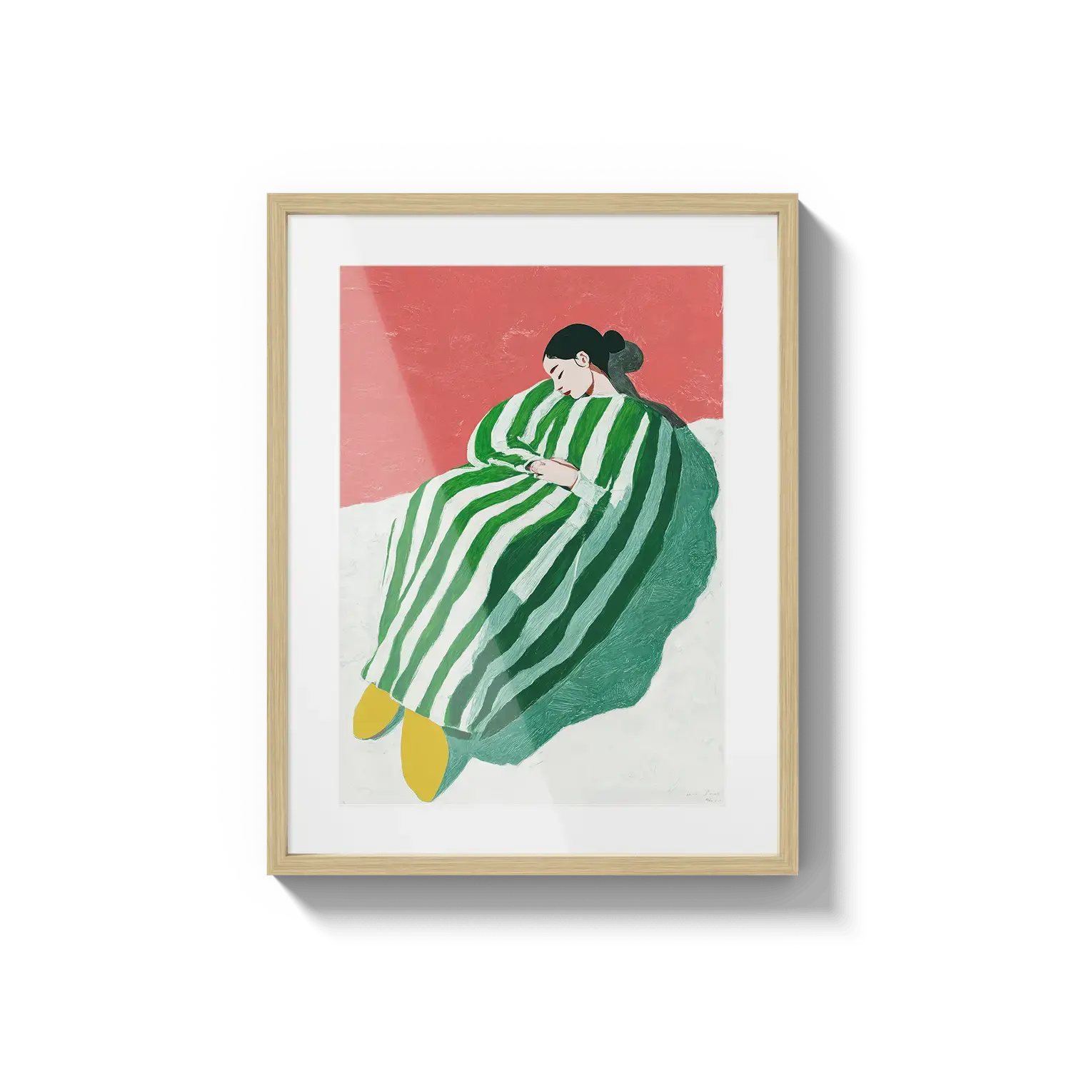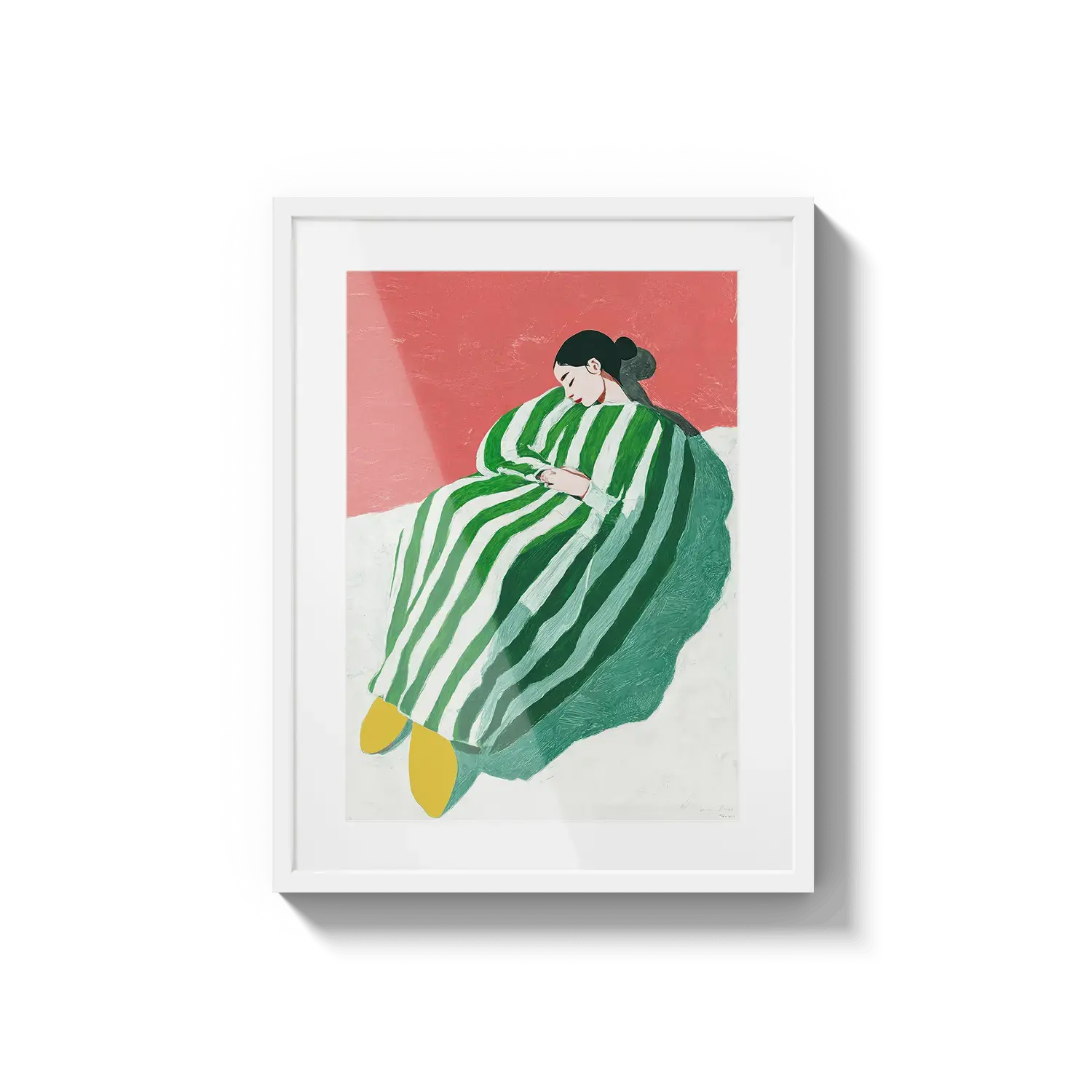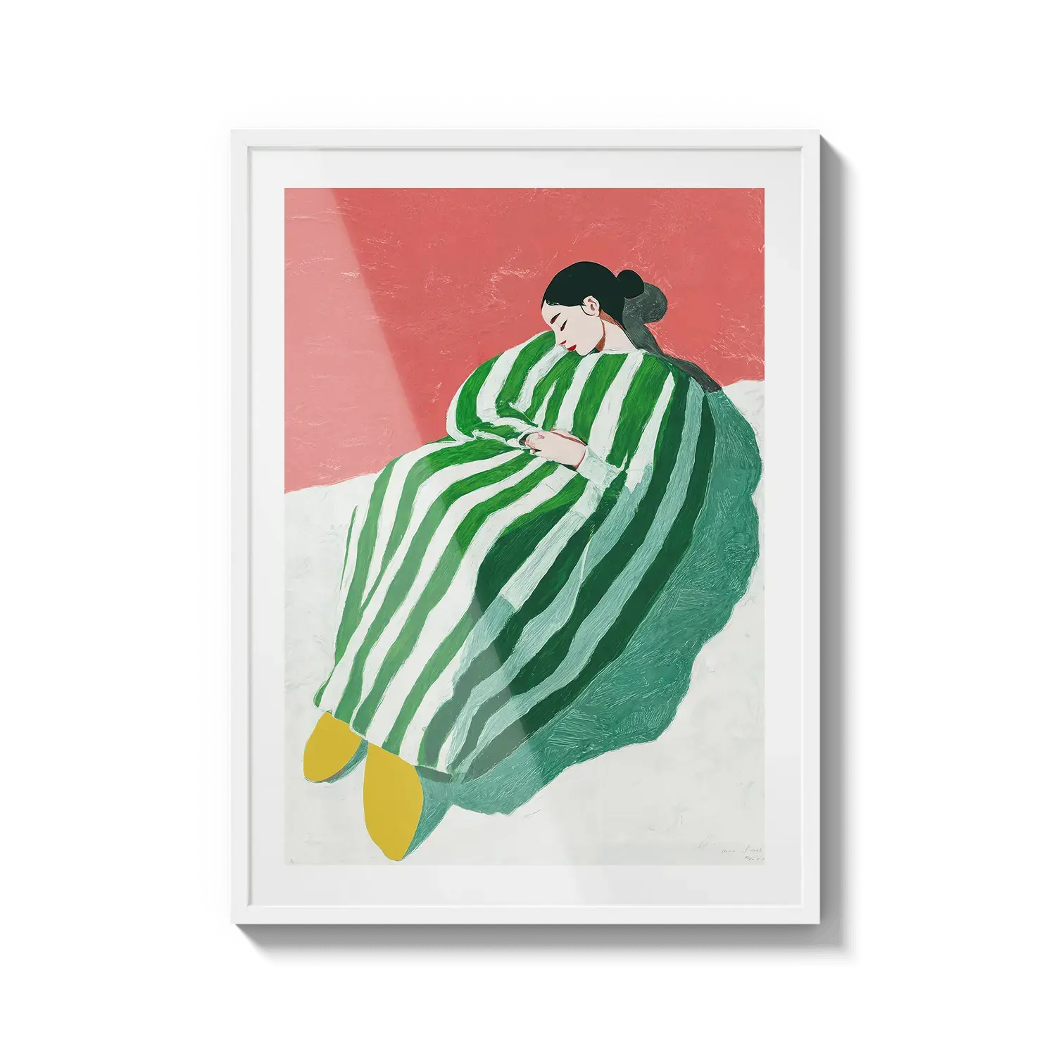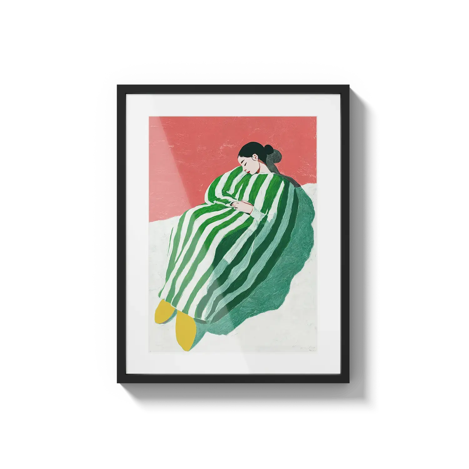 Une silhouette enveloppée de rayures vertes et blanches reposant avec une douce aisance. Une douce invitation à ralentir.