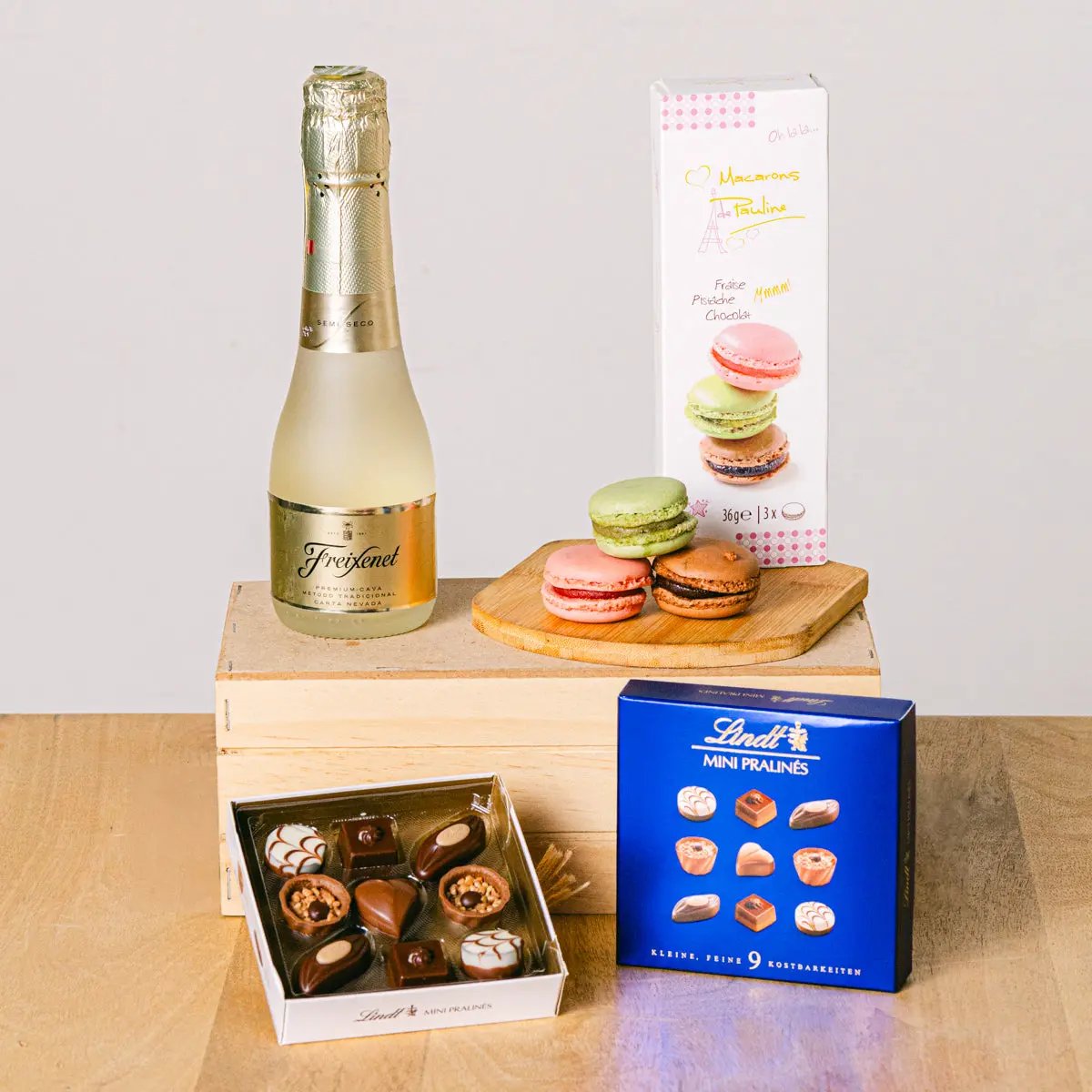 Un panier gourmand, sucré et varié, pour un moment de pure détente bien mérité. Le cava frais et légèrement acidulé se marie parfaitement à cette sélection de pralines, pour un cadeau qui surprendra à chaque bouchée.