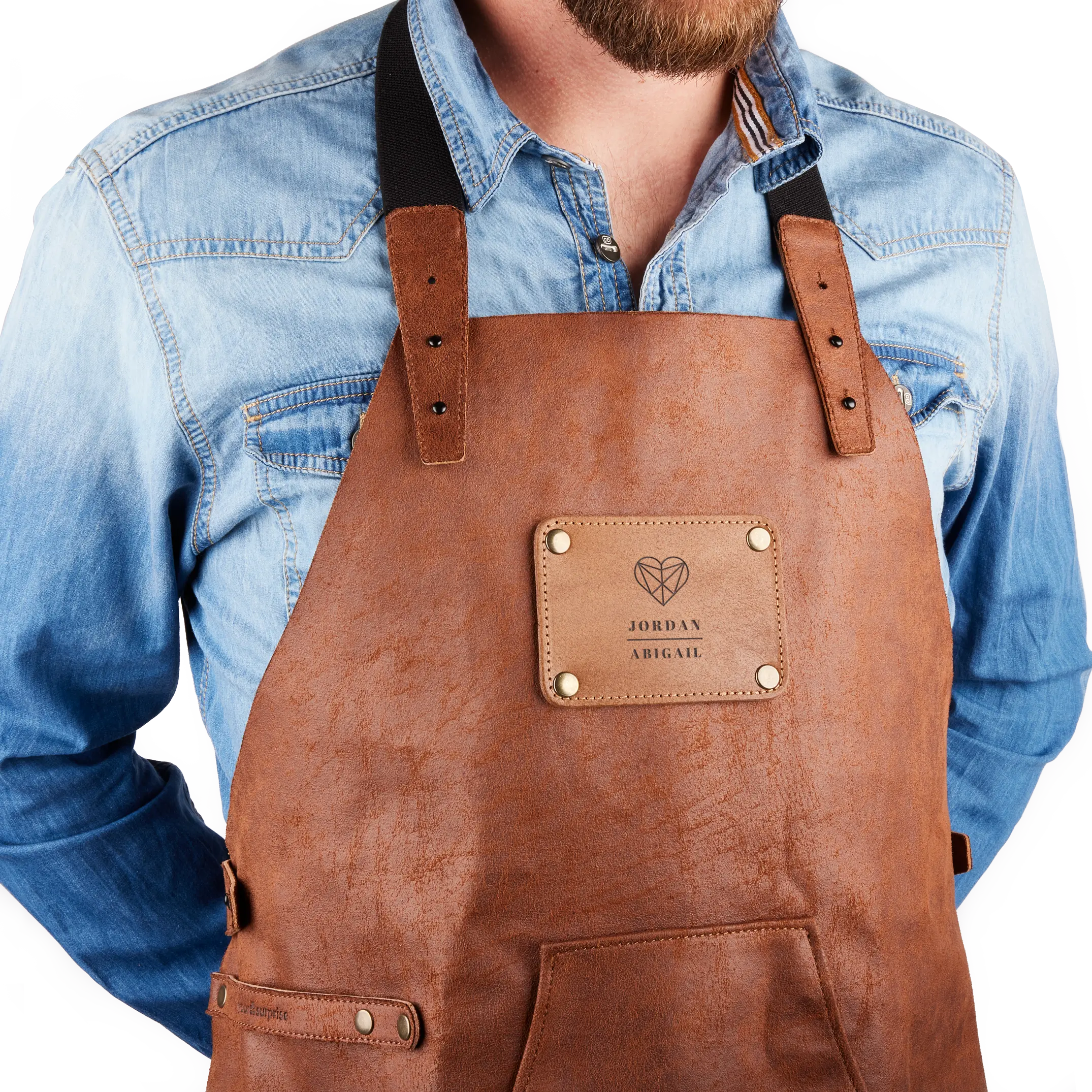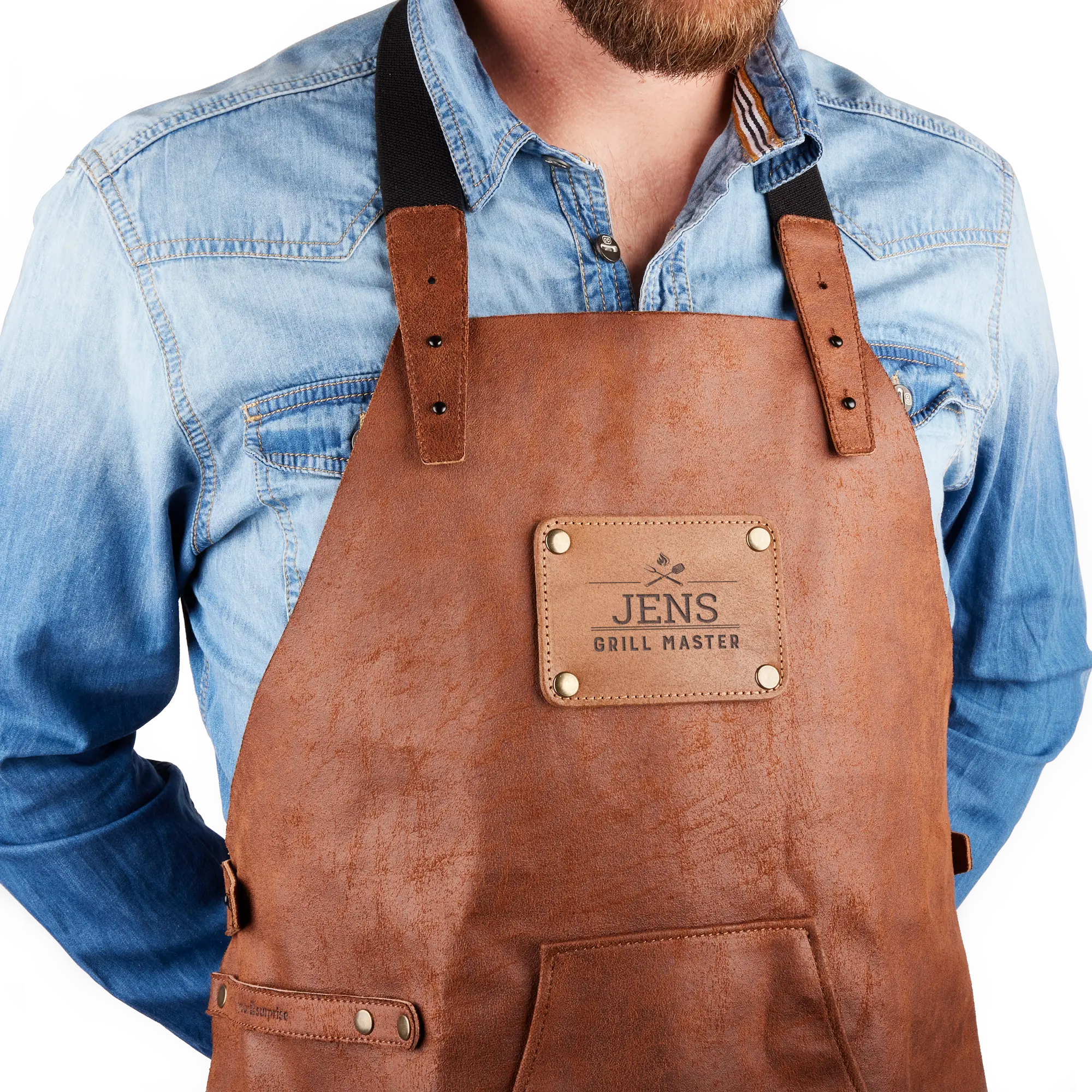Tablier en cuir durable et tendance, gravé d'un motif et d'un nom. Le cadeau idéal pour tout chef (en herbe) ! Plus d'informations sur le tablier en cuir recyclé personnalisé : Matière : 90 % cuir recyclé, 10 % PU (polyuréthane). Épaisseur : 1 mm. Couleur : marron. Personnalisation : gravure. Dimensions : 7 x 7 cm. Dimensions du tablier : 81 x 59,5 cm. Poids : +/- 430 grammes. Taille : réglable, tour de taille de 90 à 113,5 cm. Informations complémentaires : le cuir étant un matériau naturel, votre cadeau peut différer légèrement des images présentées sur le site web.
