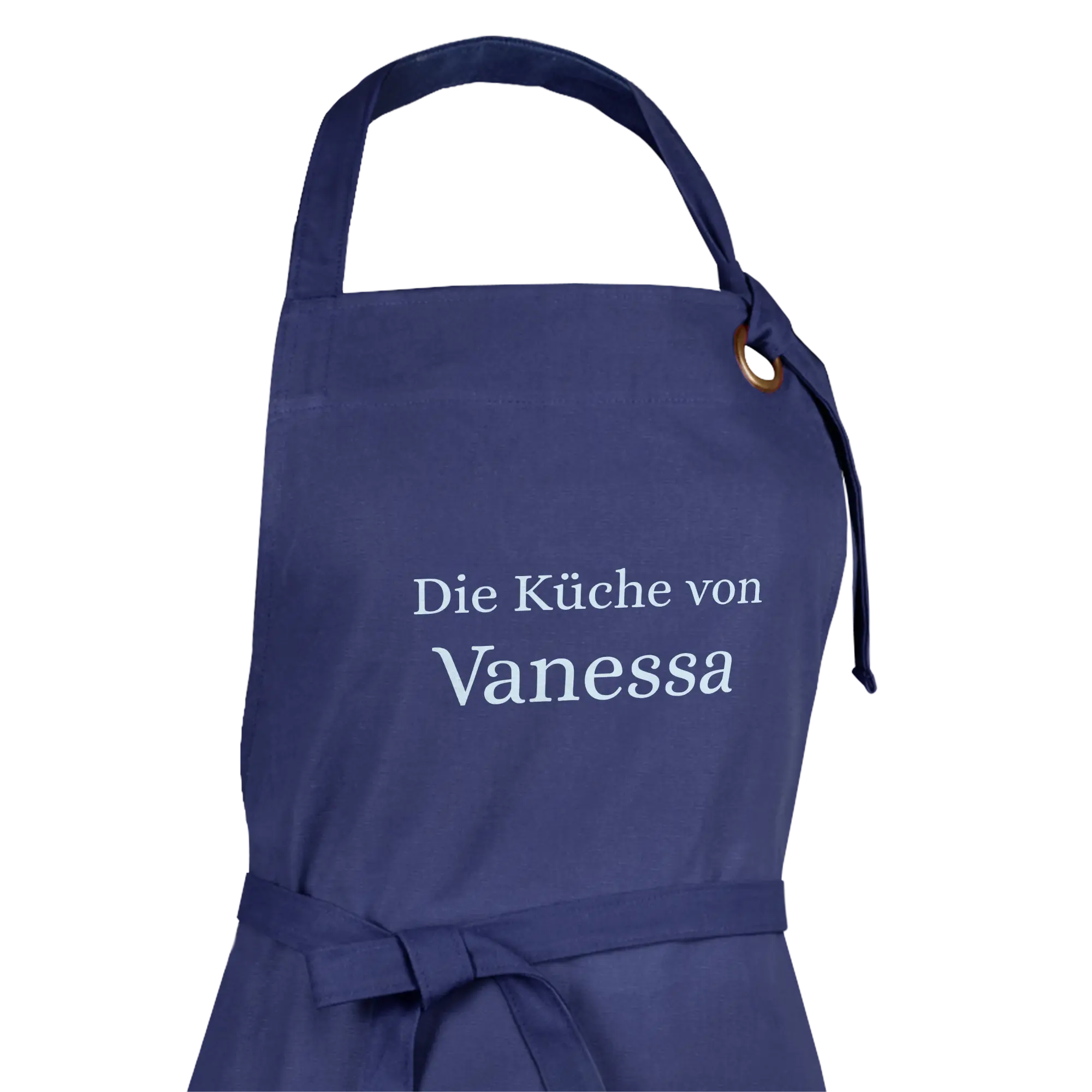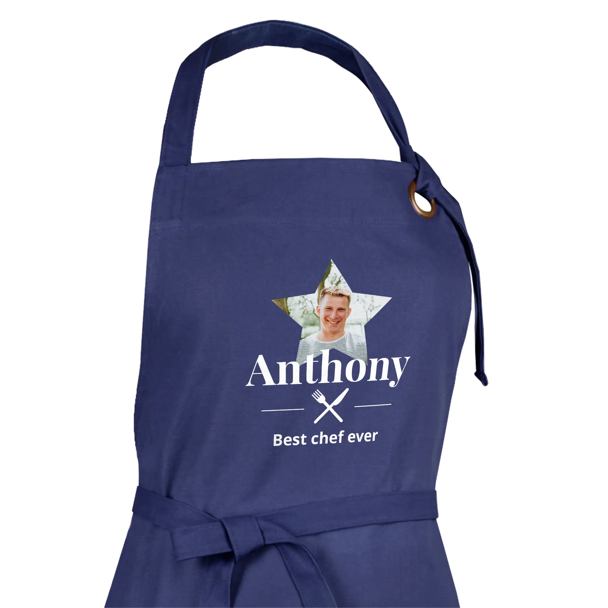 Un joli tablier de cuisine avec votre photo et votre texte ! Pour femme et homme ! Plus d'informations sur le tablier de cuisine personnalisé : Couleur : bleu Matière : 100 % coton Dimensions : 80 x 70 cm Personnalisation : avec photo et/ou texte Impression : 20 x 20 cm, couleur, qualité HD Le plus : un peu de désordre est permis ! Le tablier est lavable à 40 °C