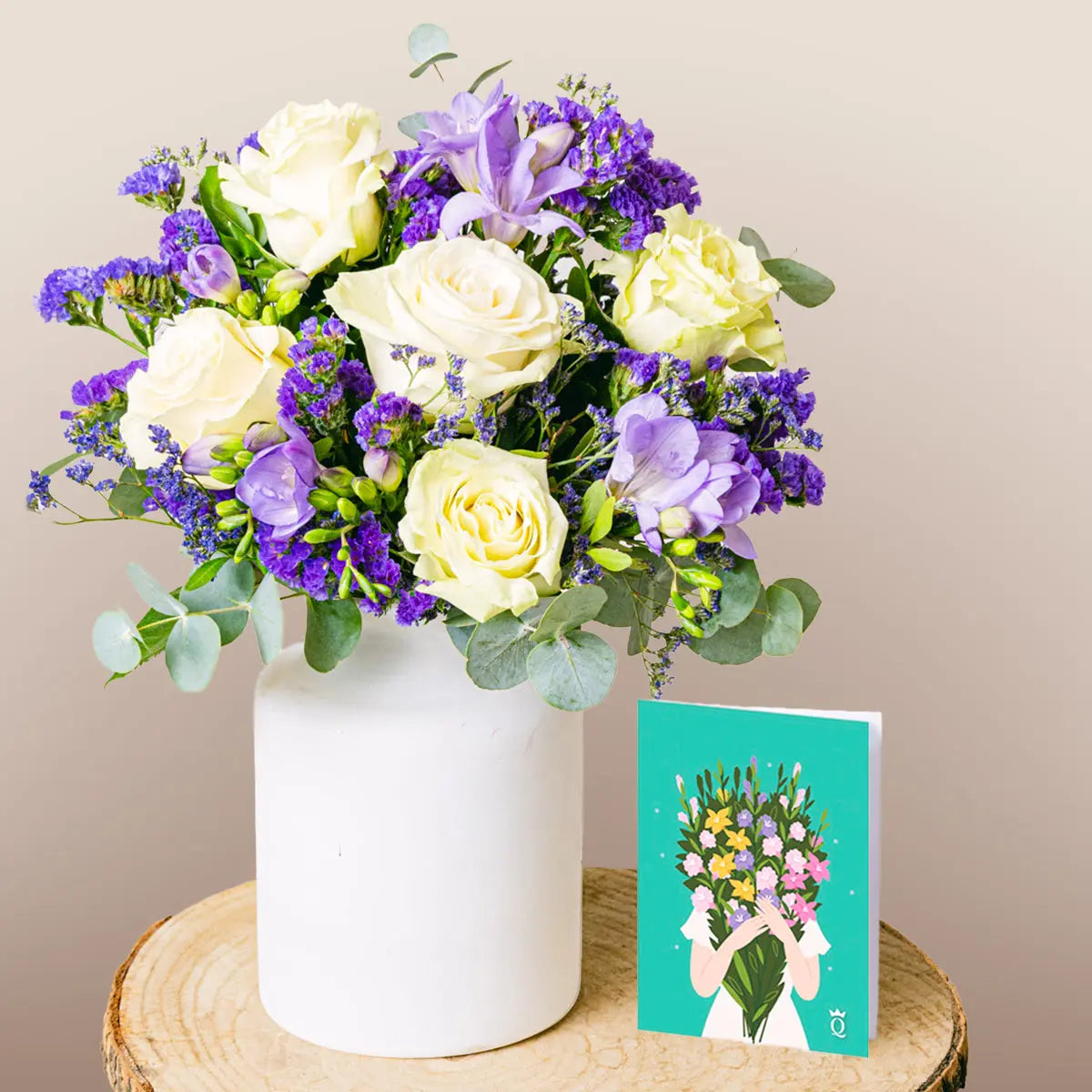 Découvrez le coffret « Touche d'Élégance », qui comprend le bouquet « Beauté Élégante », une magnifique association de roses blanches, de freesias et de limonium violet, un vase blanc et une carte. Ce coffret est conçu pour exprimer sophistication et délicatesse, un cadeau qui témoigne de votre appréciation pour la personne spéciale que vous souhaitez surprendre. Un cadeau unique, disponible pour une durée limitée !
