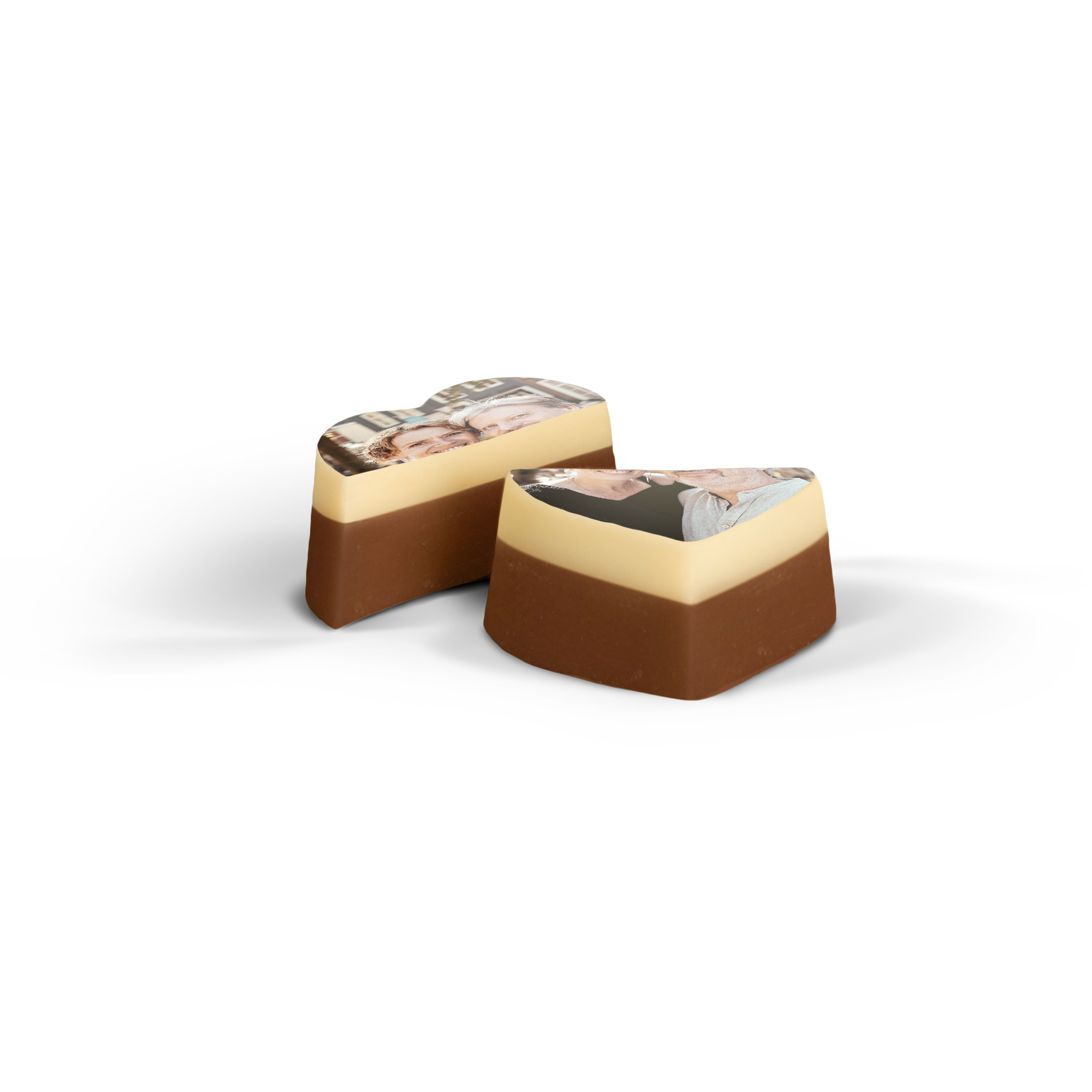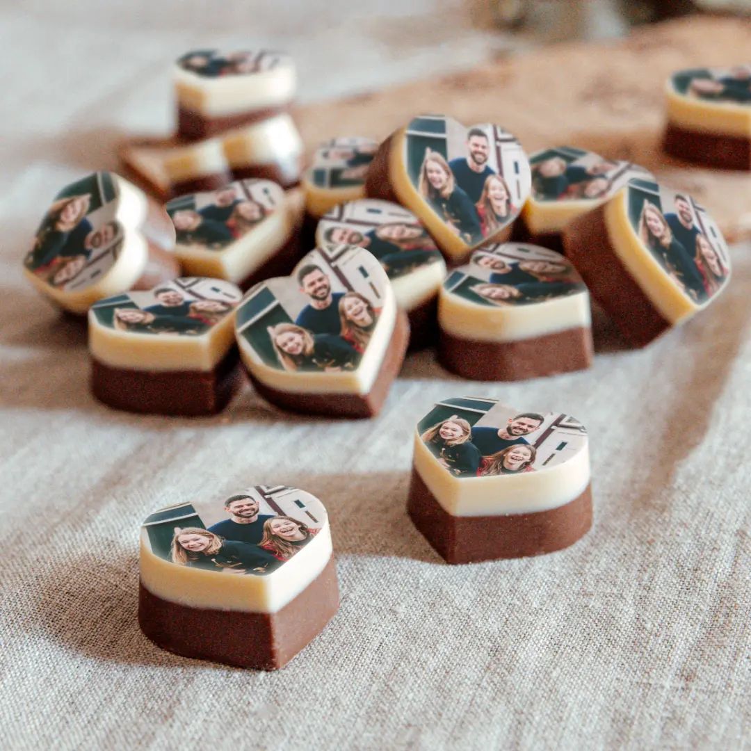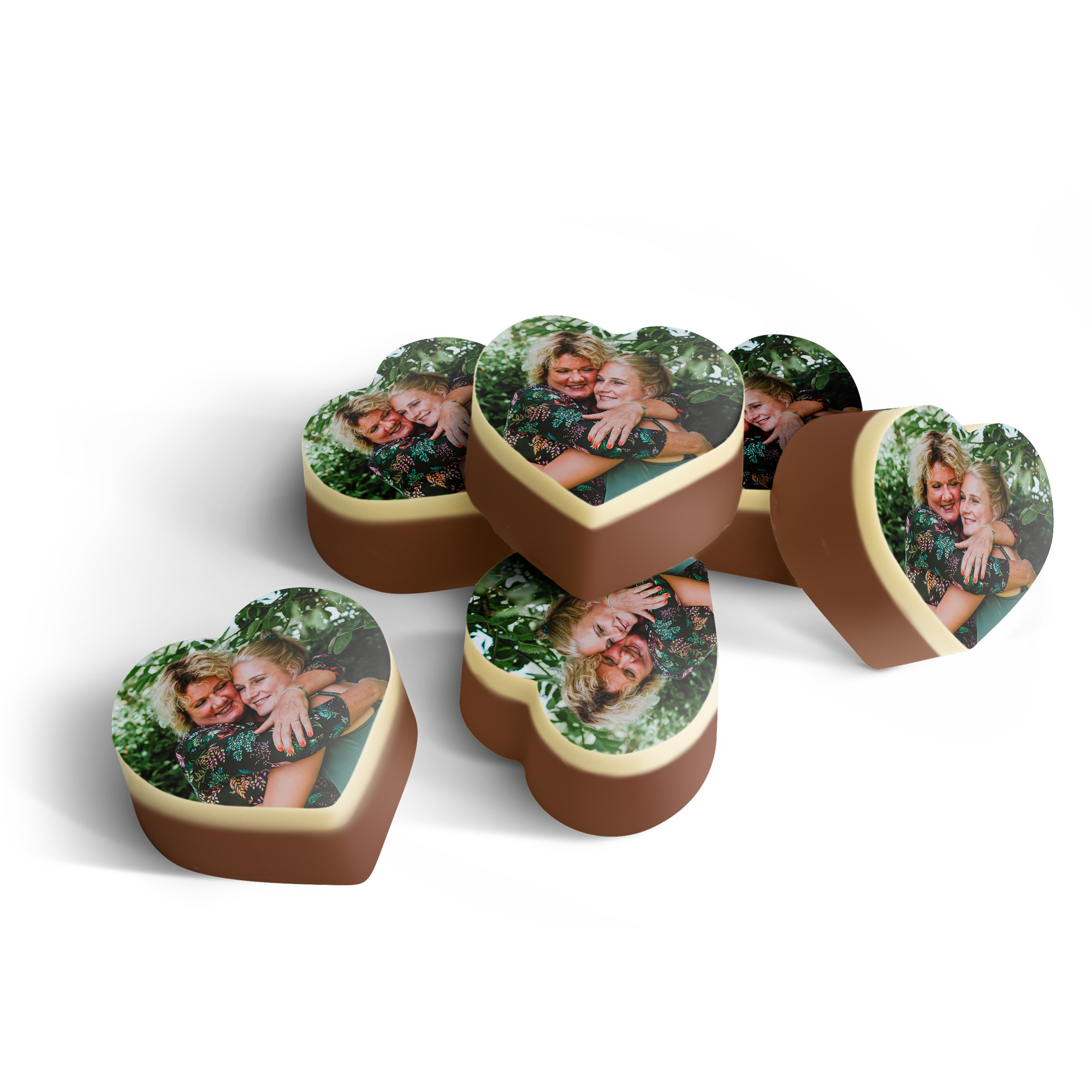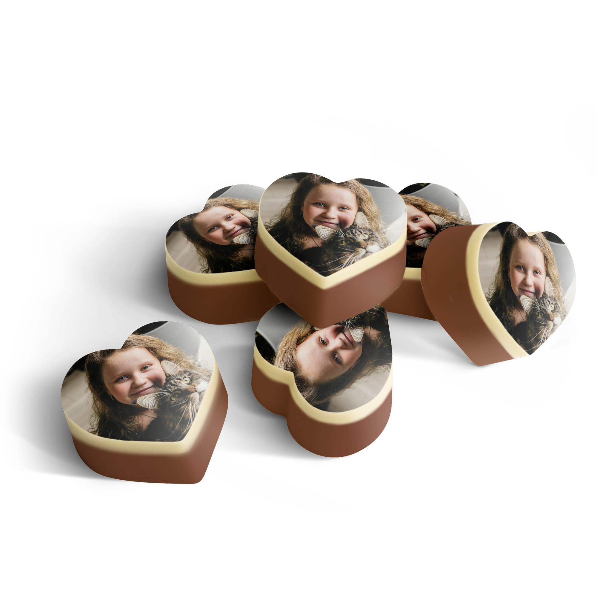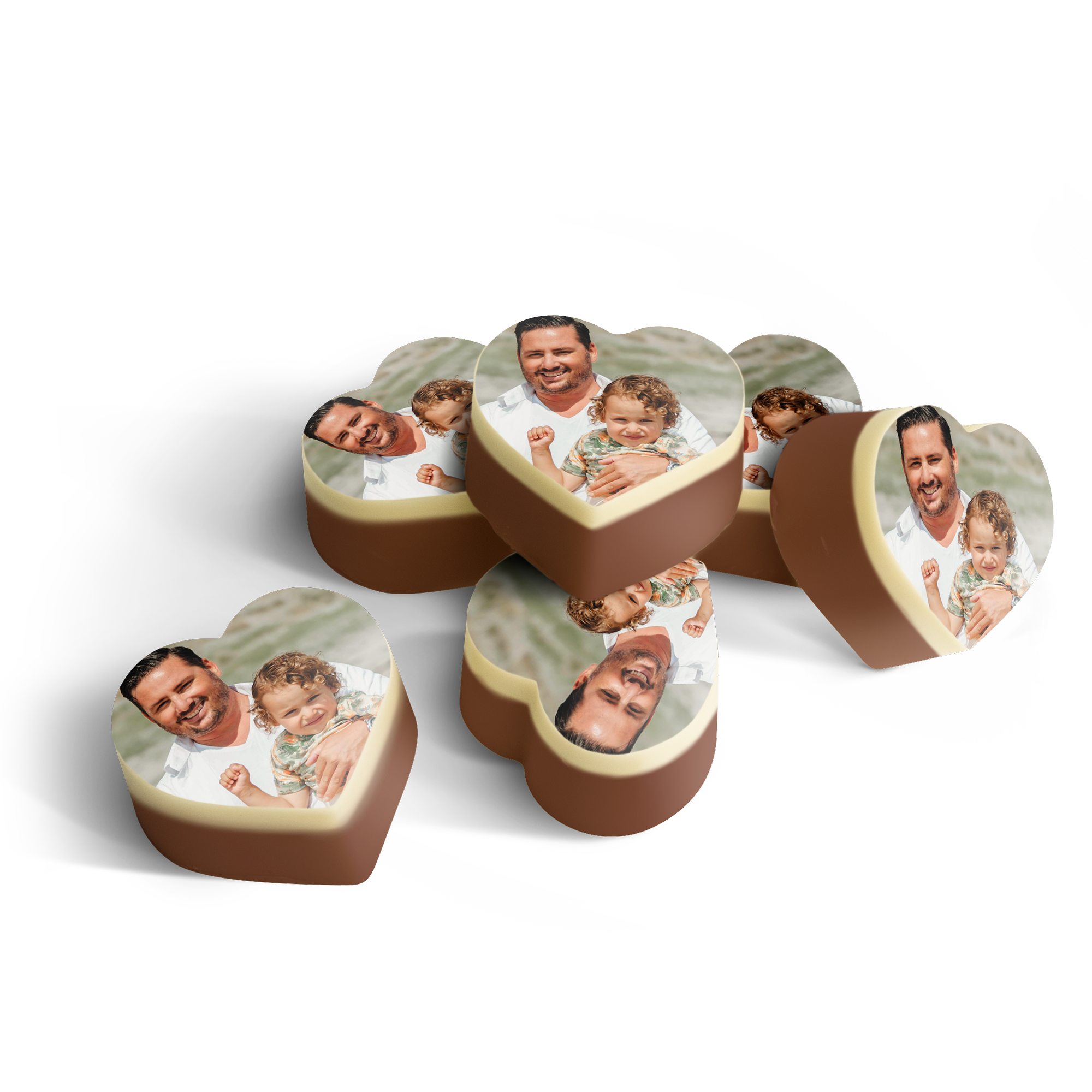 Plus d'informations sur les chocolats solides personnalisés en forme de cœur : - Quantité : lot de 12 chocolats - Chocolat : chocolat au lait recouvert d'une couche de chocolat blanc - Forme : en forme de cœur - Dimensions par chocolat : 32 x 30 mm, pouvant varier légèrement d'un chocolat à l'autre - Personnalisation : impression photo ou logo - Impression : impression comestible en couleur - Pour les températures supérieures ou égales à 25 °C, nous vous conseillons d'ajouter un élément réfrigérant à votre commande.