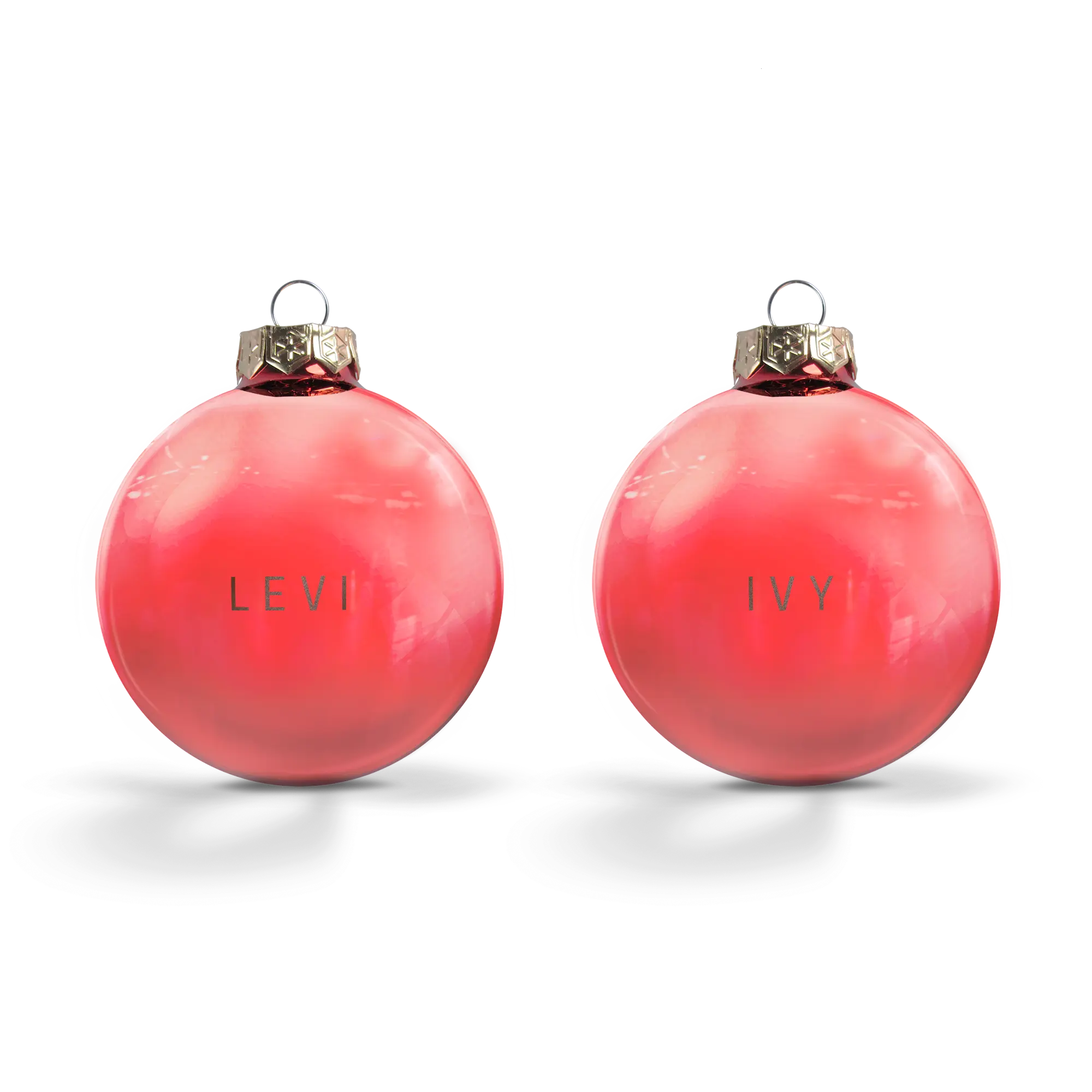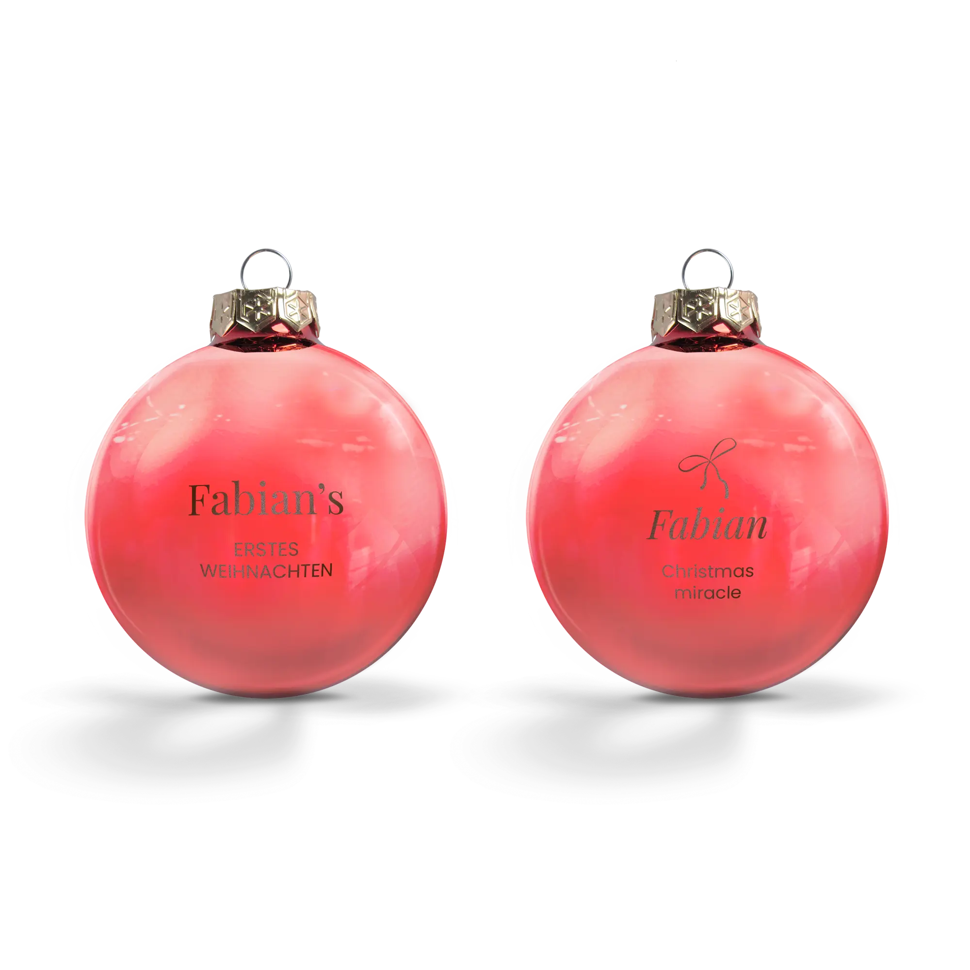 Plus d'informations sur les boules de Noël en verre : Quantité : lot de 2 Taille : Ø 8 cm Matériau : verre brillant de haute qualité (non transparent) Couleurs : or, argent et rouge Personnalisation : avec un nom et/ou un texte Gravure : technique laser de haute précision Emplacement : au milieu de la boule sur une seule face Couronne : dorée avec ficelle