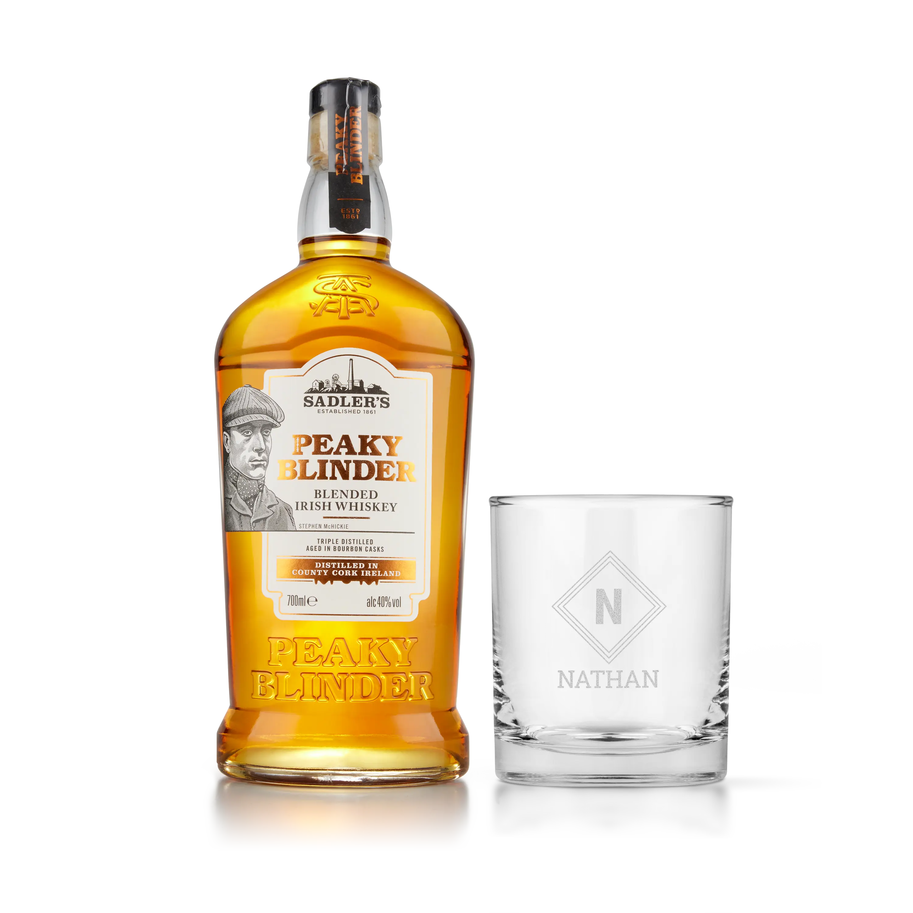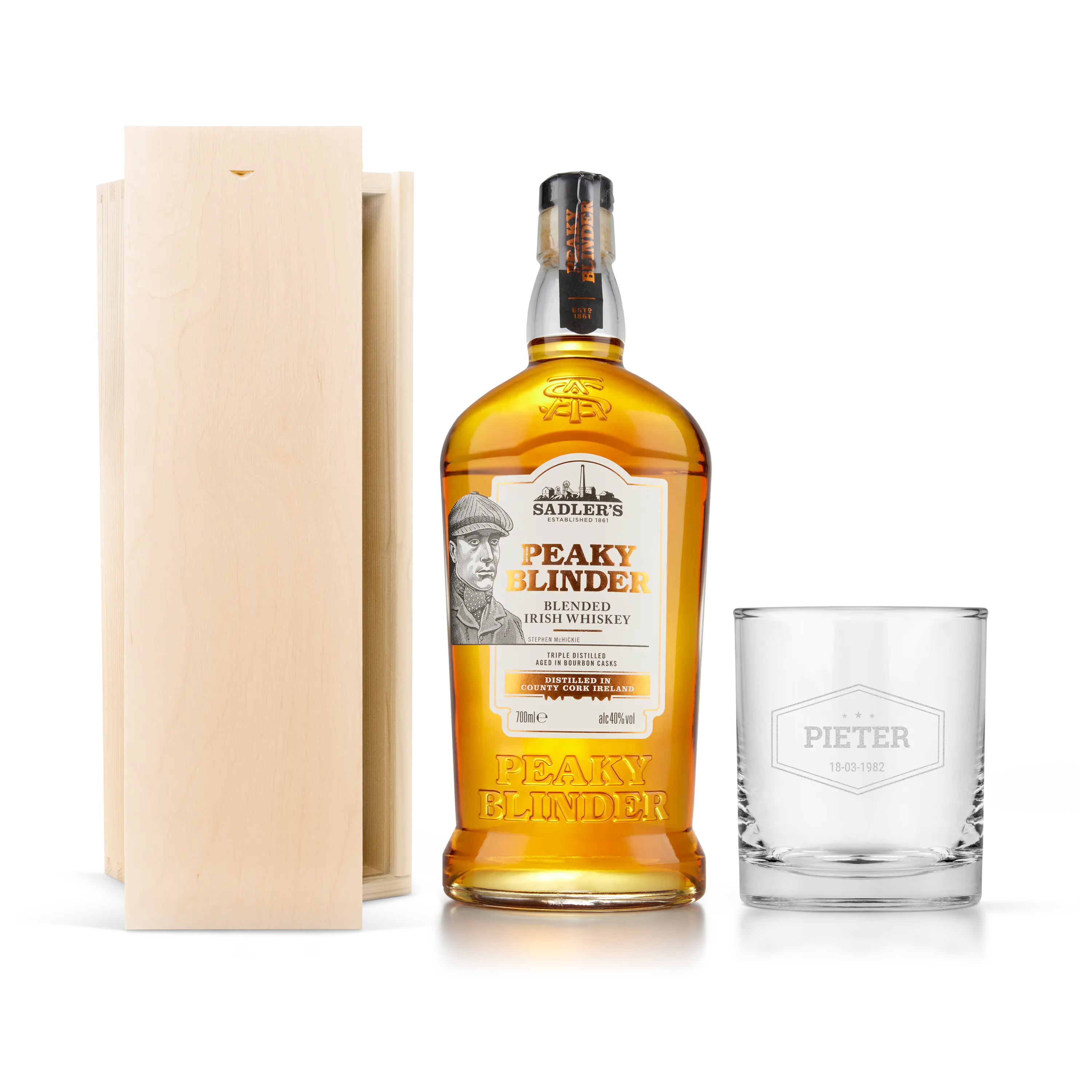 Plus d'informations sur la personnalisationPersonnalisation : avec nom ou texte Finition : gravure laser sur verre de haute qualité Couleur de la gravure : blanc Dimensions de la boîte : 36,5 x 12 x 11 cm Détails : la boîte en bois porte le label FSC Plus de détails sur le whisky Nom : Sadler's Peaky Blinder Type de whisky : blended Contenu : 700 ml Pays : Angleterre Pourcentage d'alcool : 40 % Caractère : Le whisky irlandais Peaky Blinder est triplement distillé et vieilli en fûts de sherry. Il présente des notes de cassis, de pomme et de caramel. Vous pourrez savourer des nuances séduisantes de chocolat, d'abricot et d'orange.